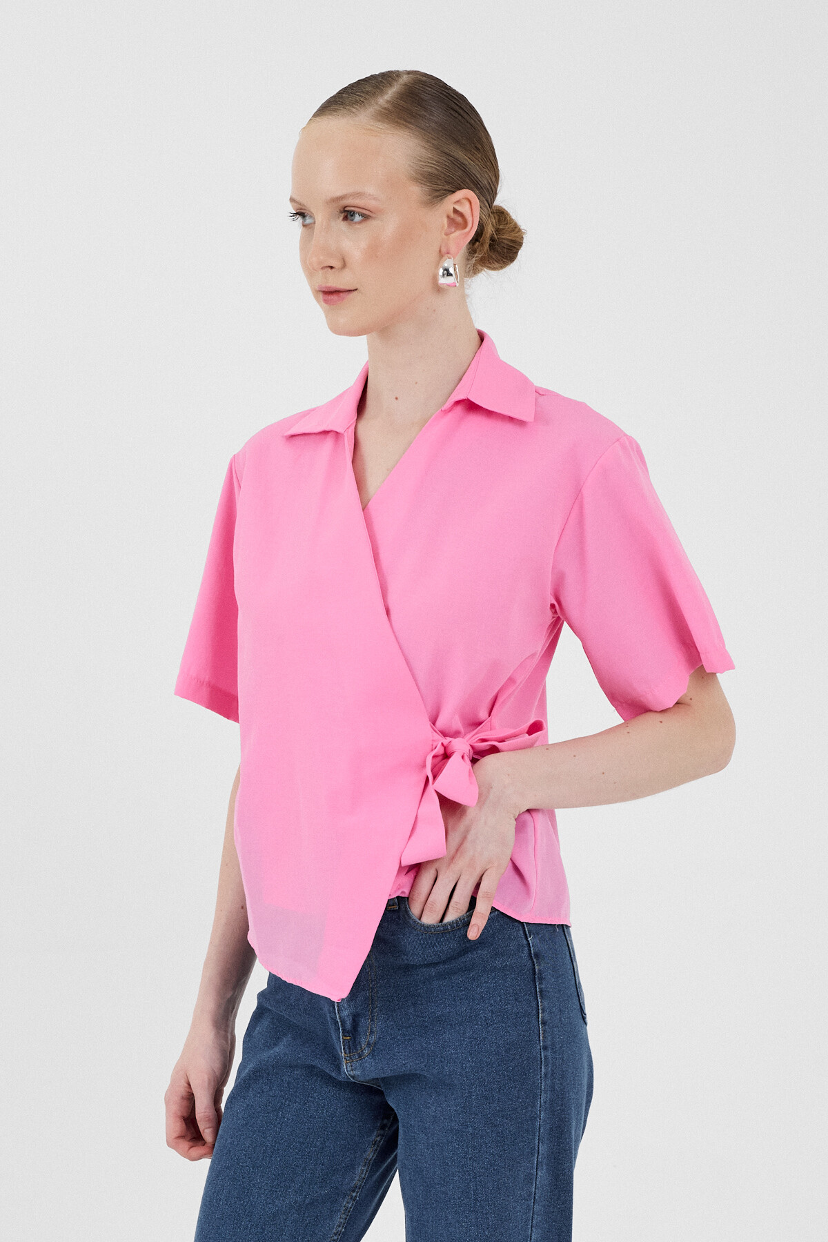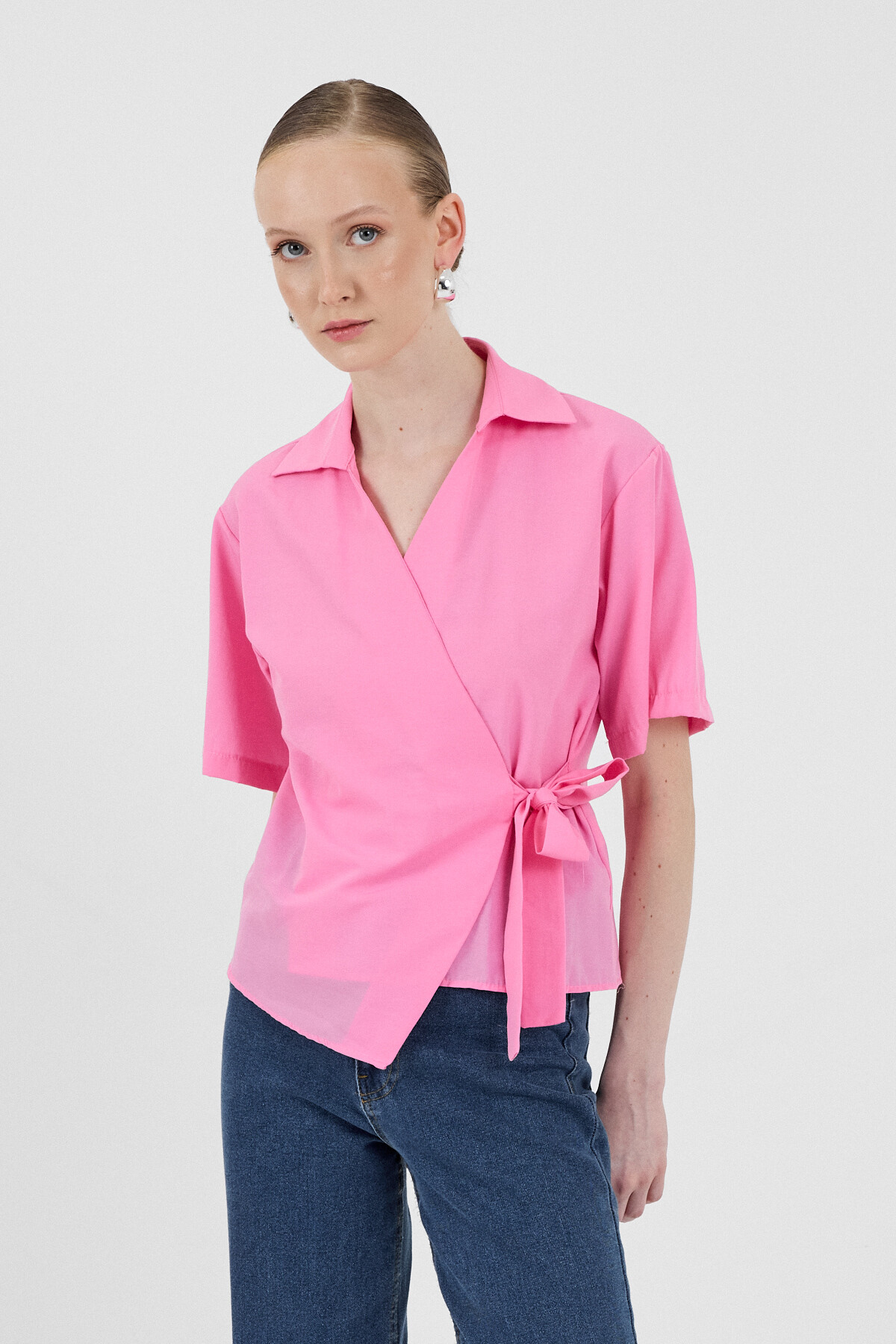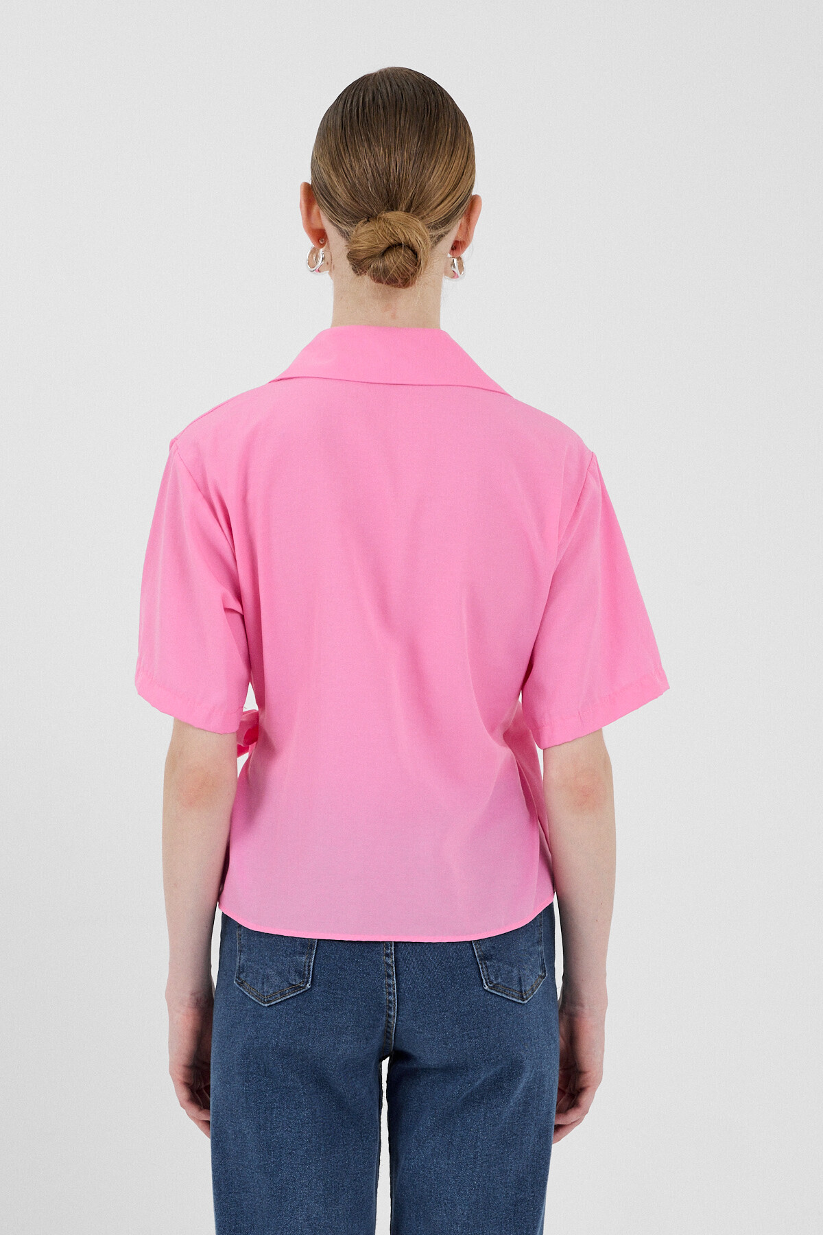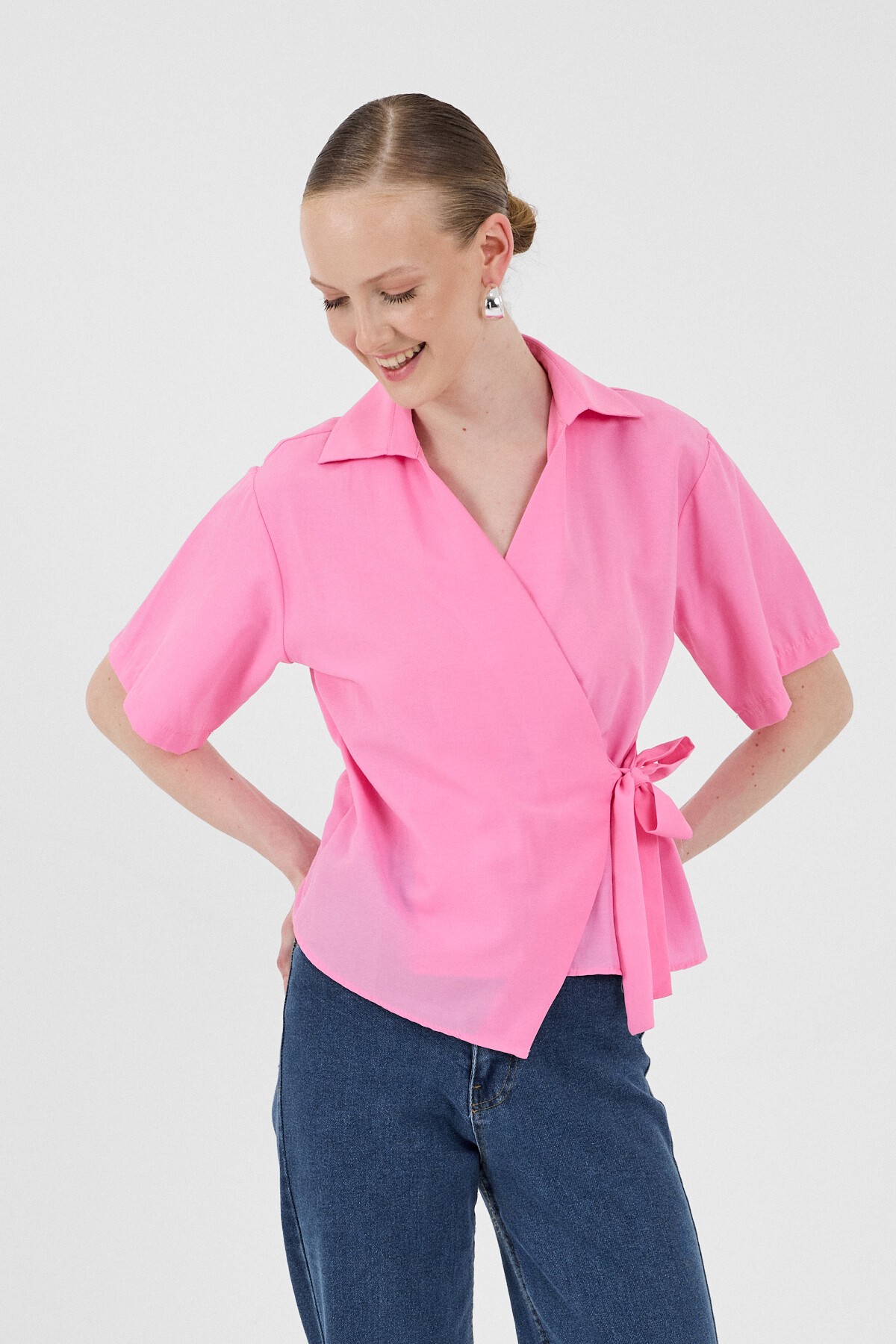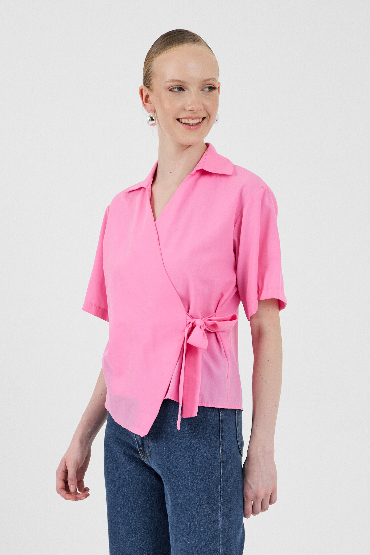 Şeker Pembe Kısa Kol Yan Bağlama Detaylı Bluz 8095A