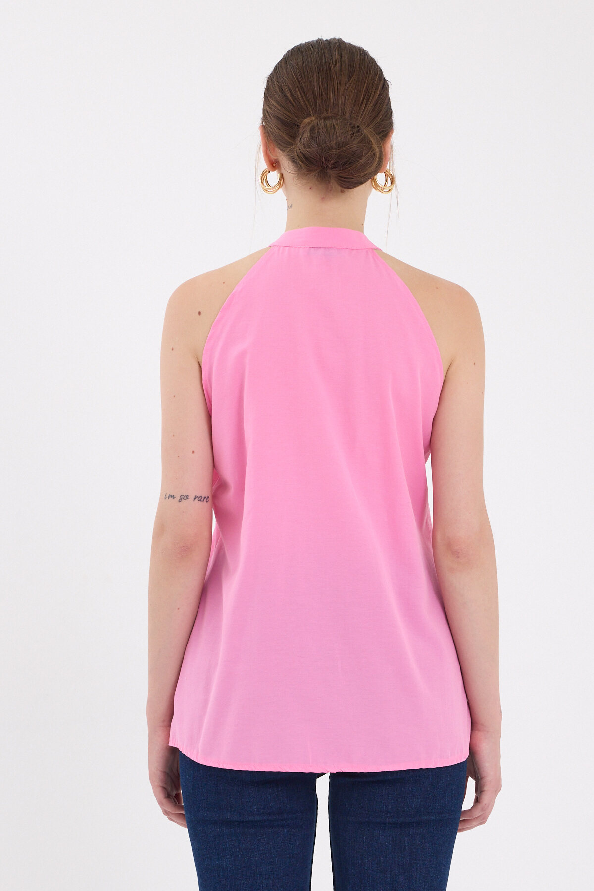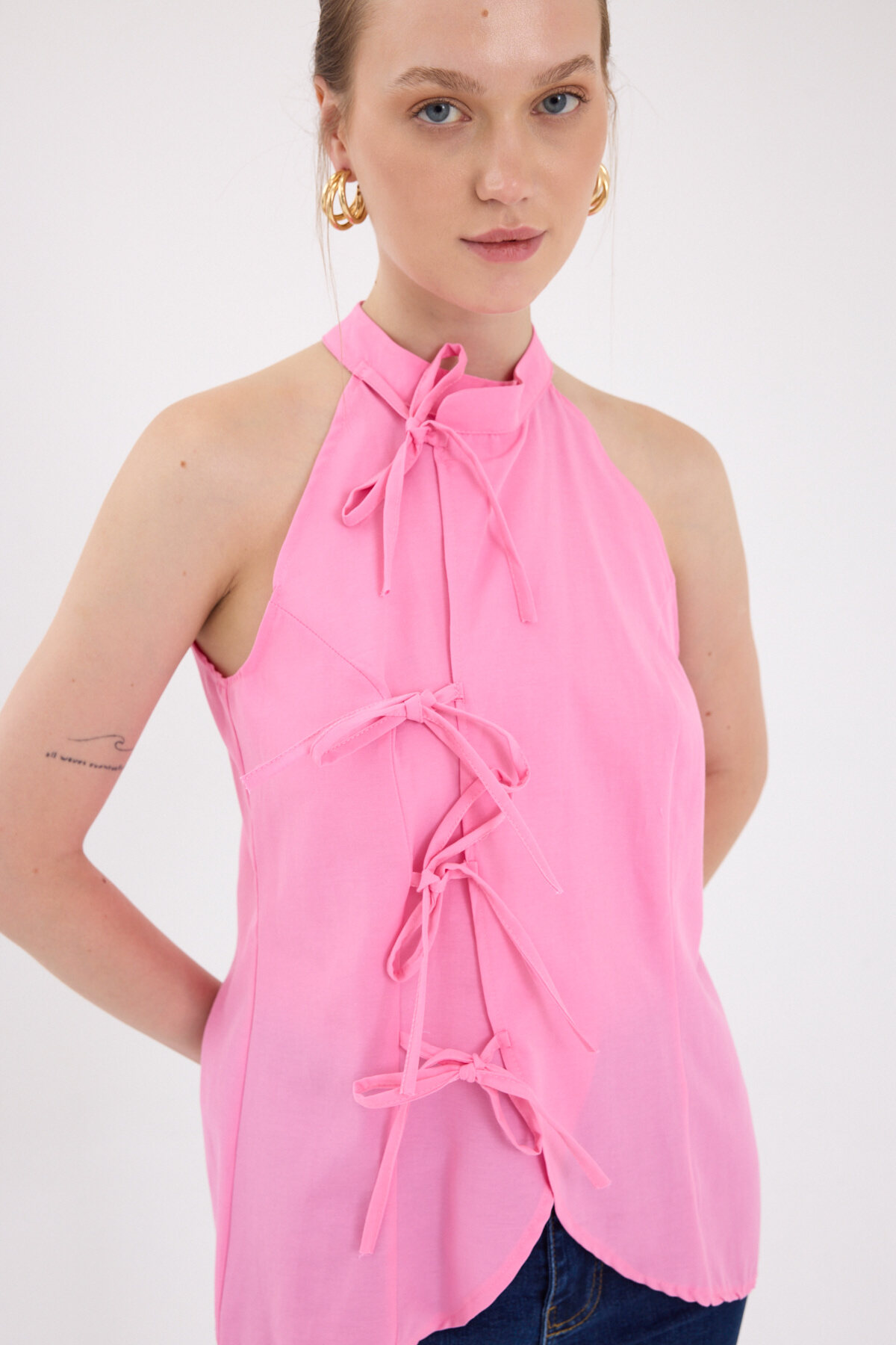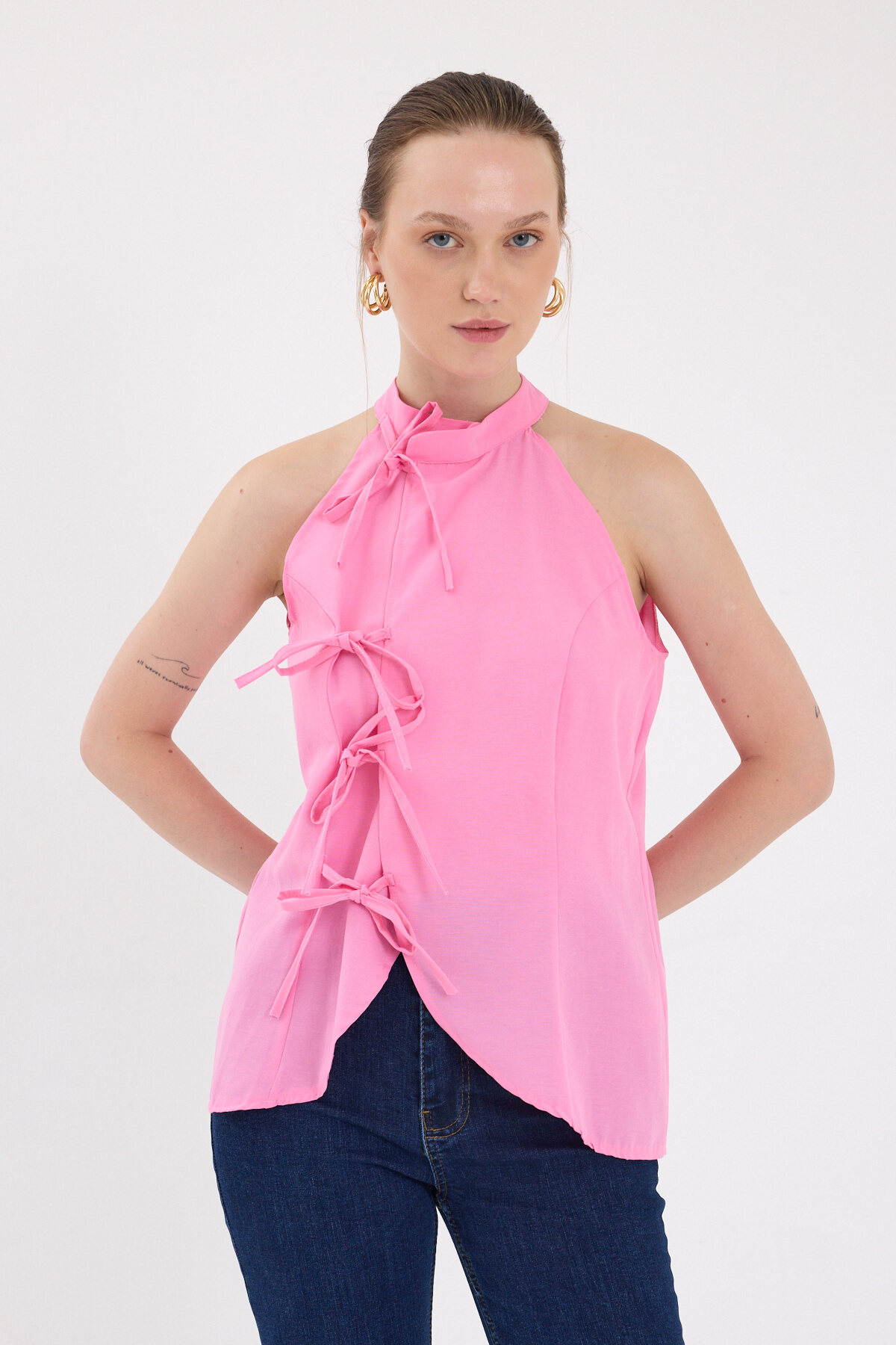 Şeker Pembe Ön Bağlama Detaylı Halter Yaka Bluz 8094A