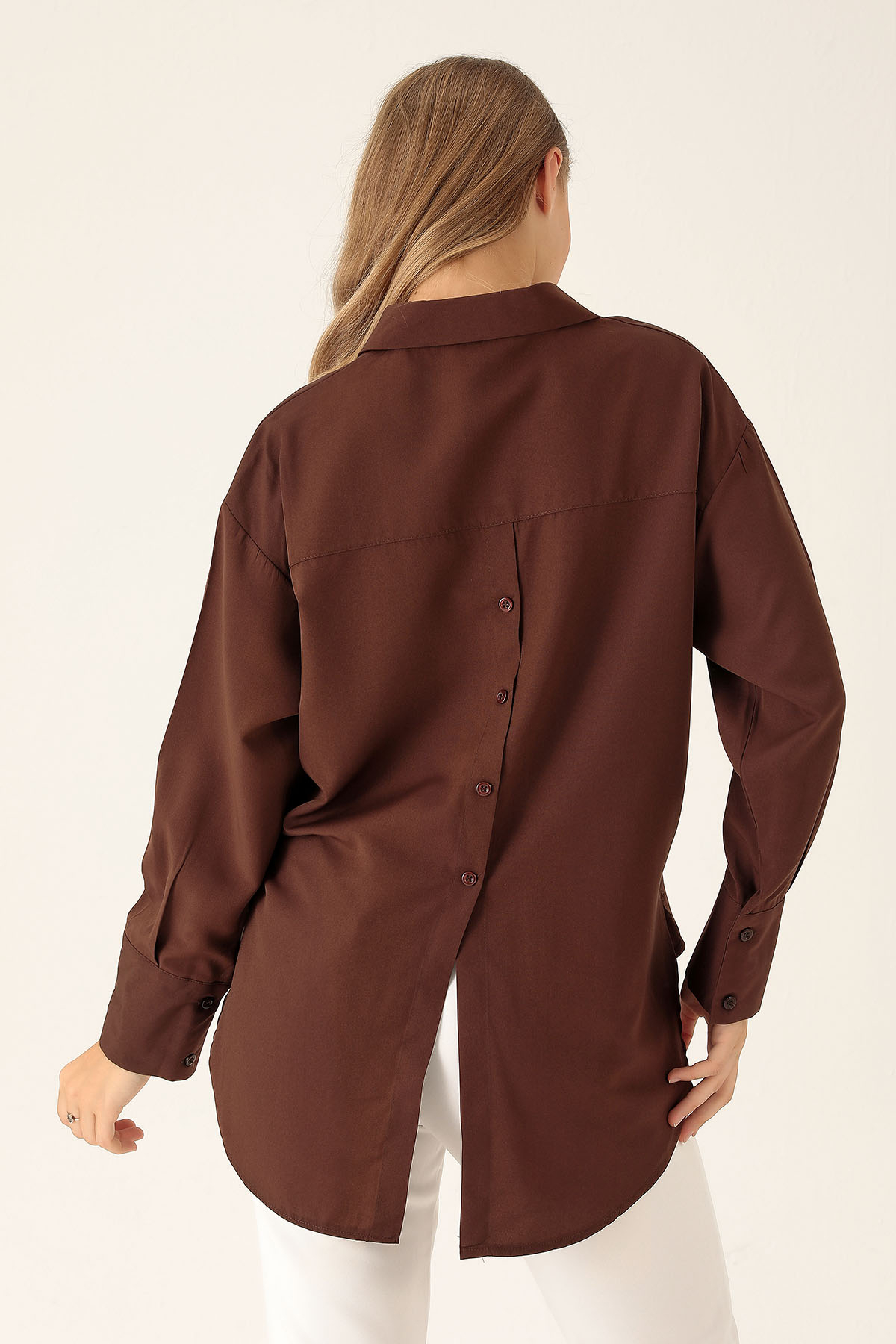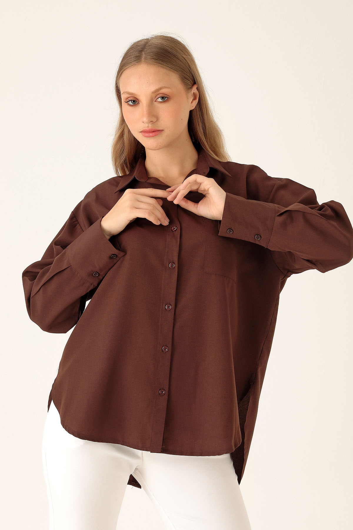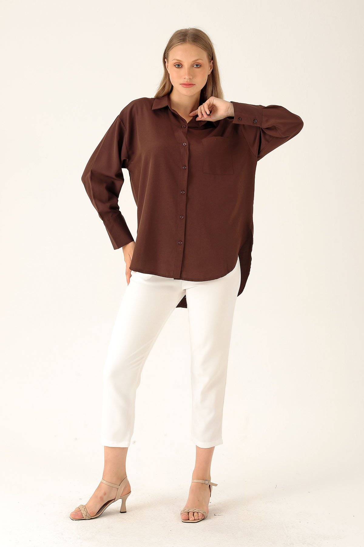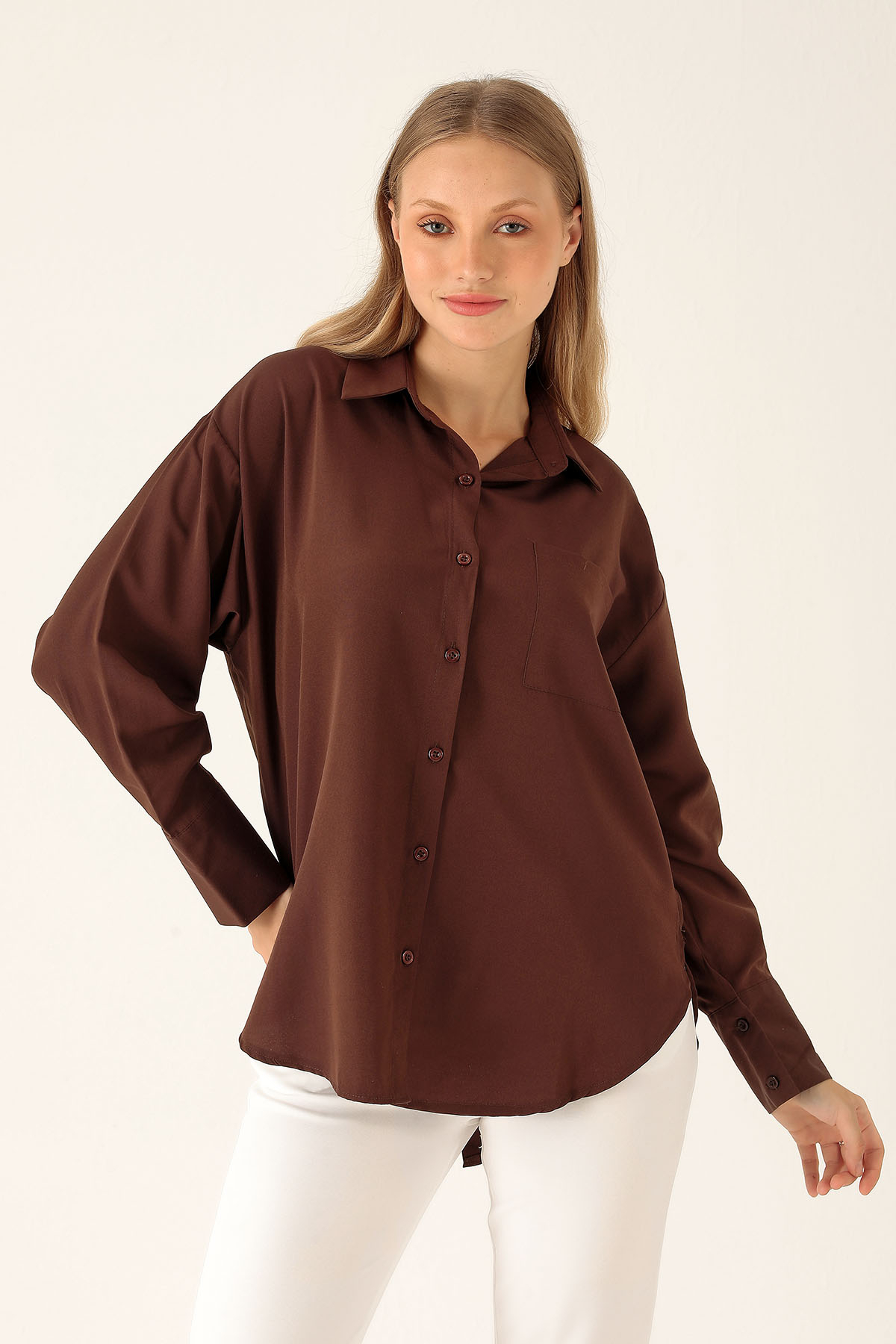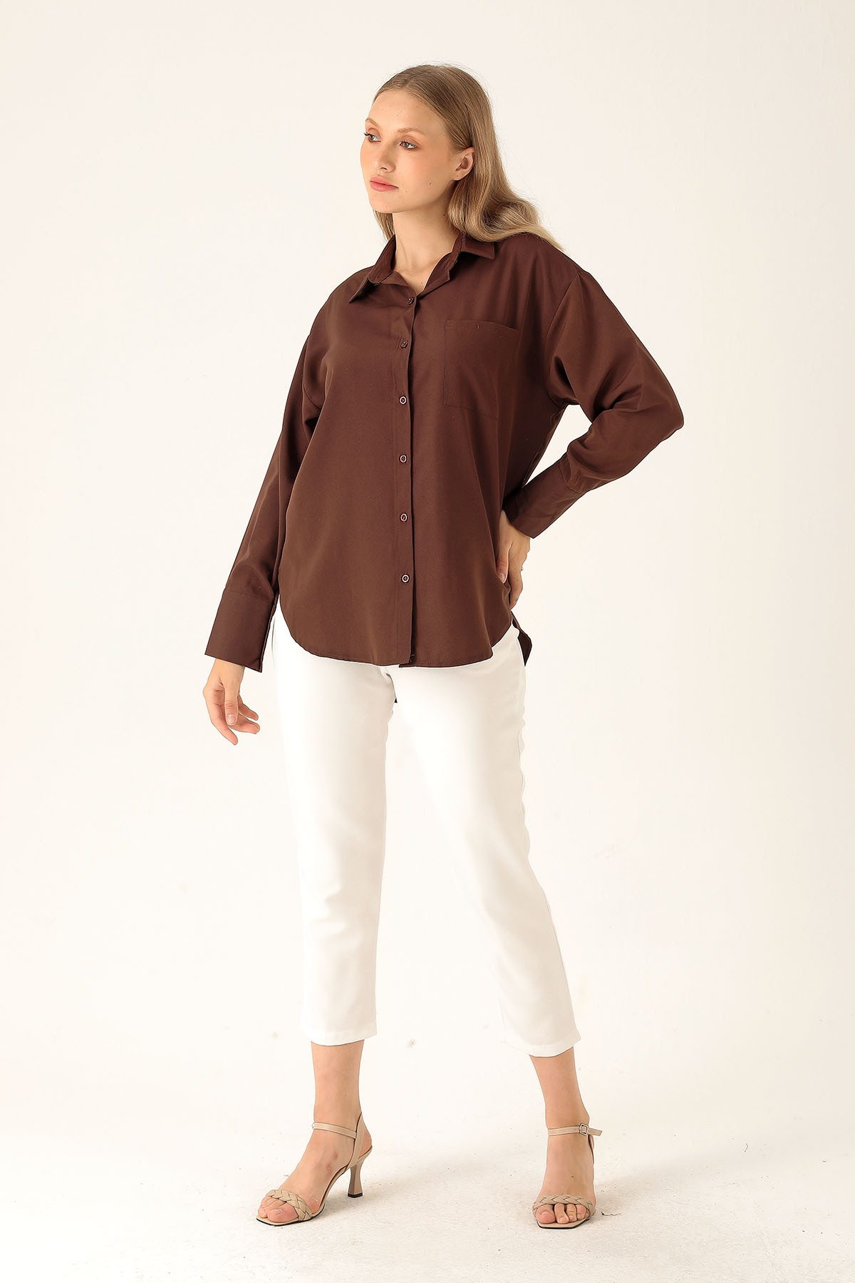 Sırt Düğmeli Tek Cepli Bayan Gömlek - 6500A Kahve