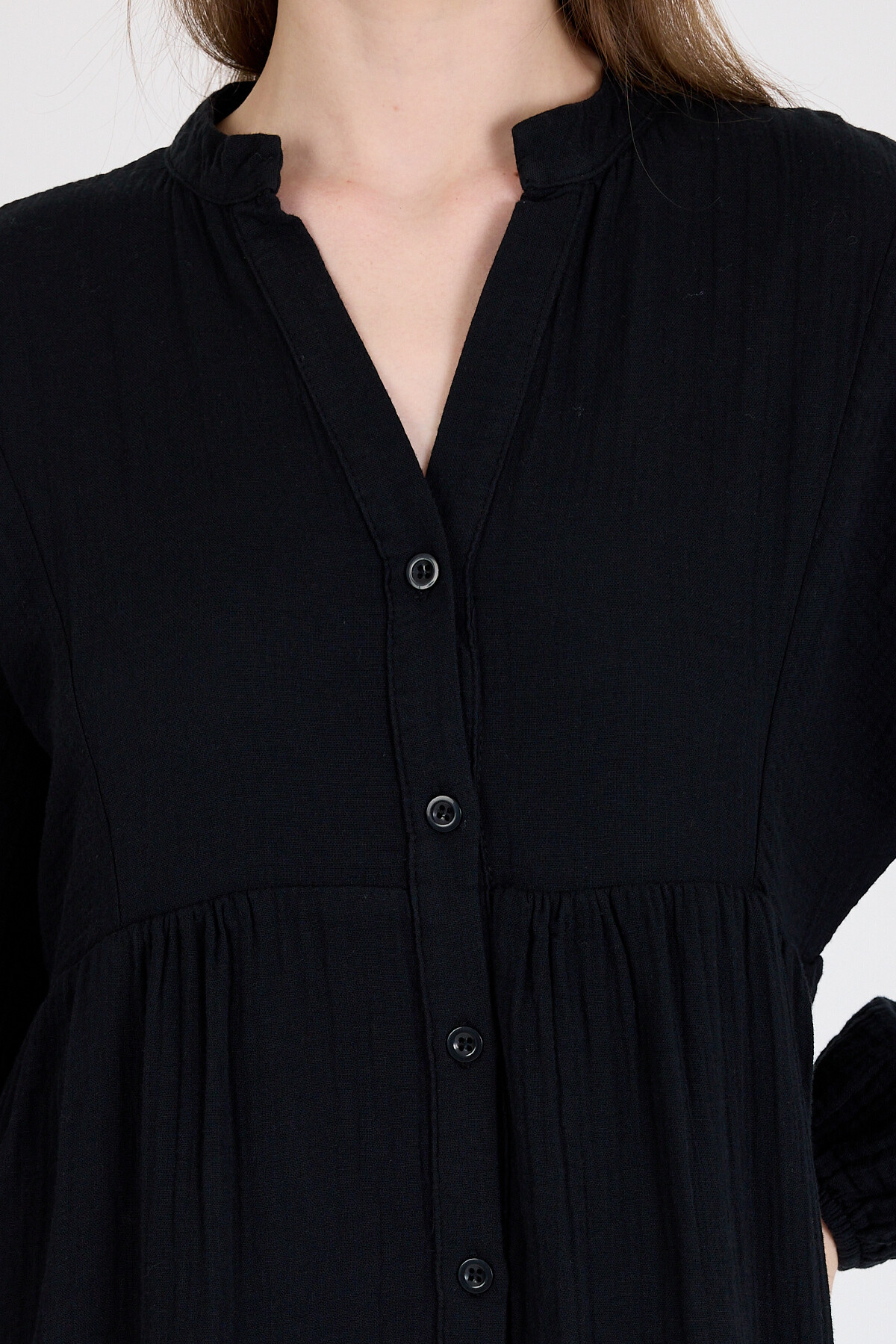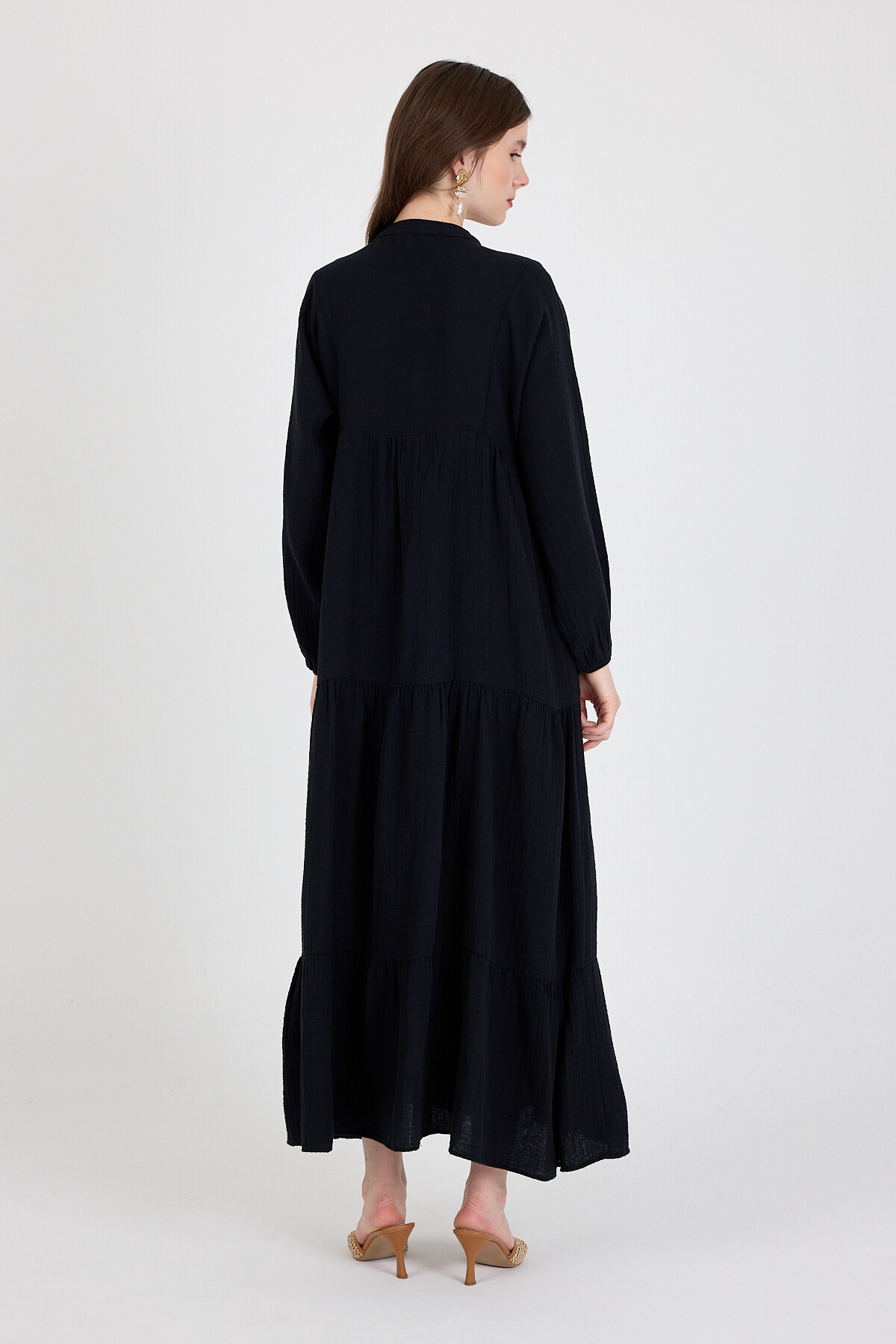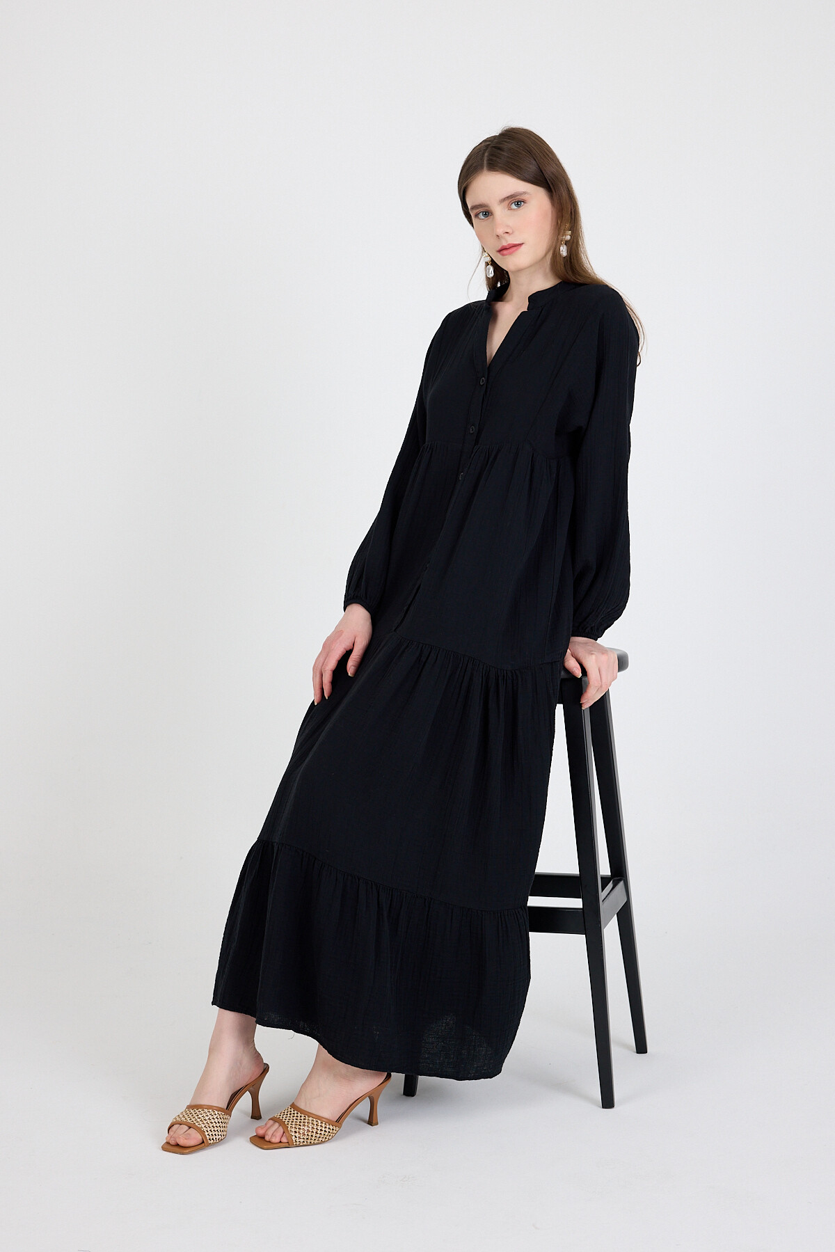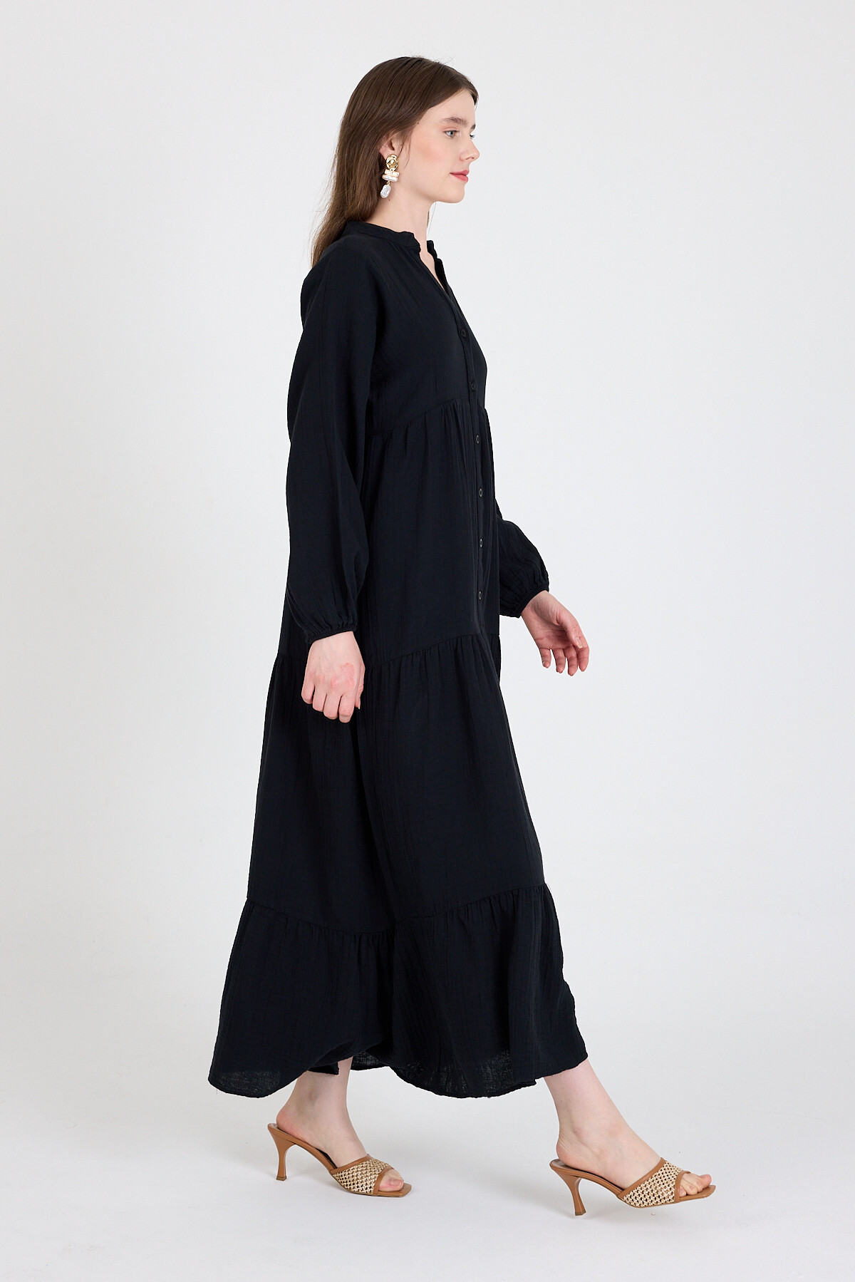 Siyah %100 Pamuk Düğmeli Kat Etekli Uzun Kollu Elbise 4782A