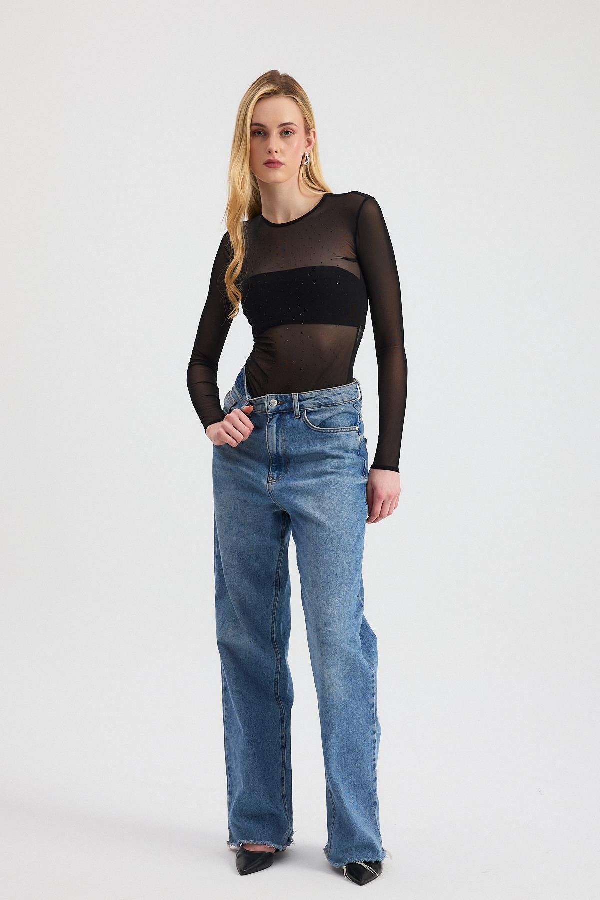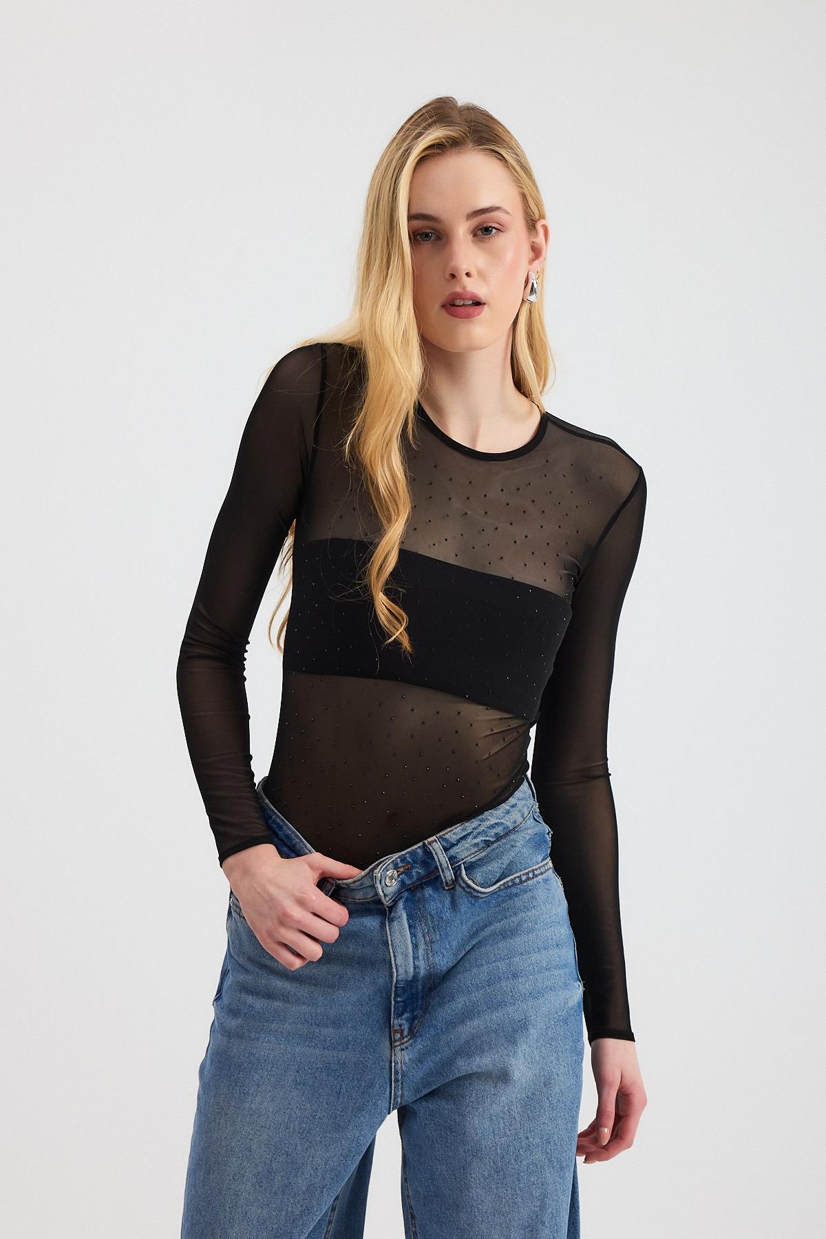 Siyah-2116 Taş Detay Transparan Çıtçıtlı Zıbın Bluz