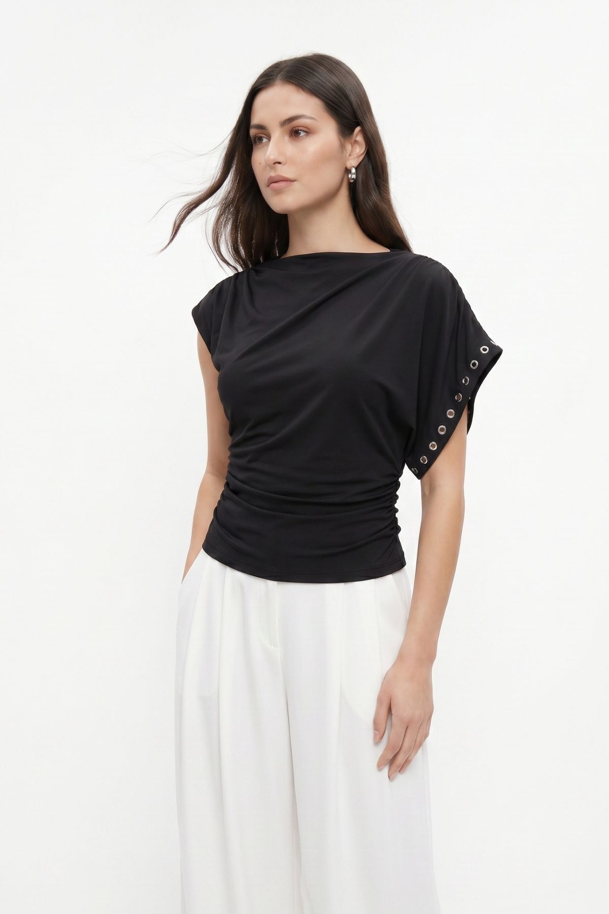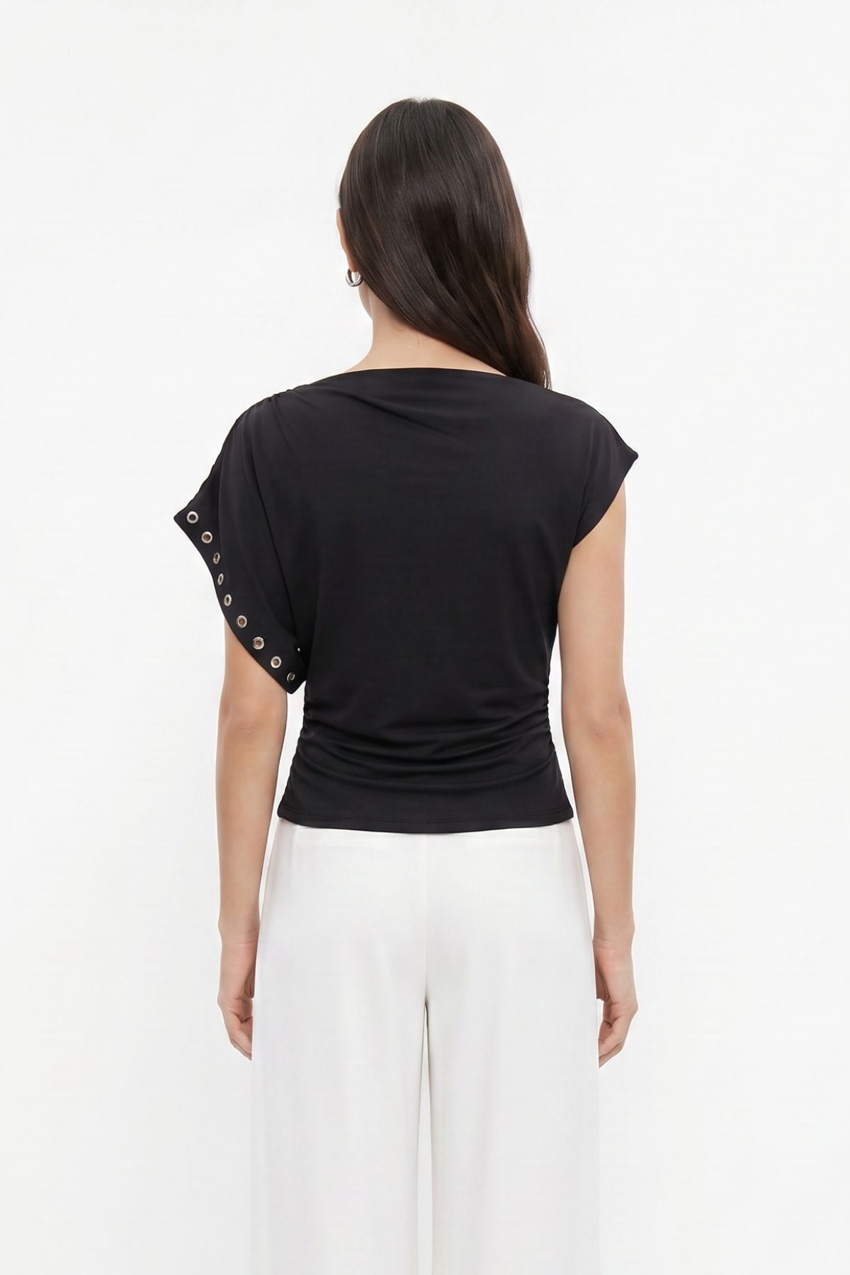 Siyah Asimetrik Kol Zımbalı Bluz 36003