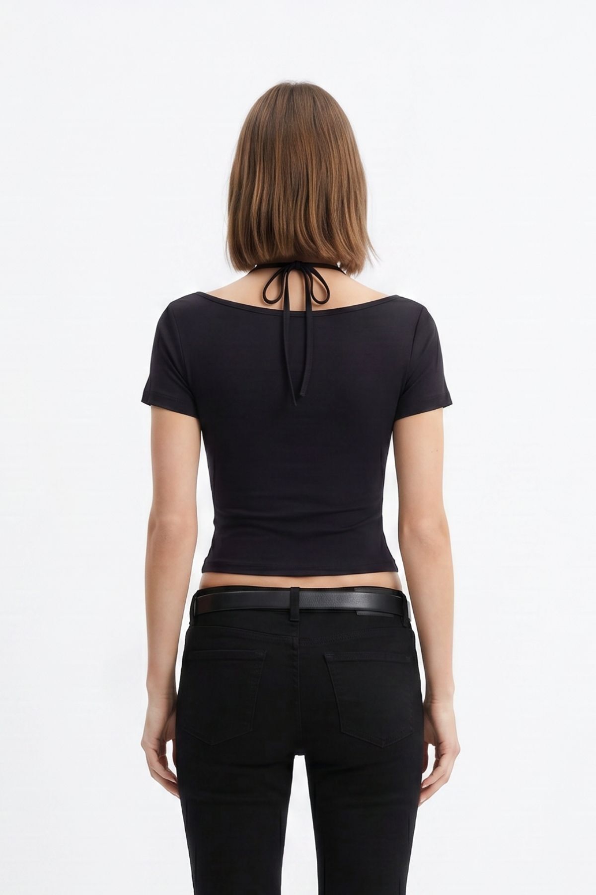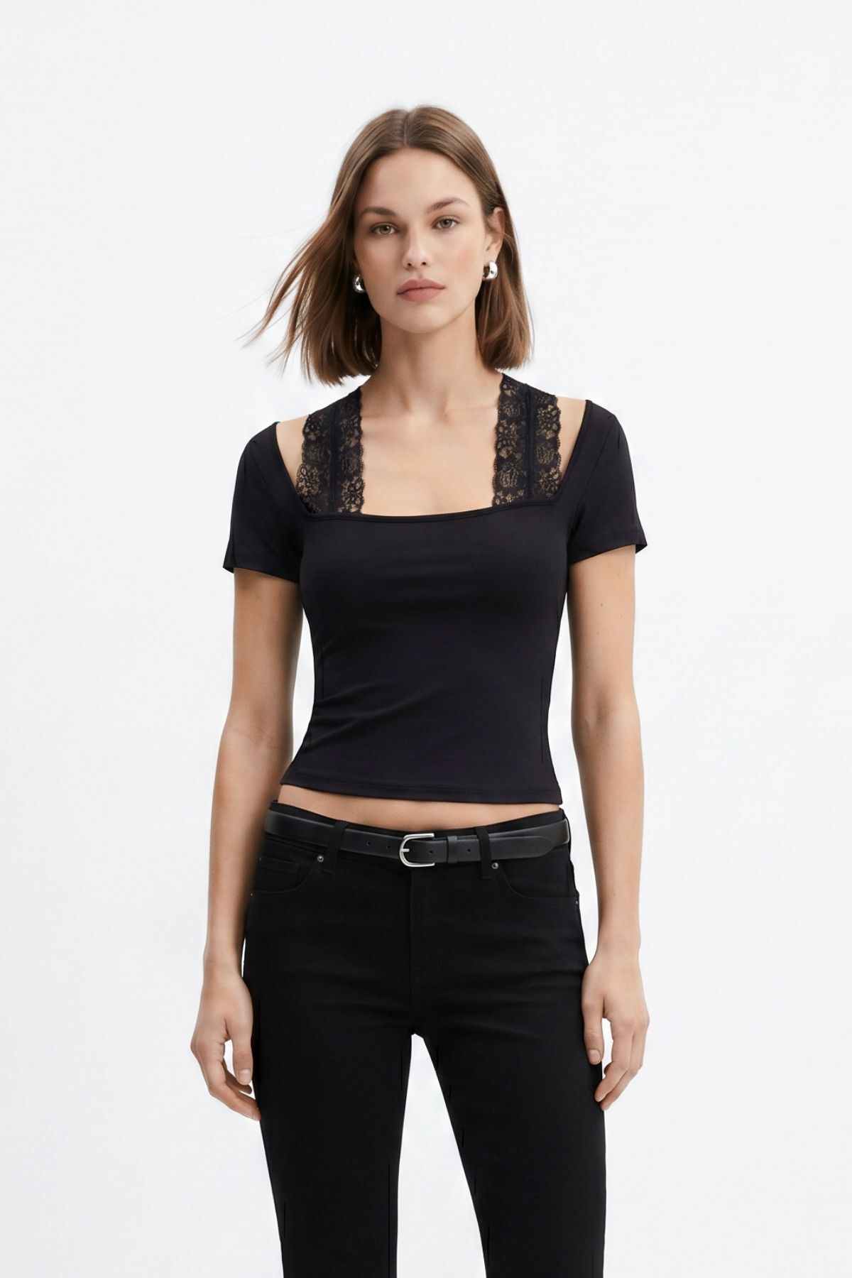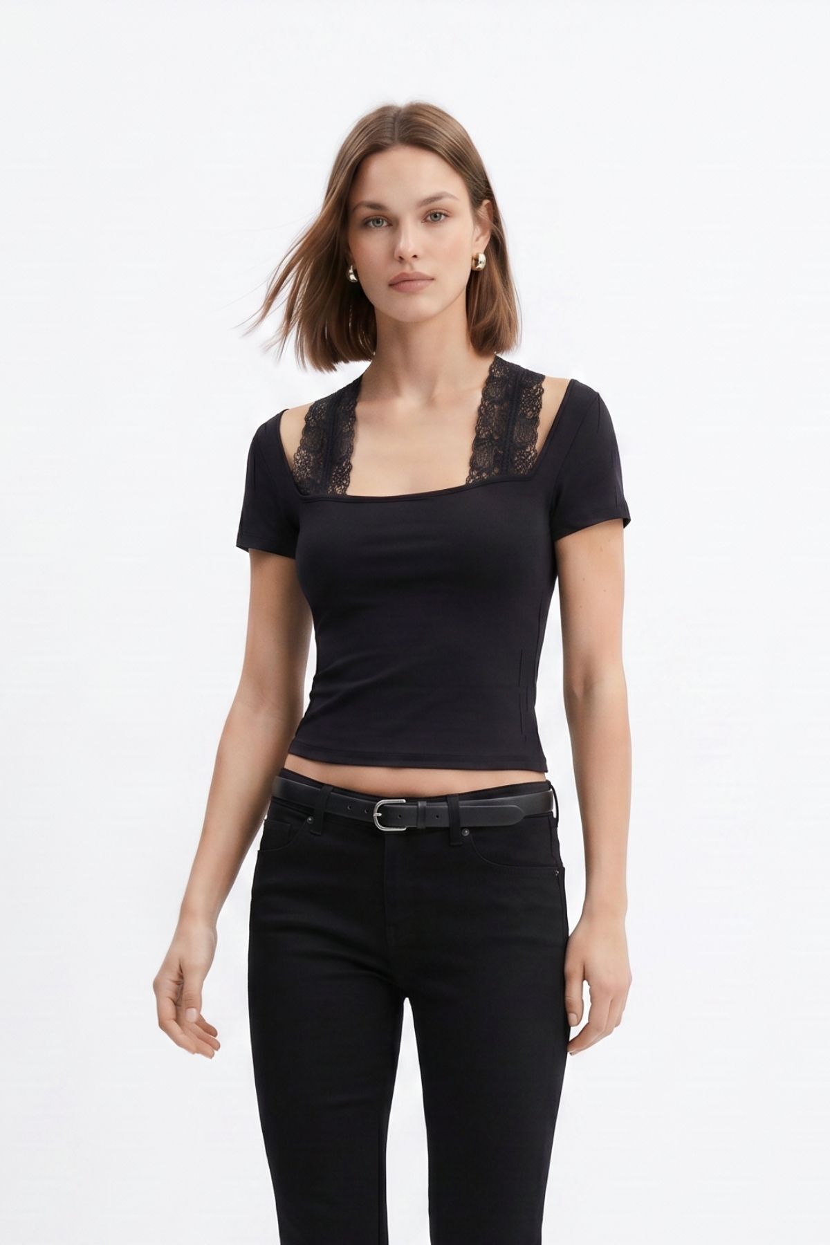 Siyah Bağlamalı Dantelli Kısa Kol Bluz 30007