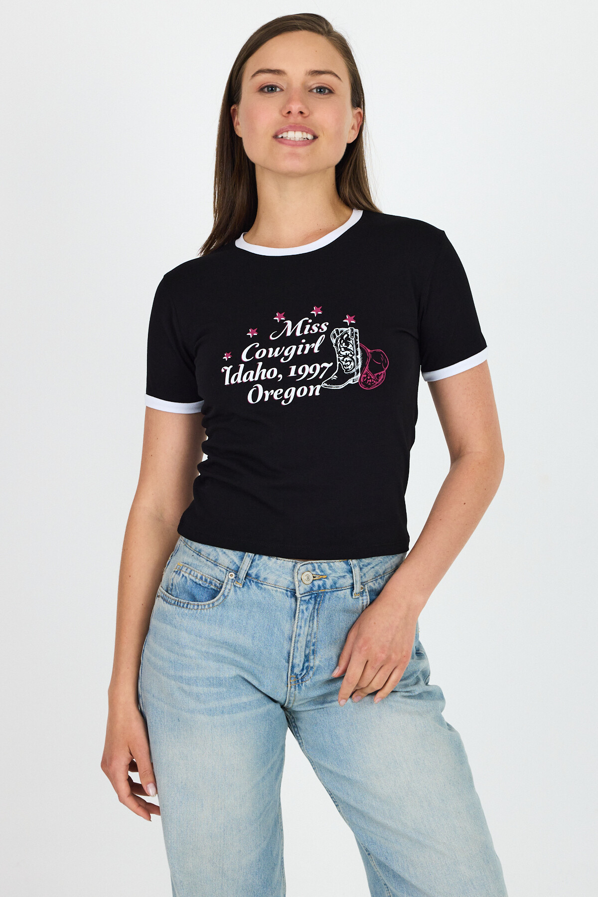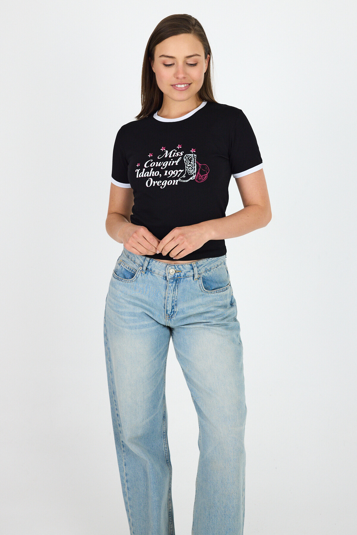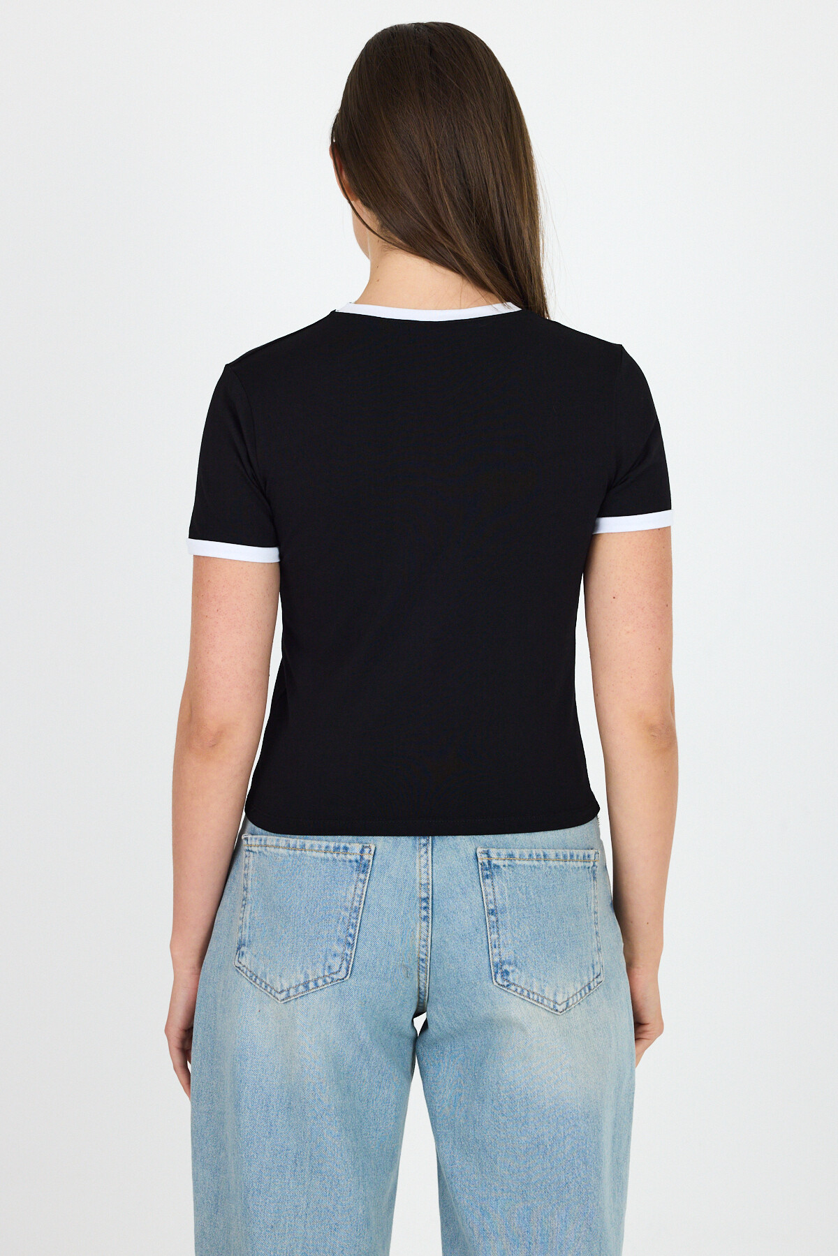 Siyah Baskılı Ribana Detaylı Pamuklu Crop Tişört 9191M
