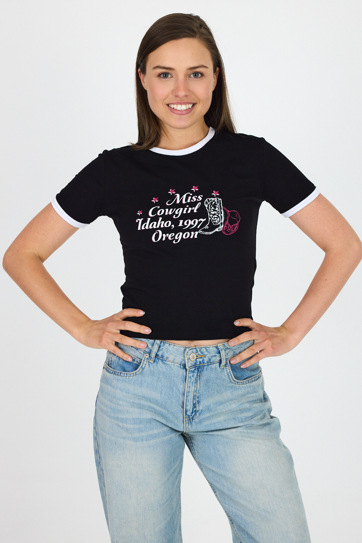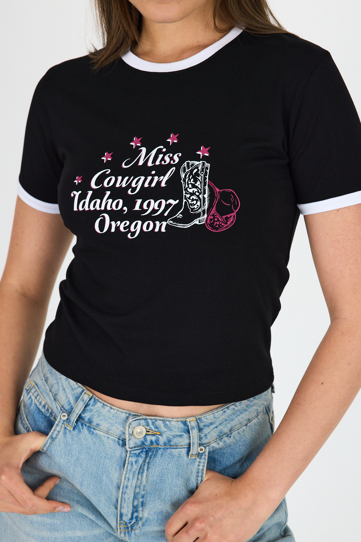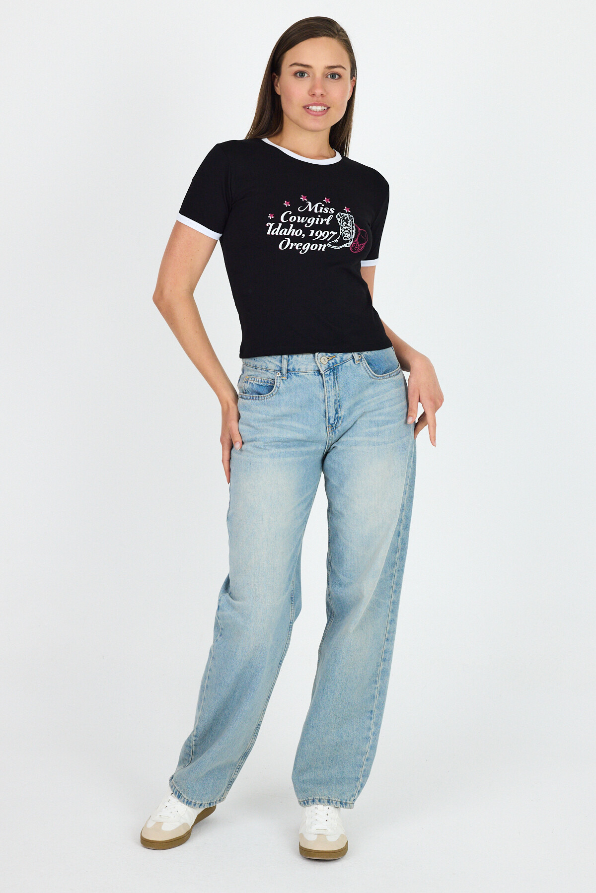 Siyah Baskılı Ribana Detaylı Pamuklu Crop Tişört 9191M