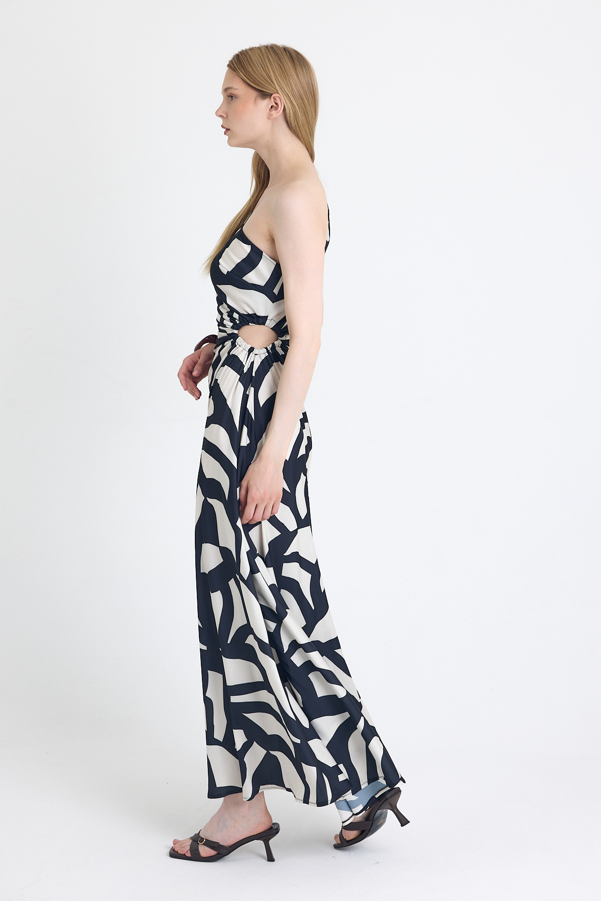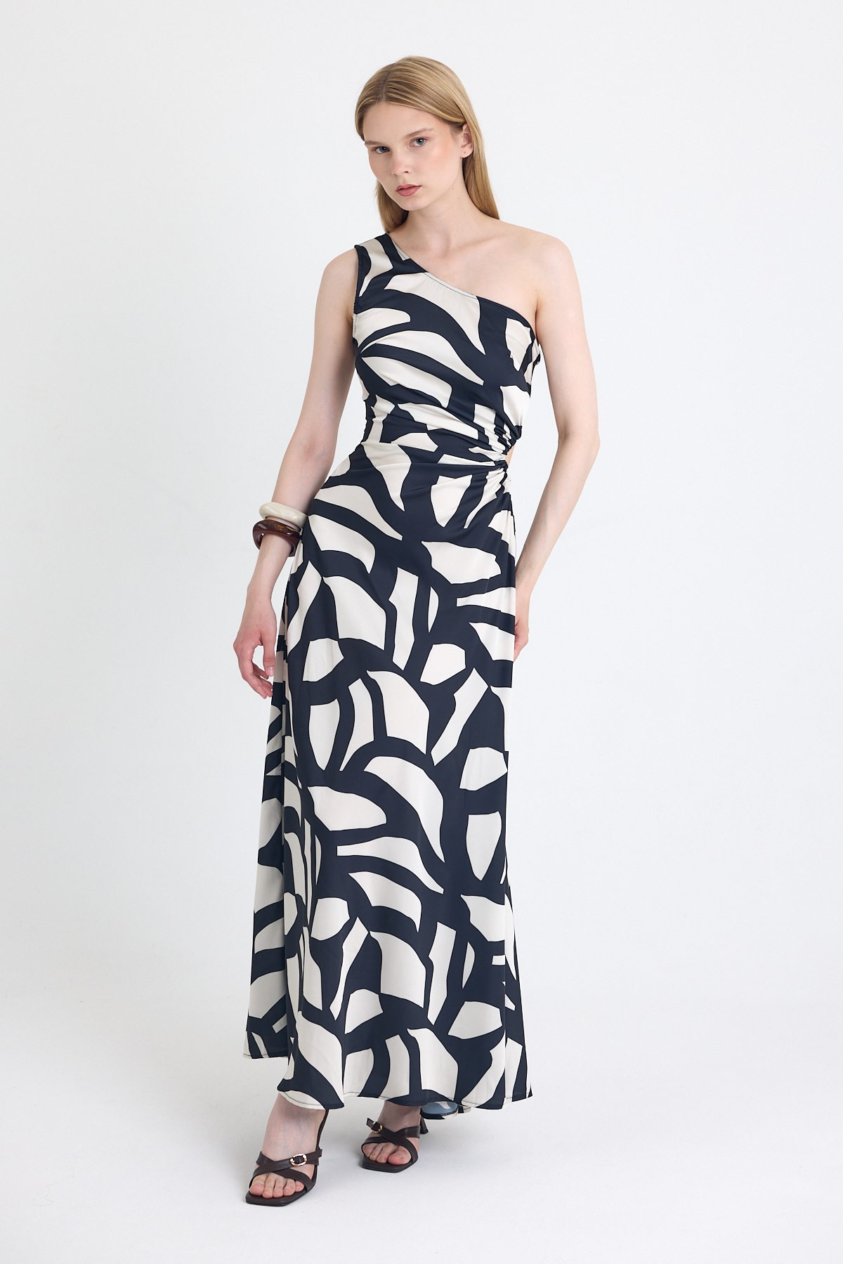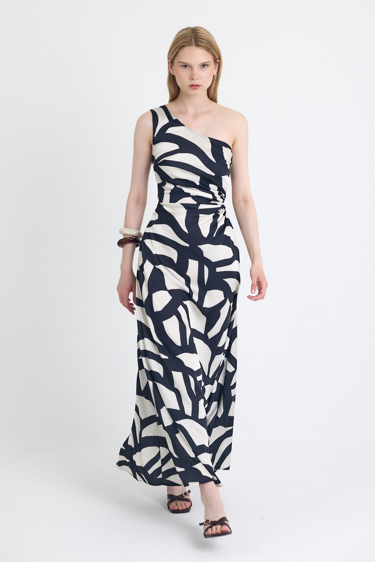 Siyah-Bej Tek Omuz Desenli Maxi Elbise 231660