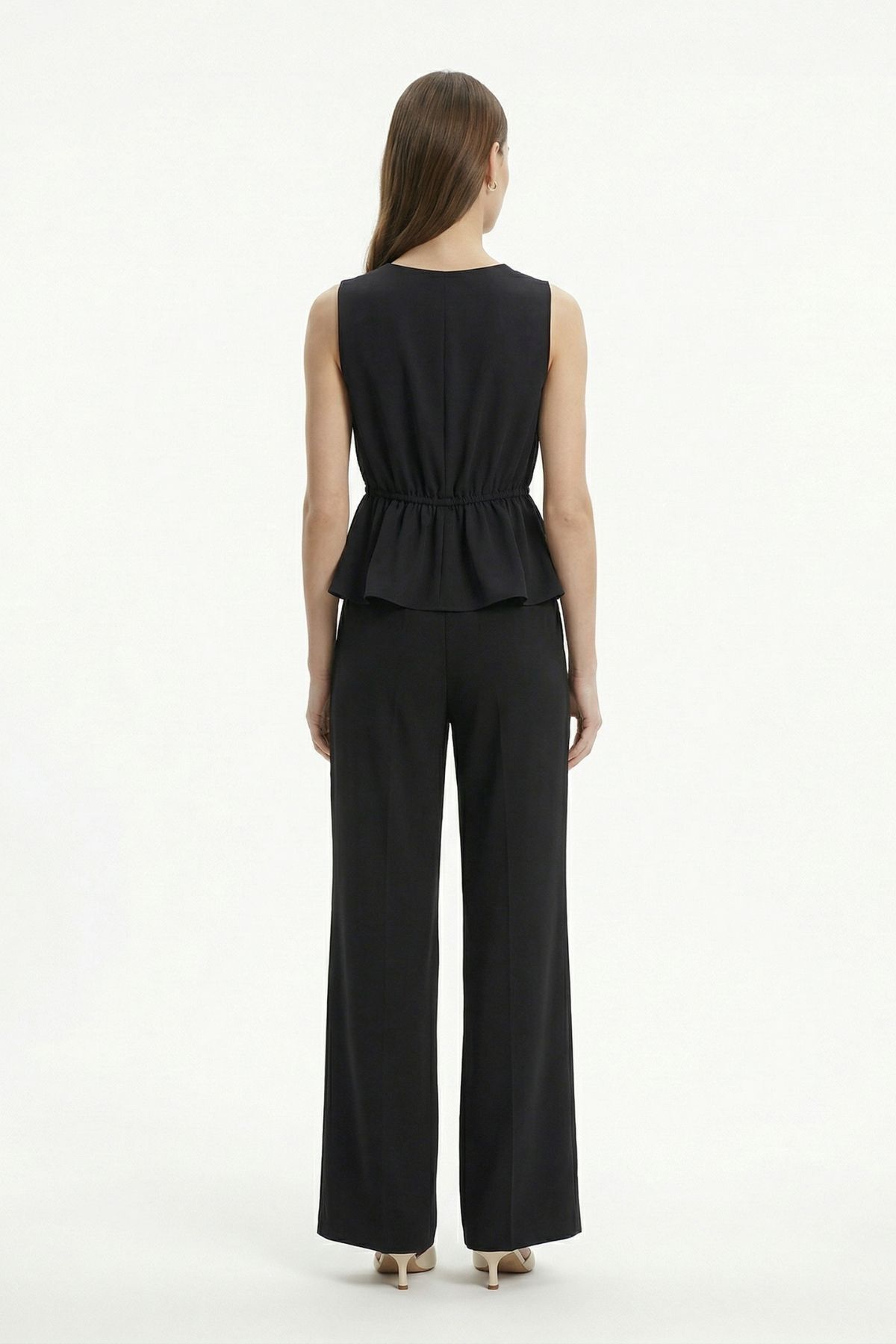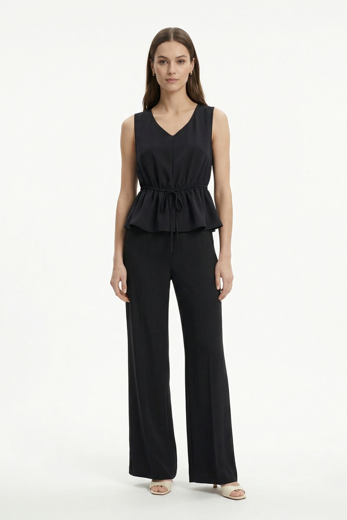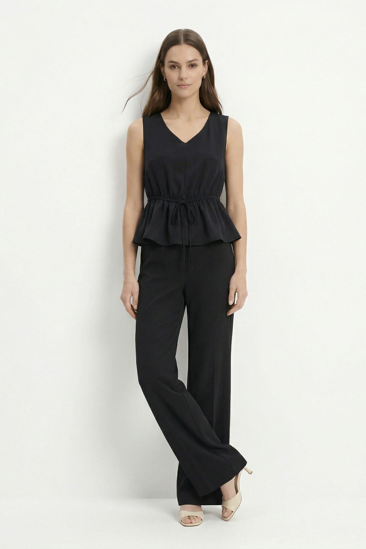 Siyah Bel Bağlamalı Sıfır Kol Bluz Pantolon Takım 2794