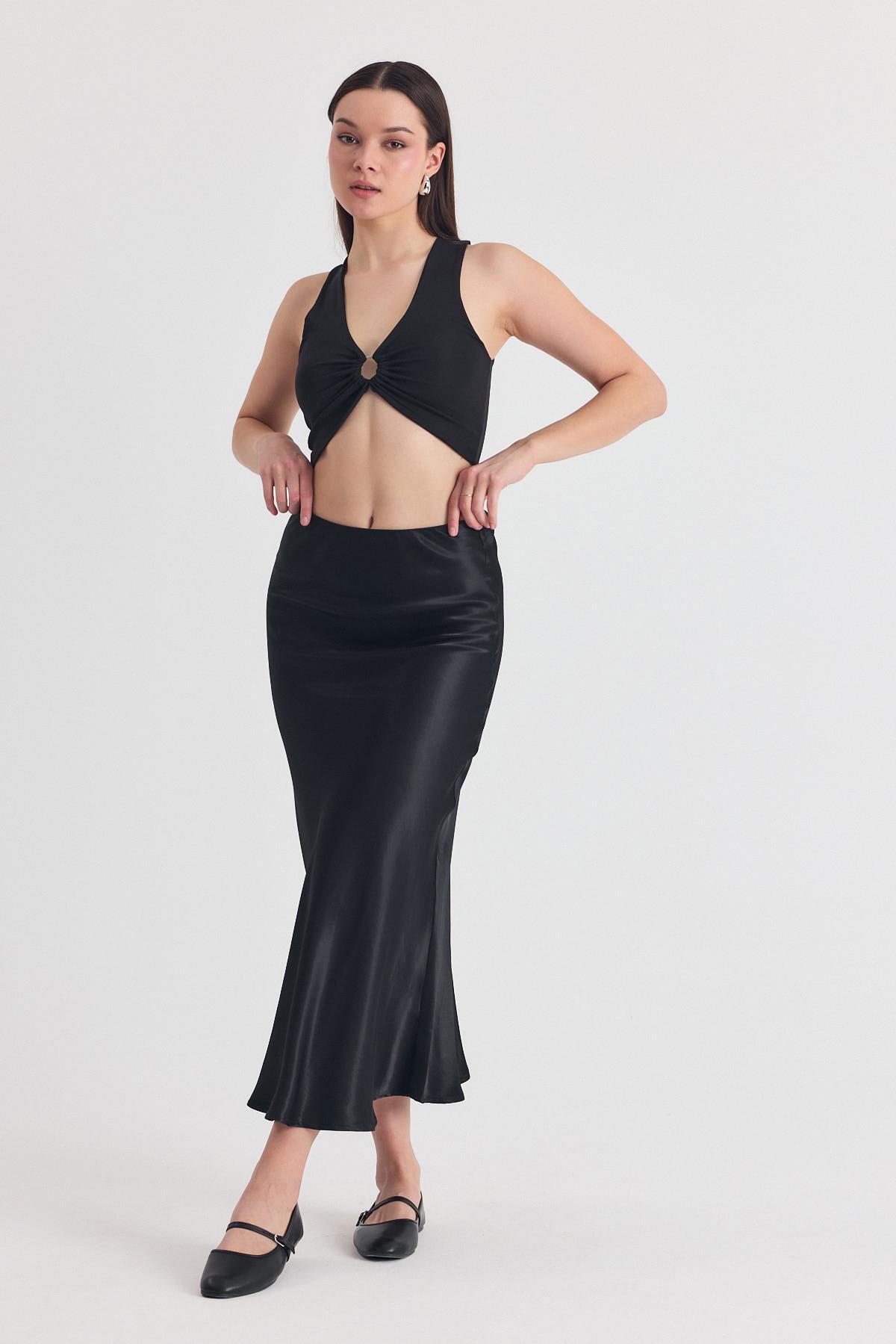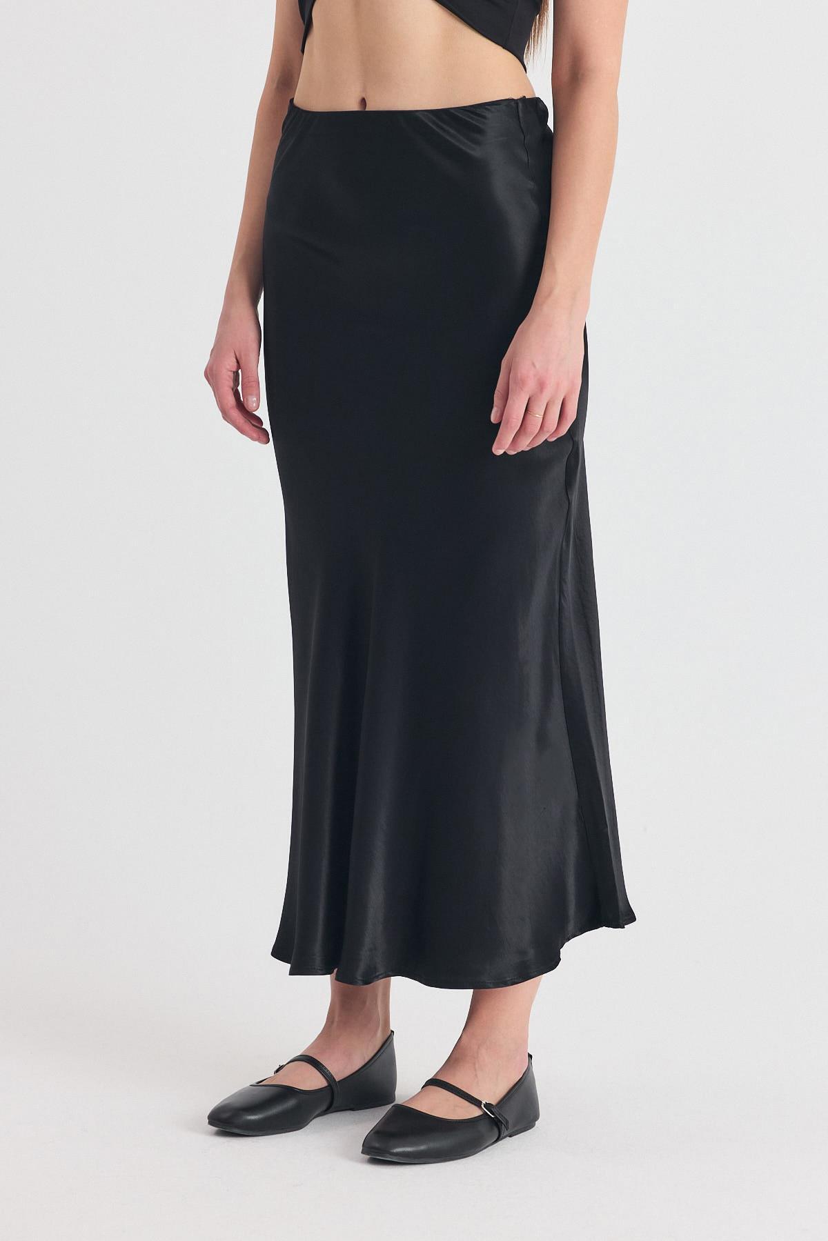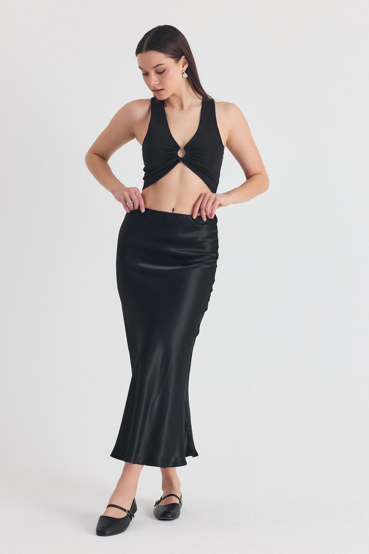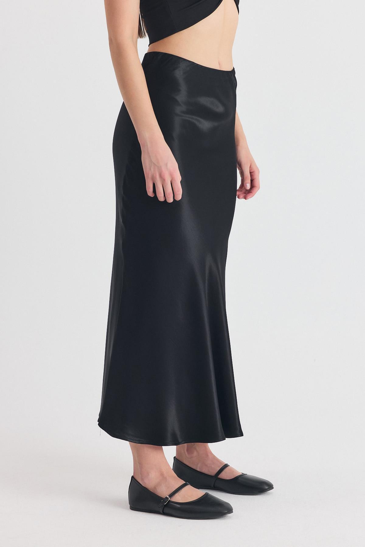 Siyah Beli Lastikli Saten Midi Etek 9427