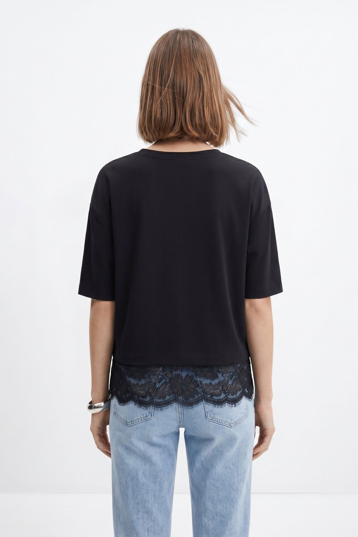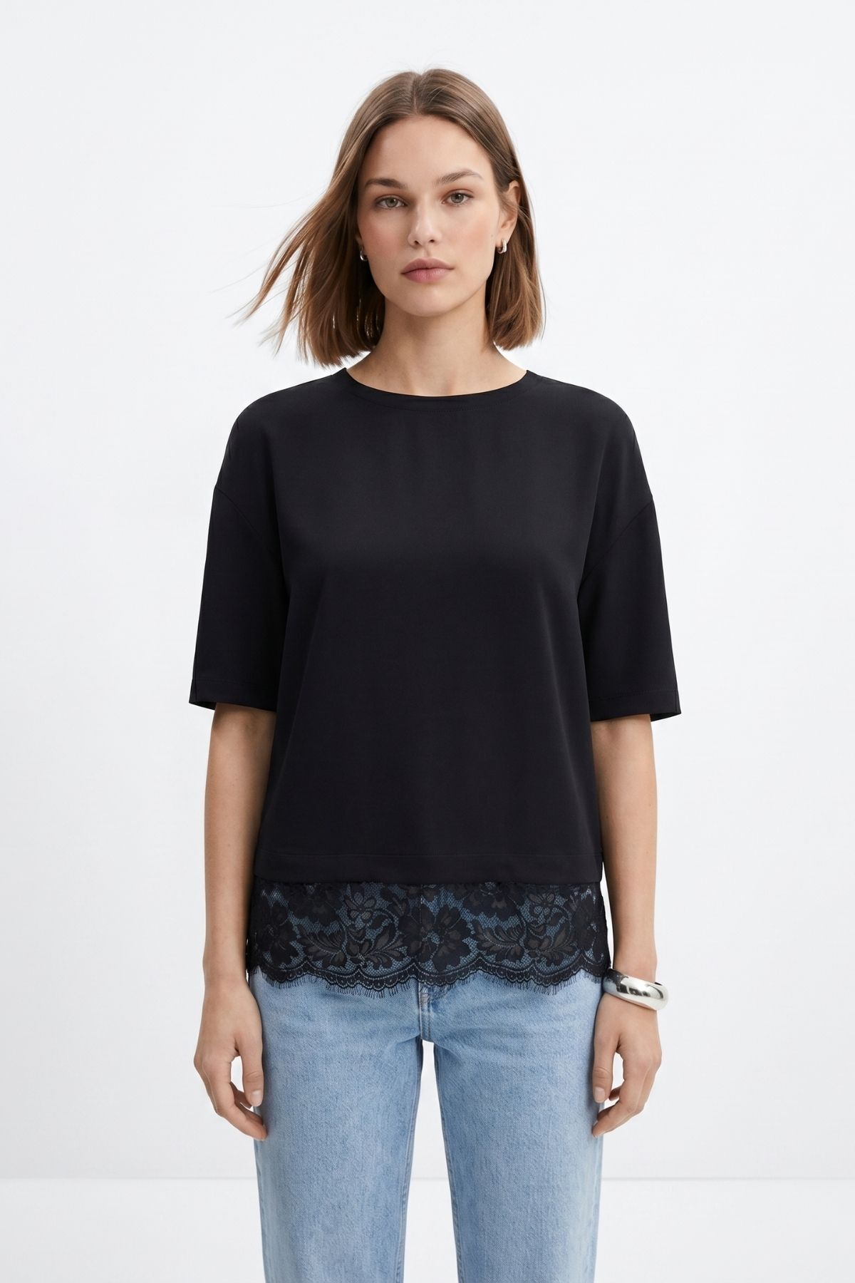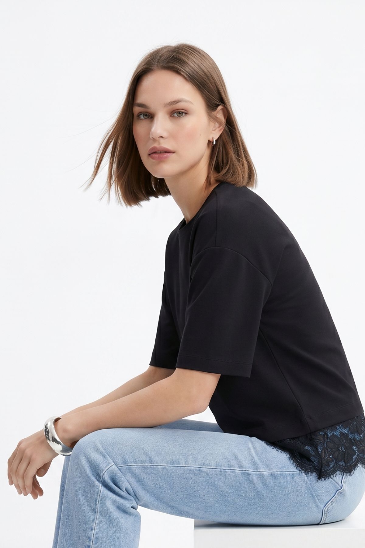 Siyah Bisiklet Yaka Dantel Detaylı Tişört 0463