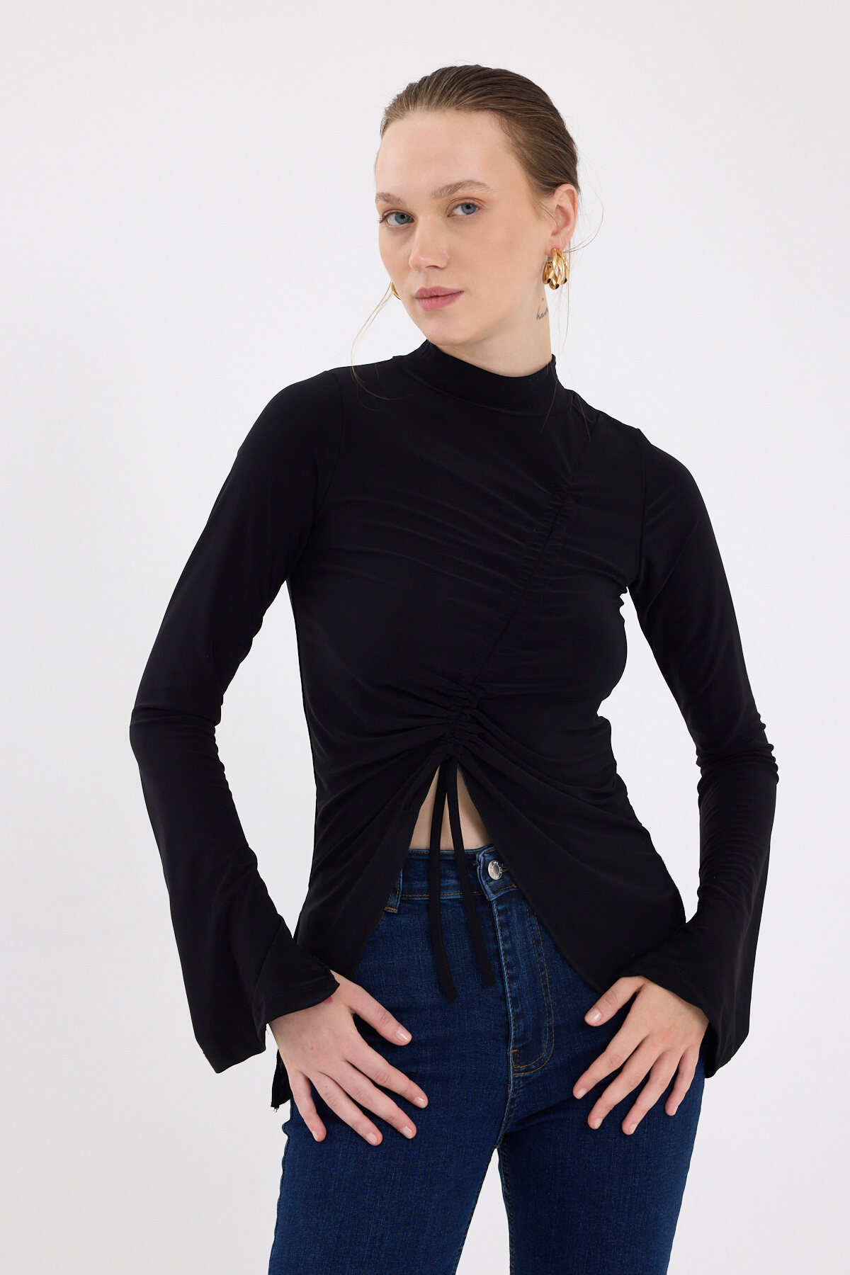 Siyah Büzgü Detaylı Balıkçı Yaka Bluz 2458