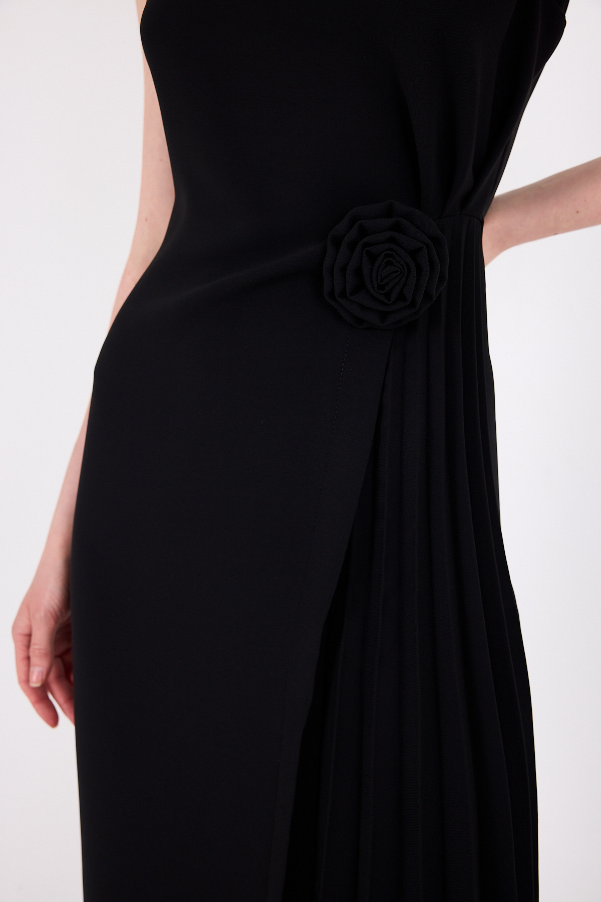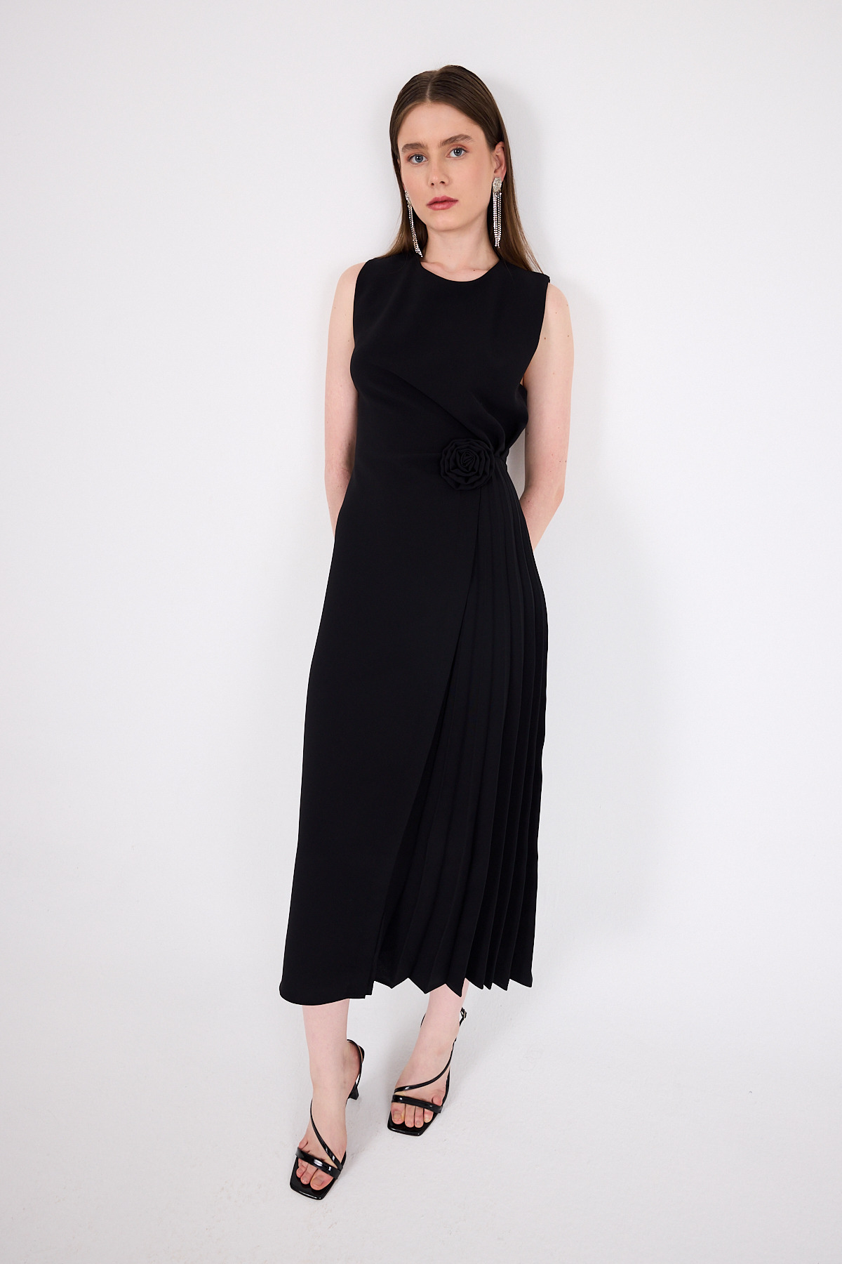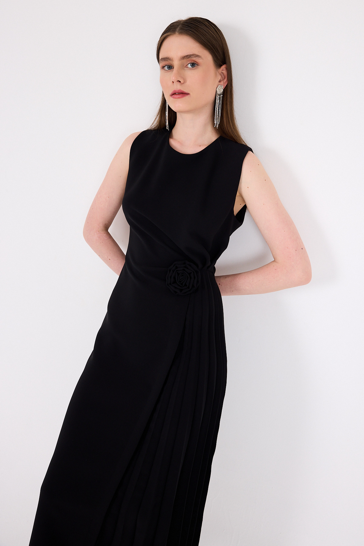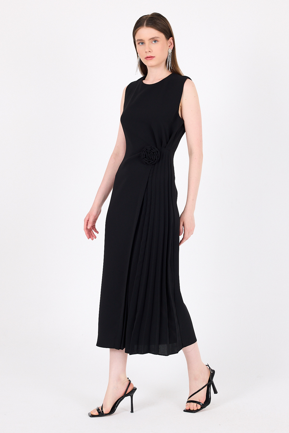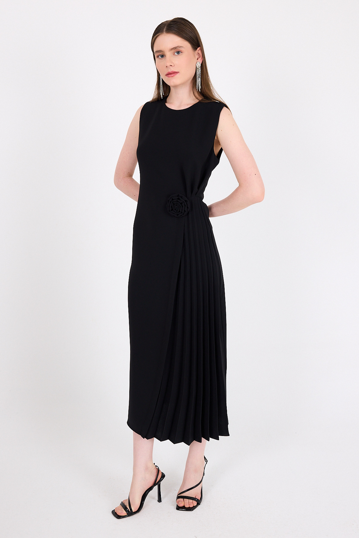 Siyah Çiçek Detaylı Pliseli Midi Abiye Elbise 251671
