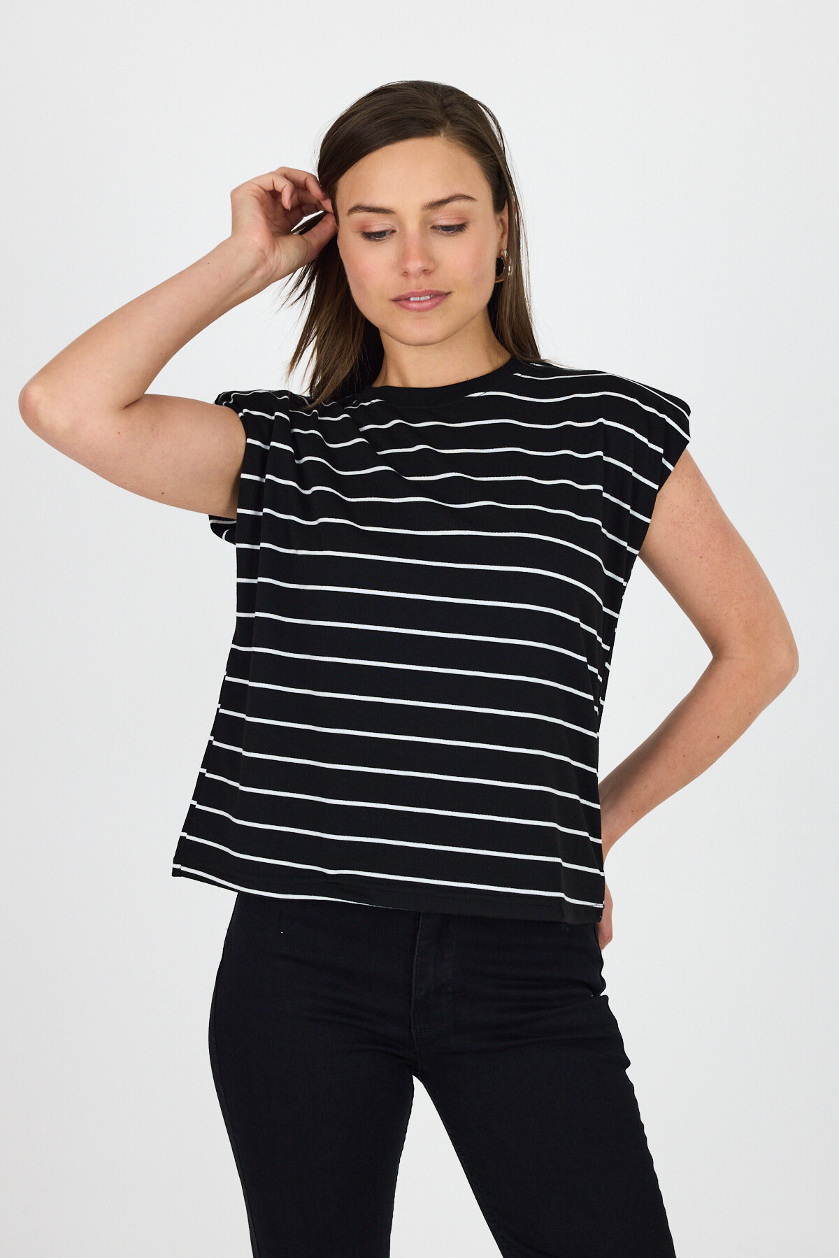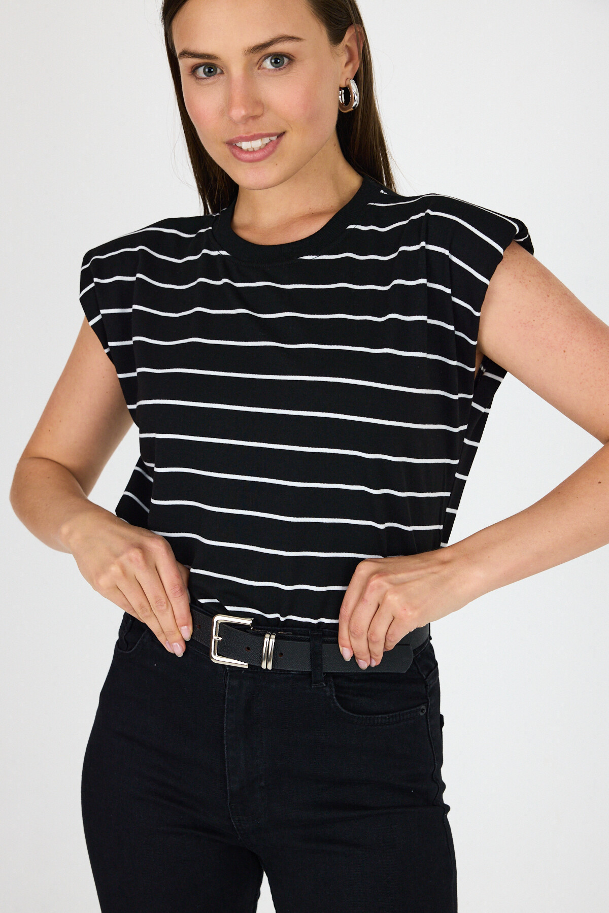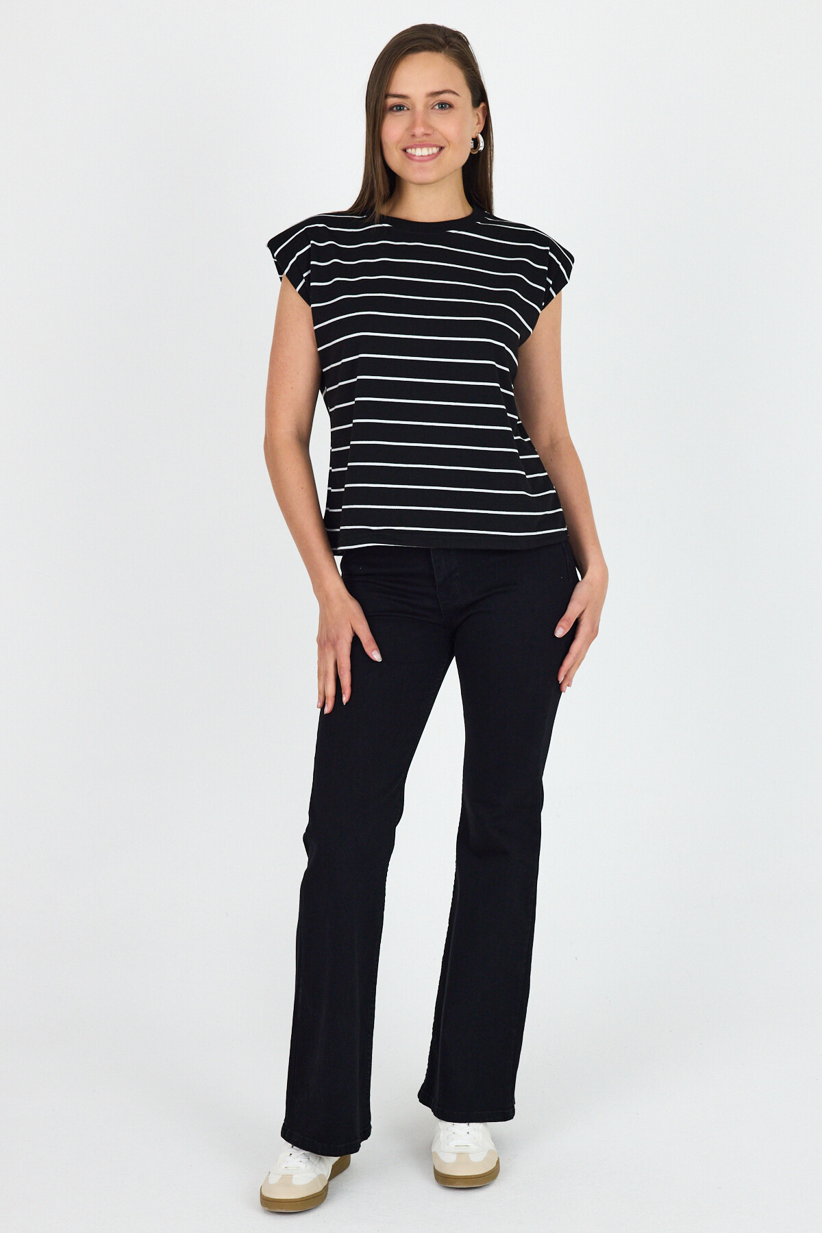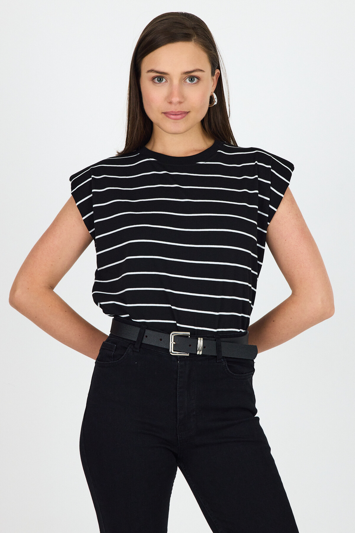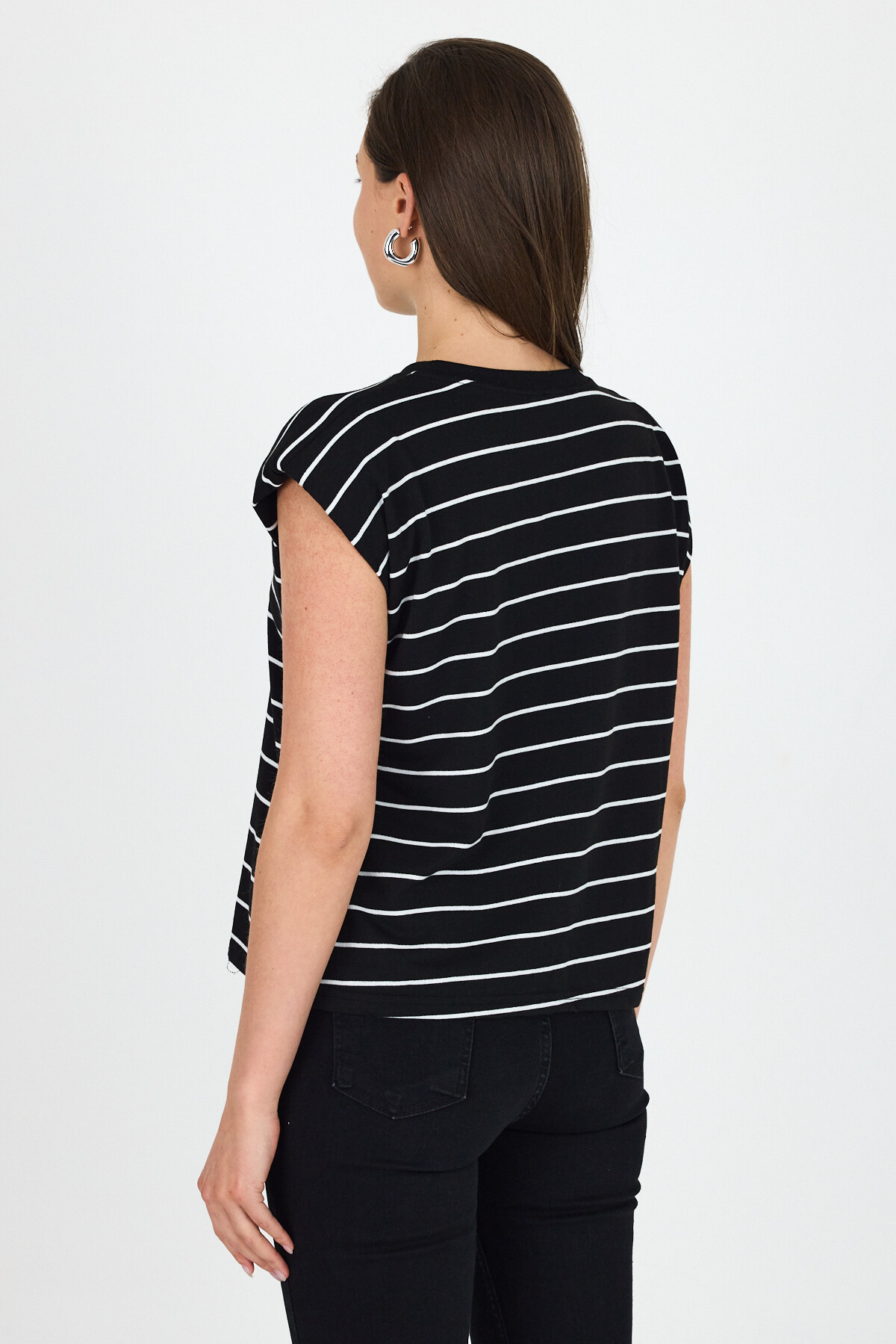 Siyah Çizgili Bisiklet Yaka Vatkalı Pamuklu Tişört 1761