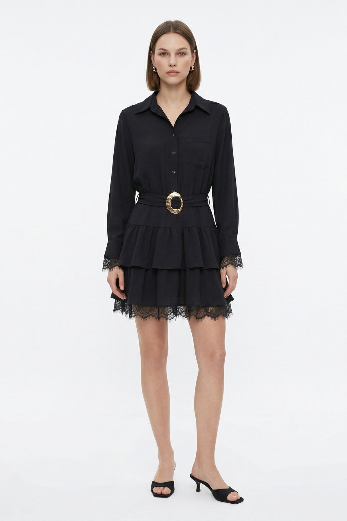 Siyah Düğmeli Kat Kat Elbise 2817