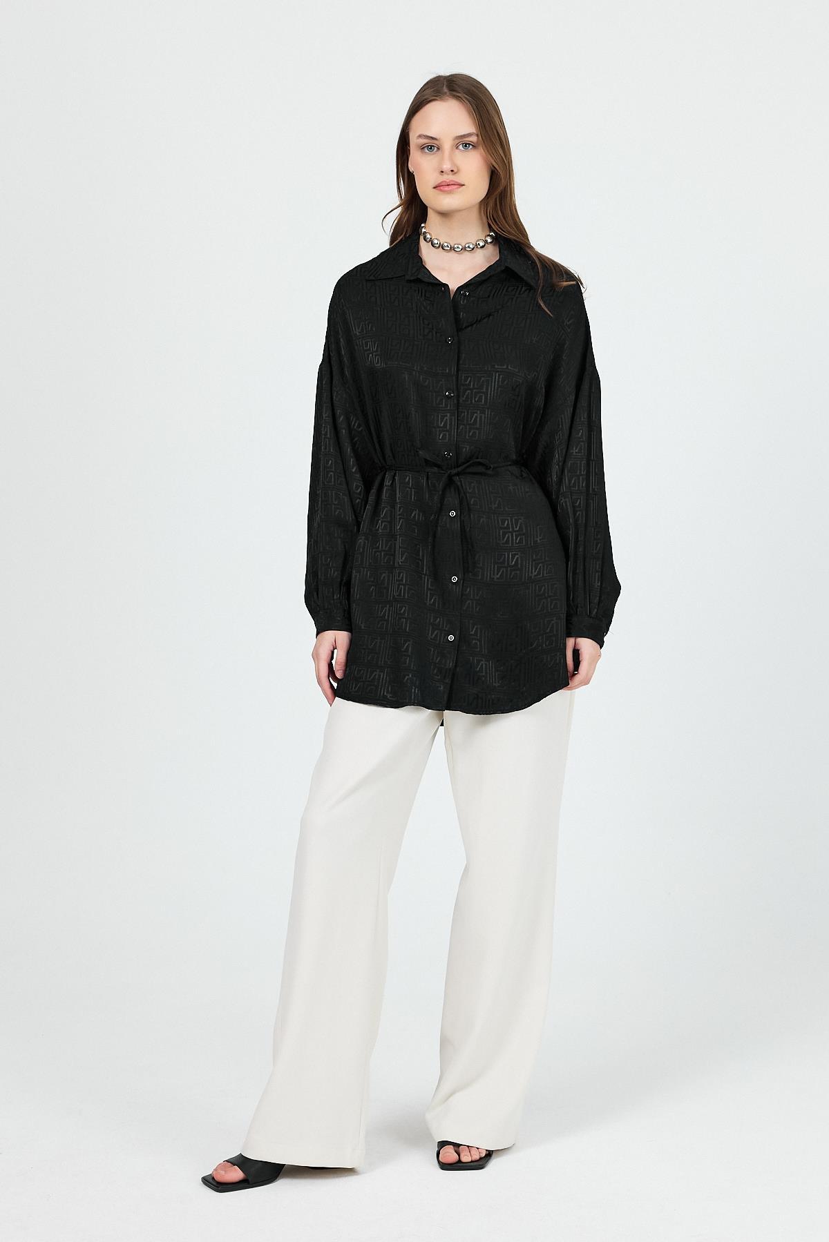 Siyah Desenli Saten Görünümlü İp Bağlama Detaylı Gömlek 4293A