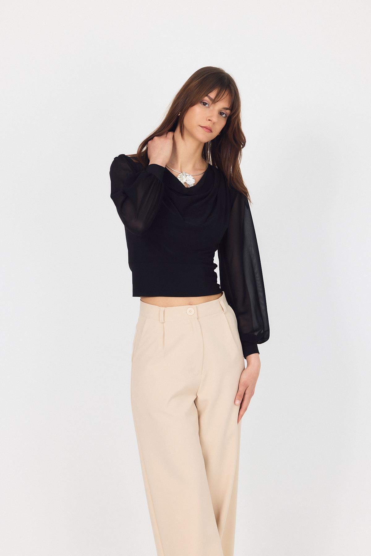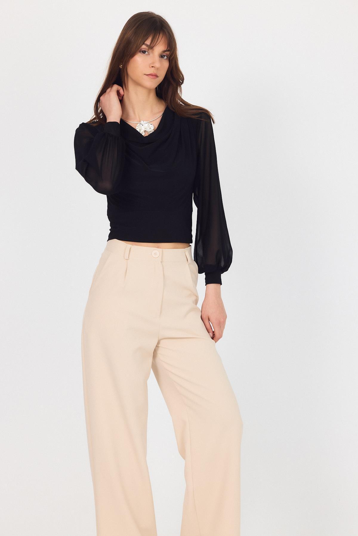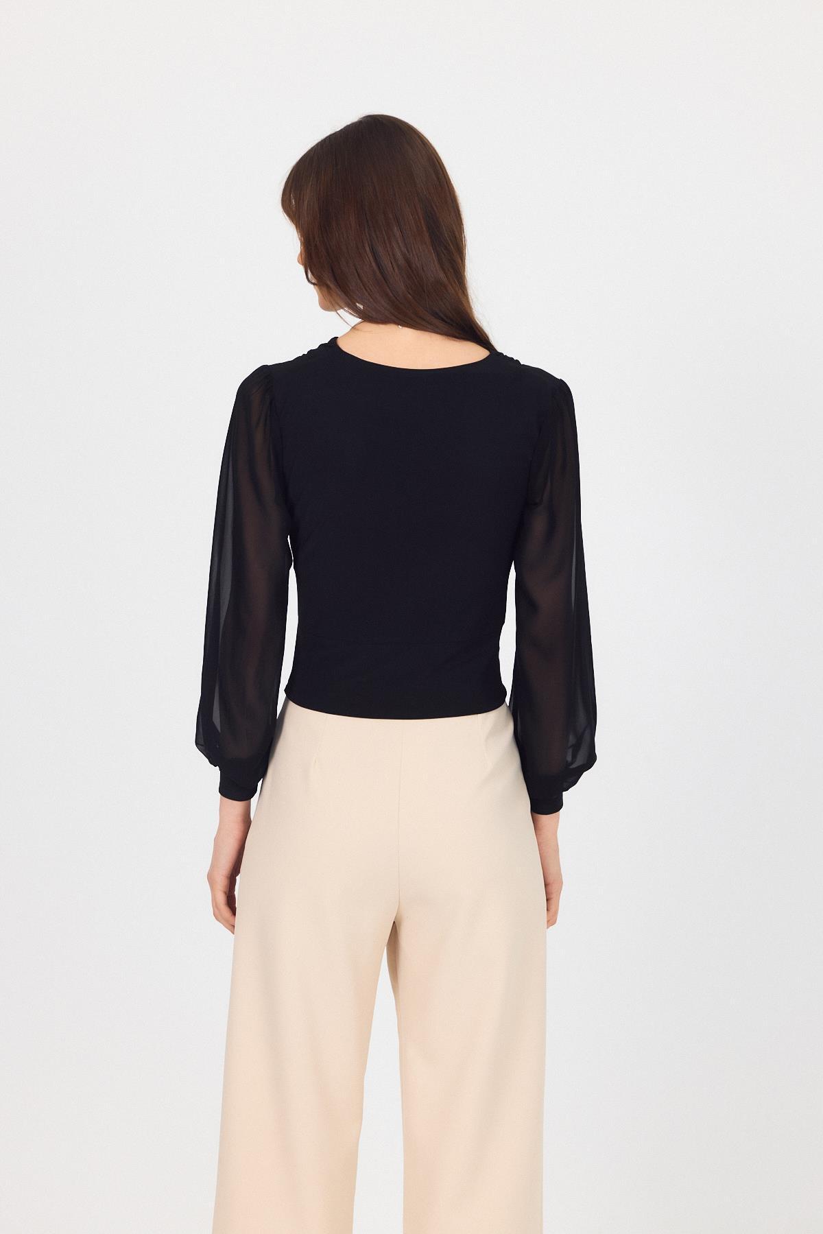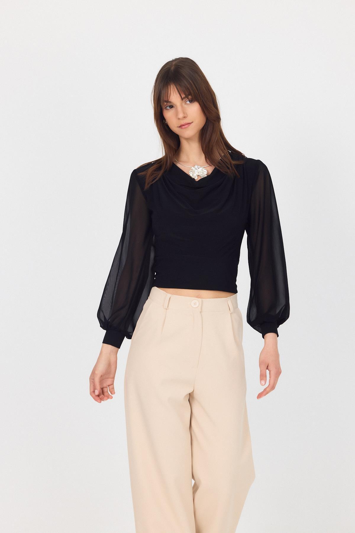 Siyah Drapeli Tül Kol Detaylı Bluz 9474