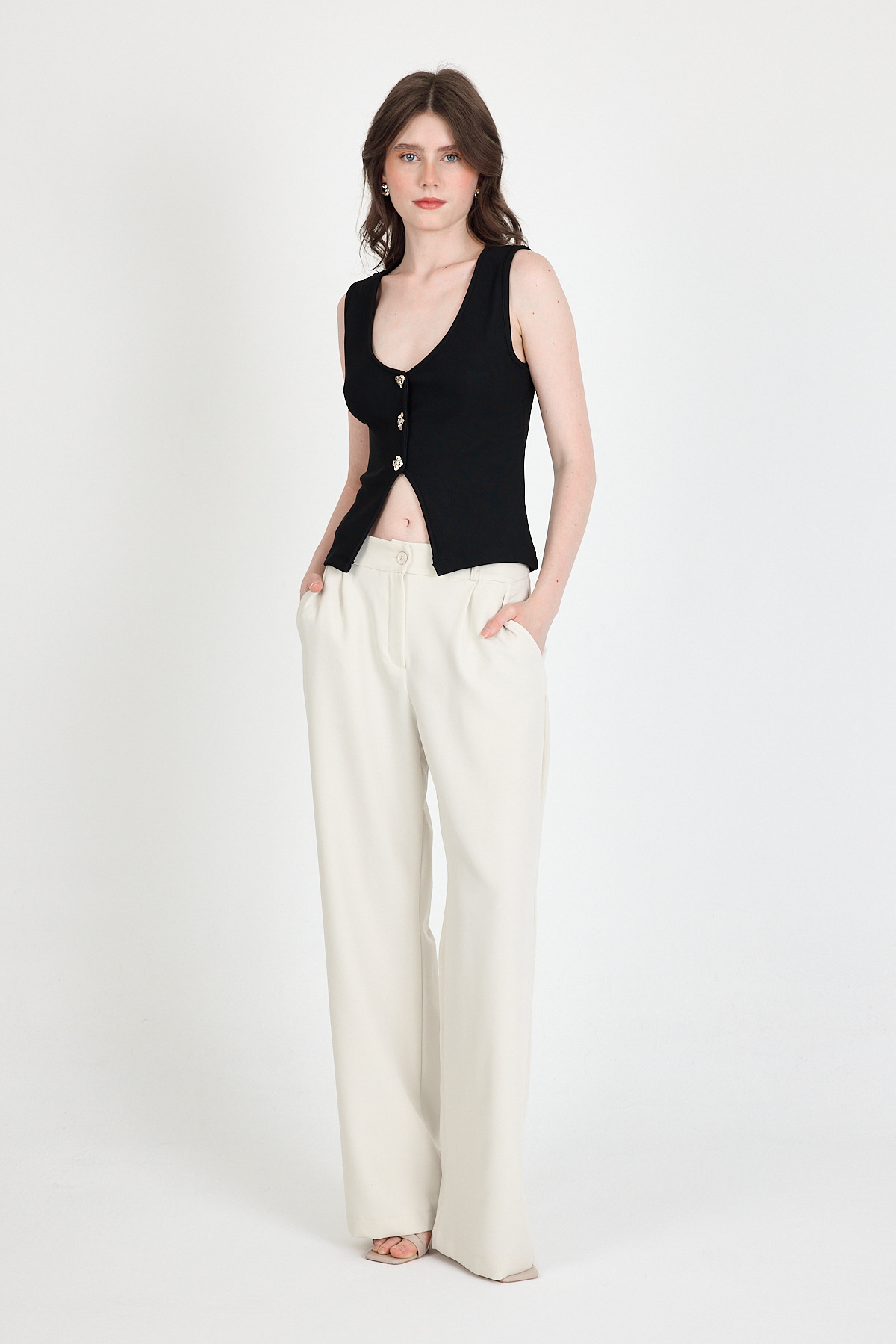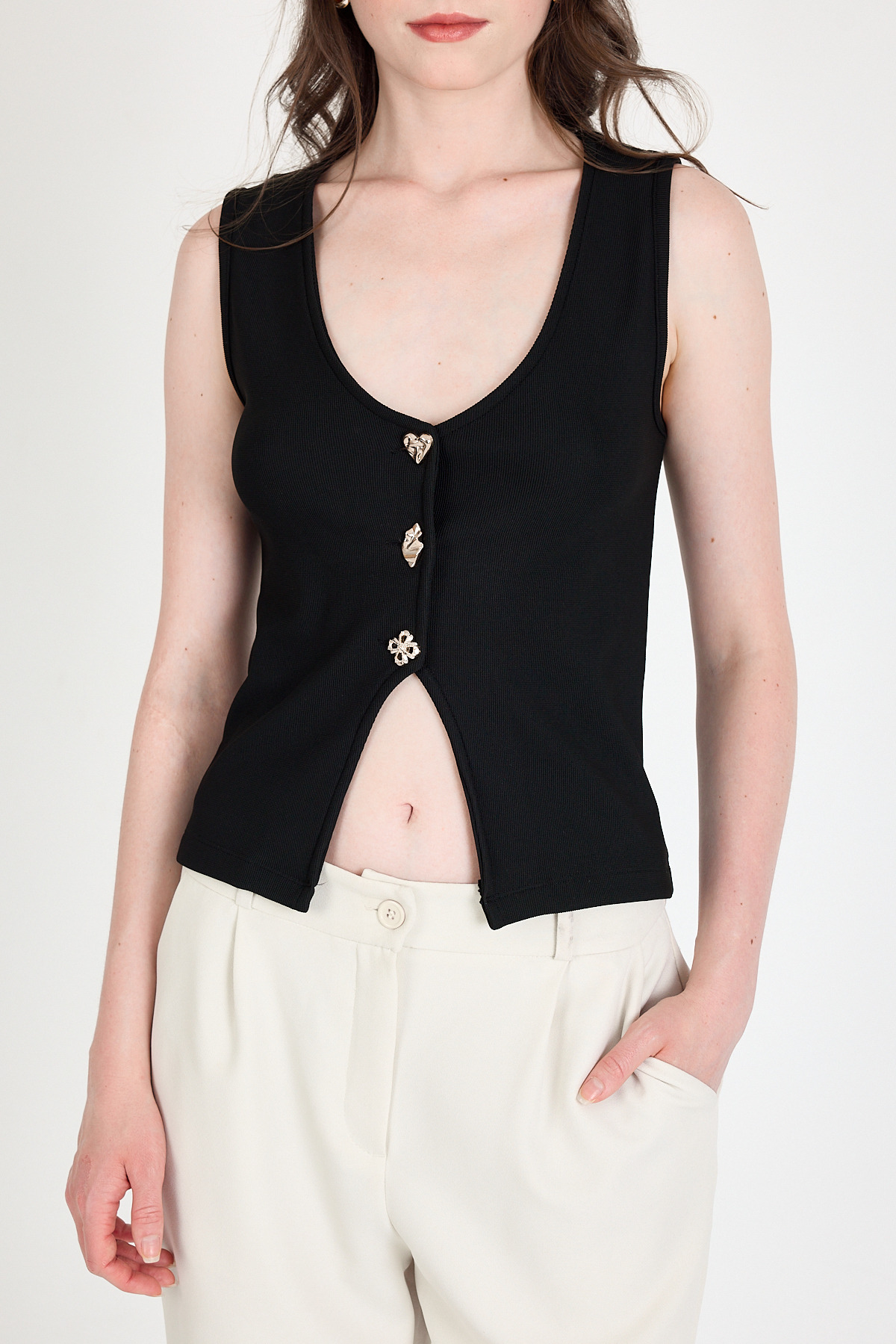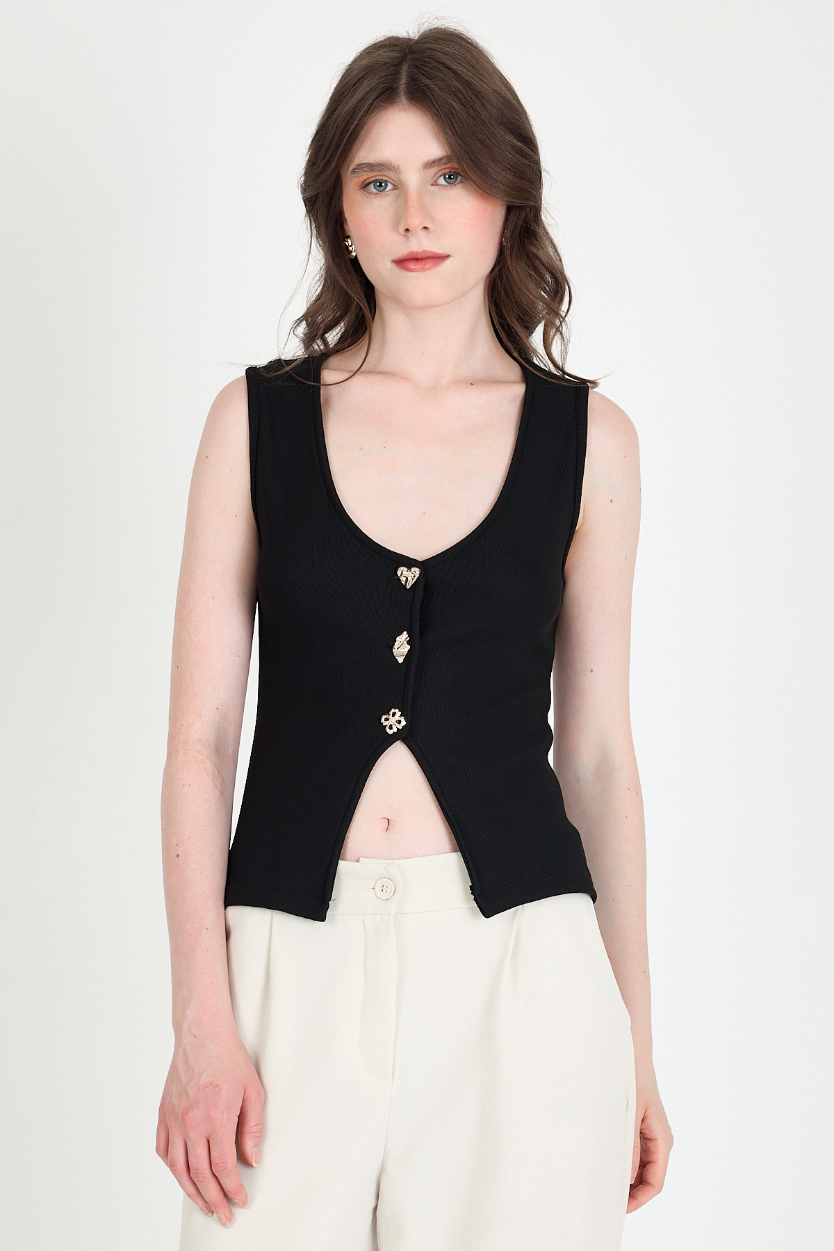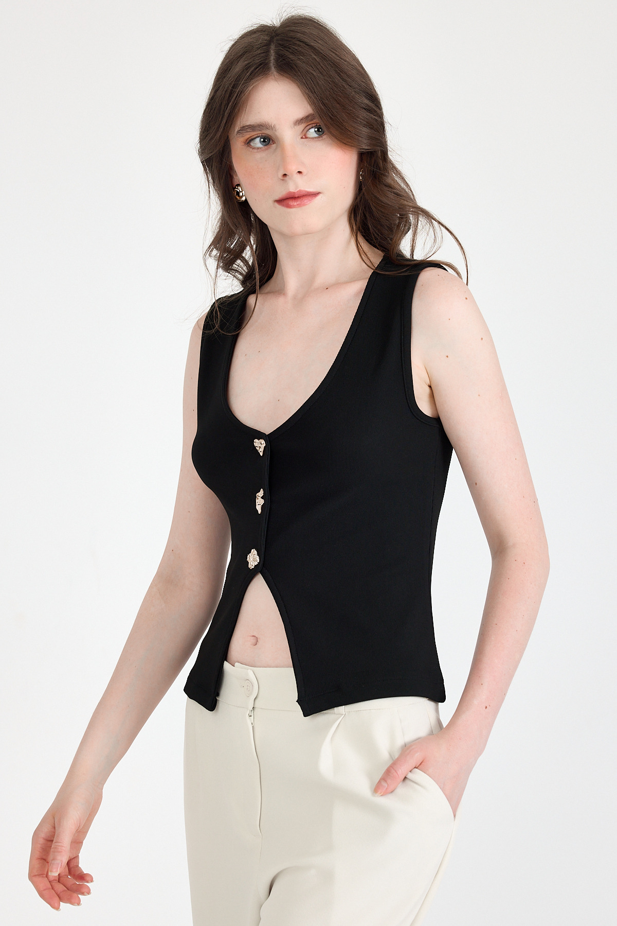 Siyah Düğme Detaylı V Yaka Bluz 018