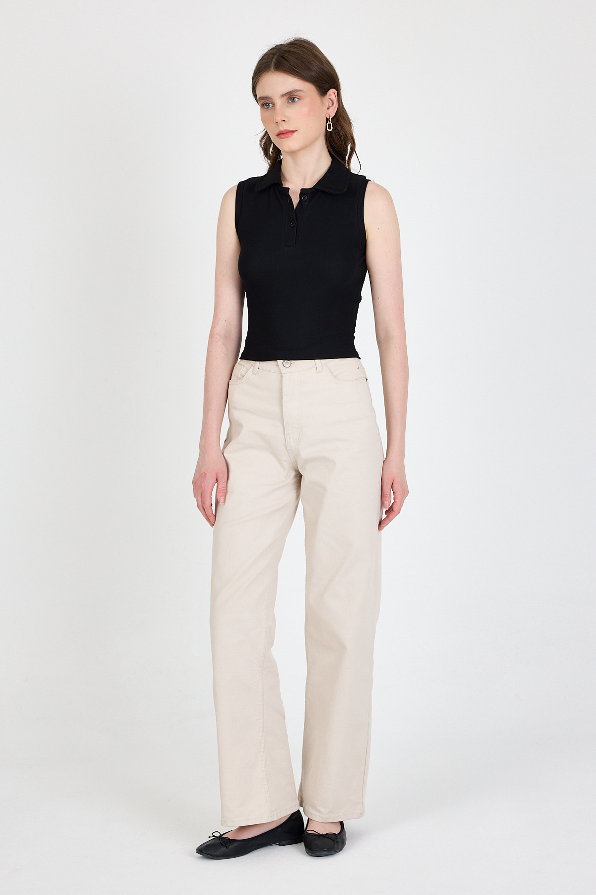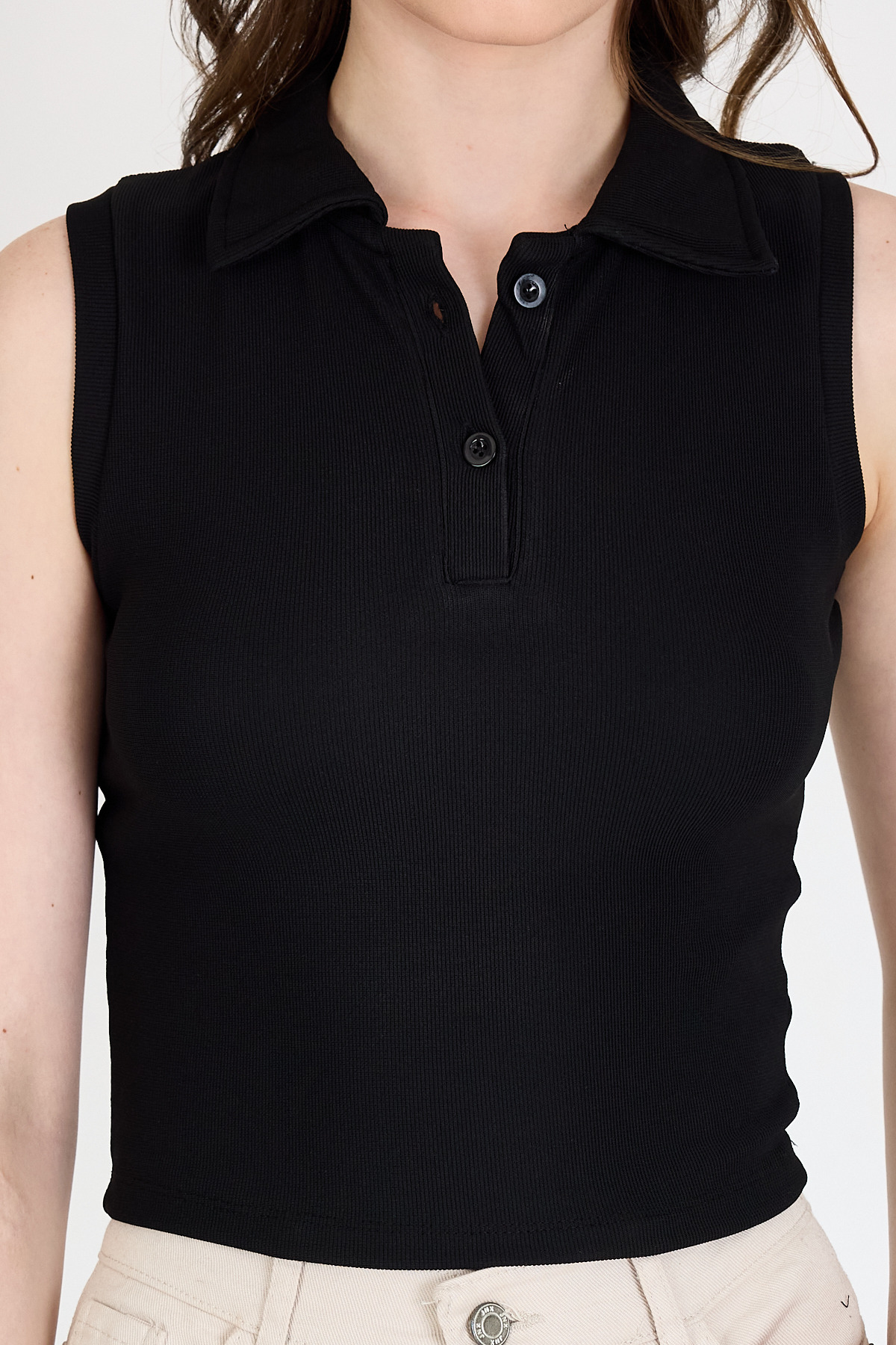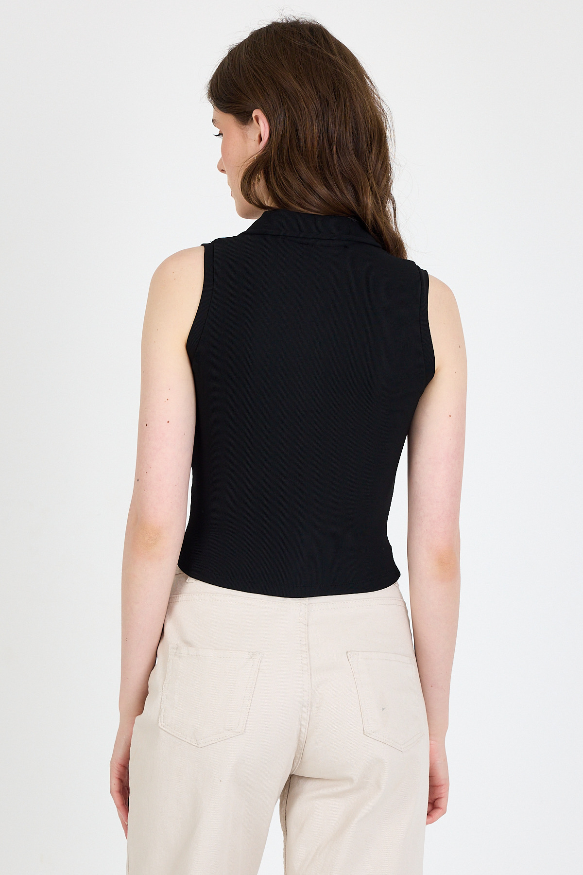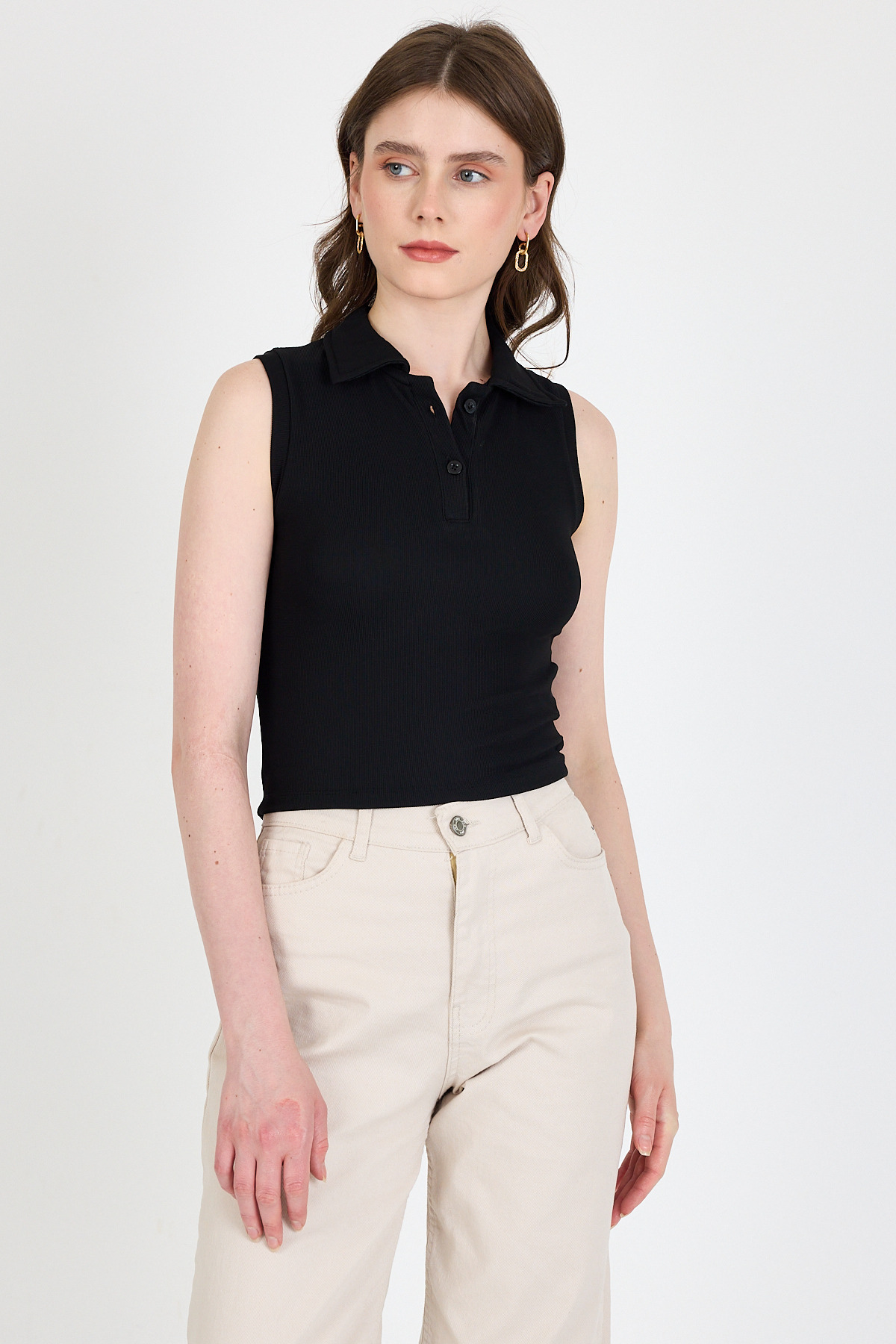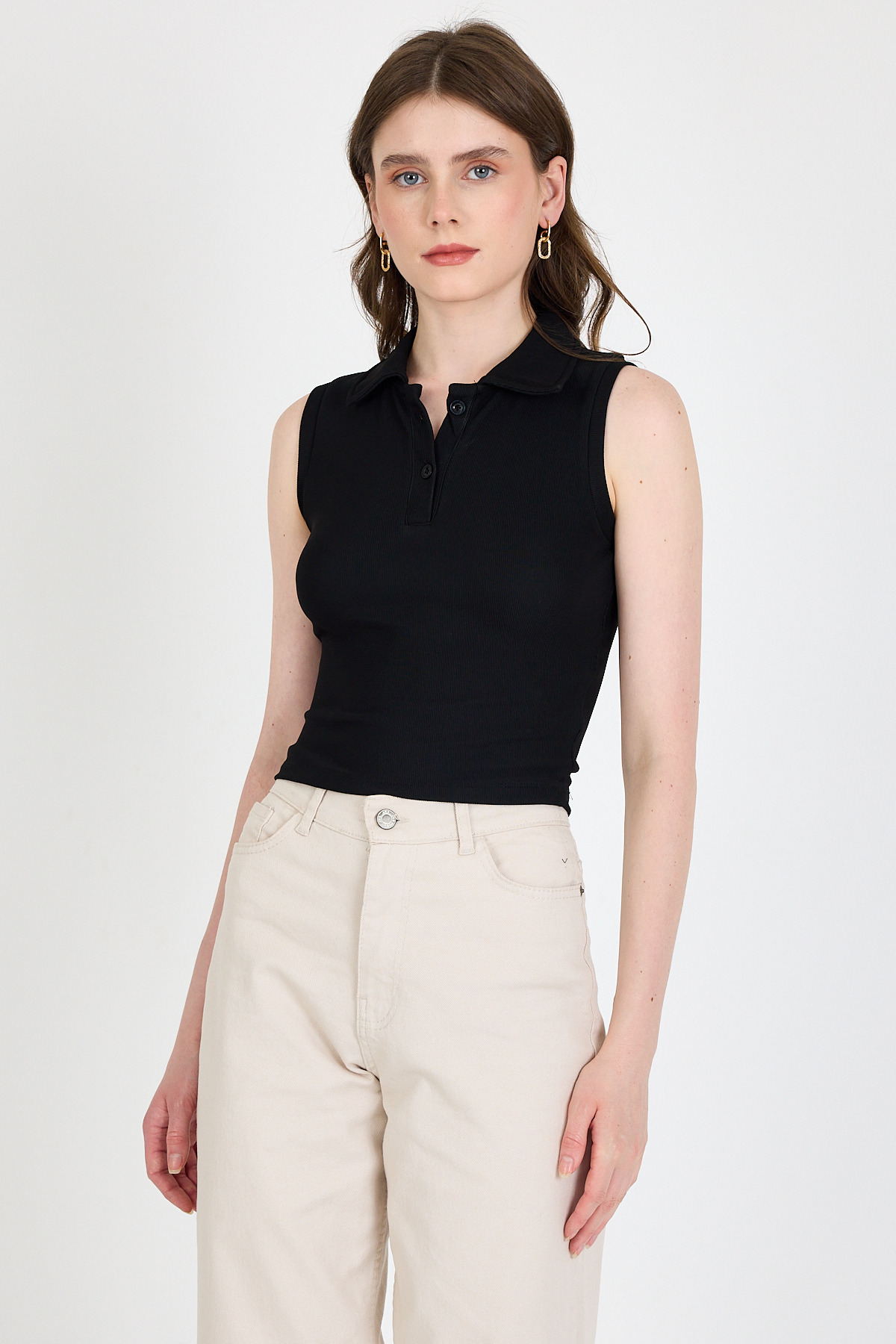 Siyah Düğmeli Polo Yaka Sıfır Kol Örme Bluz 2219