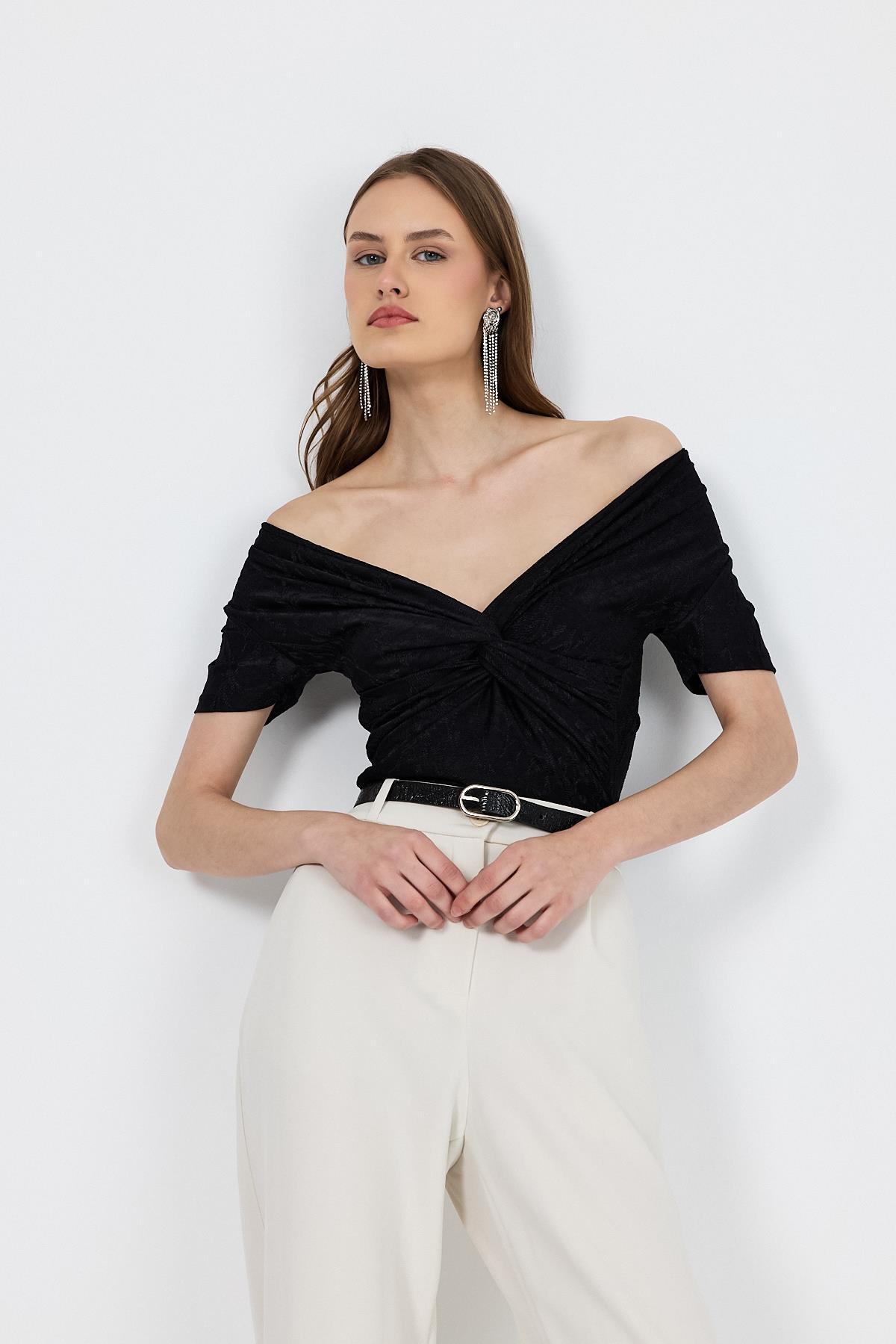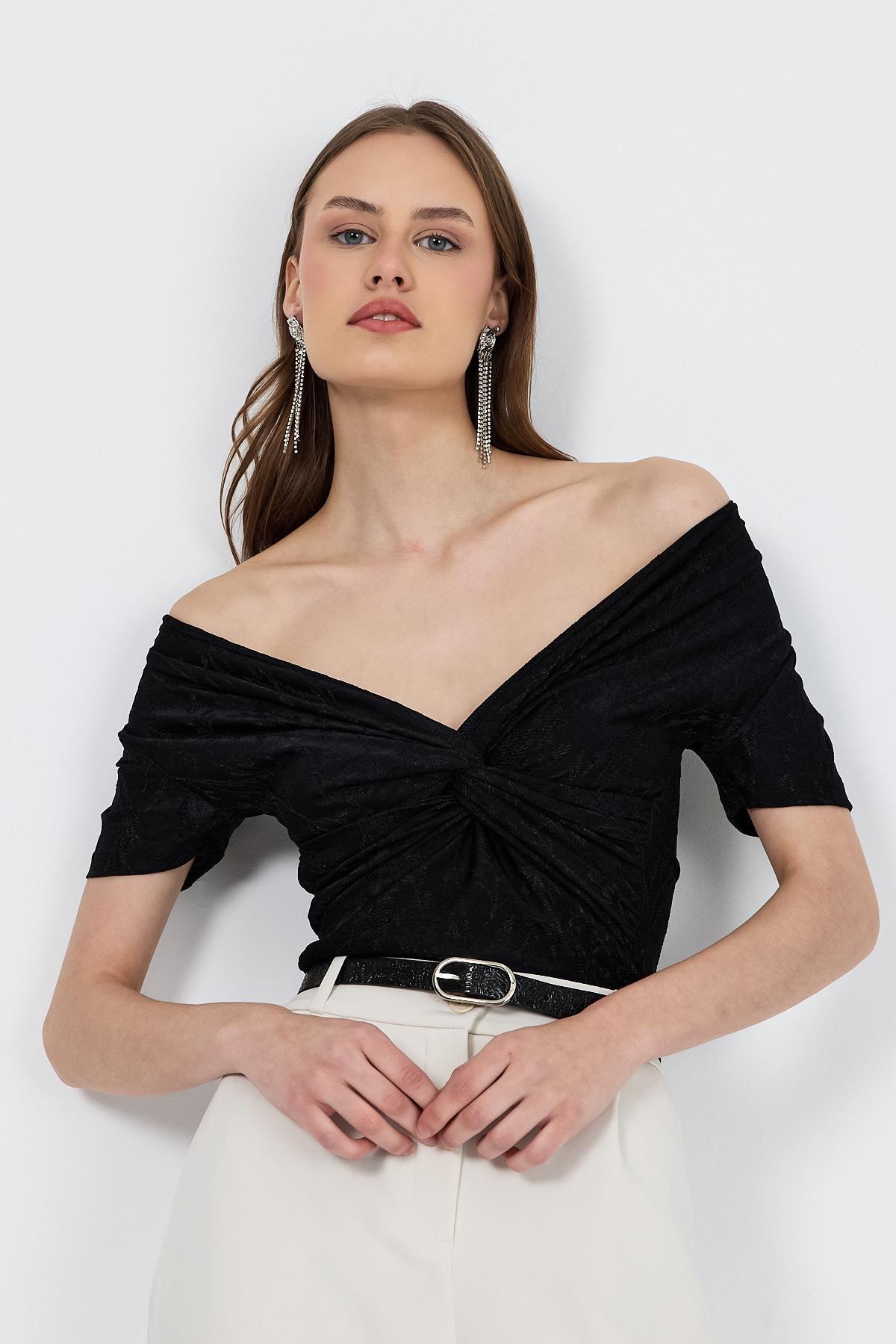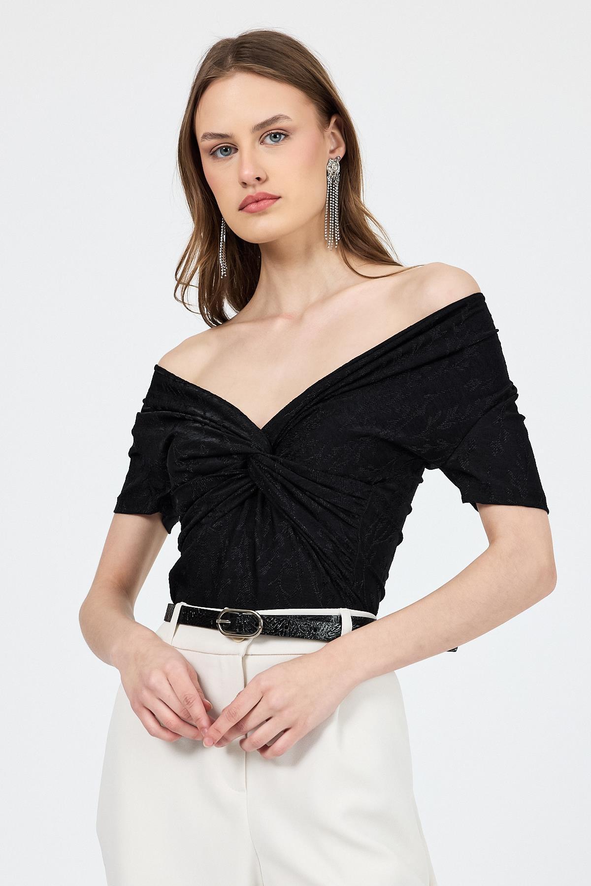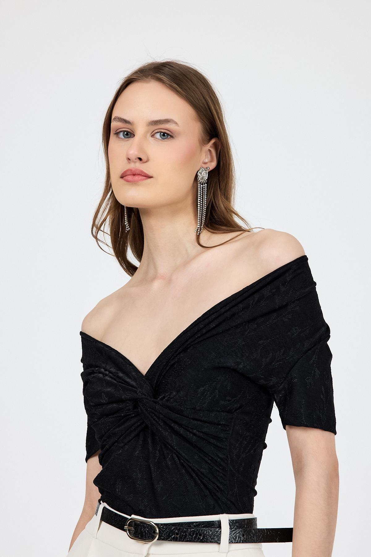 Siyah Düşük Omuz Büzgü Detaylı Bluz 13325
