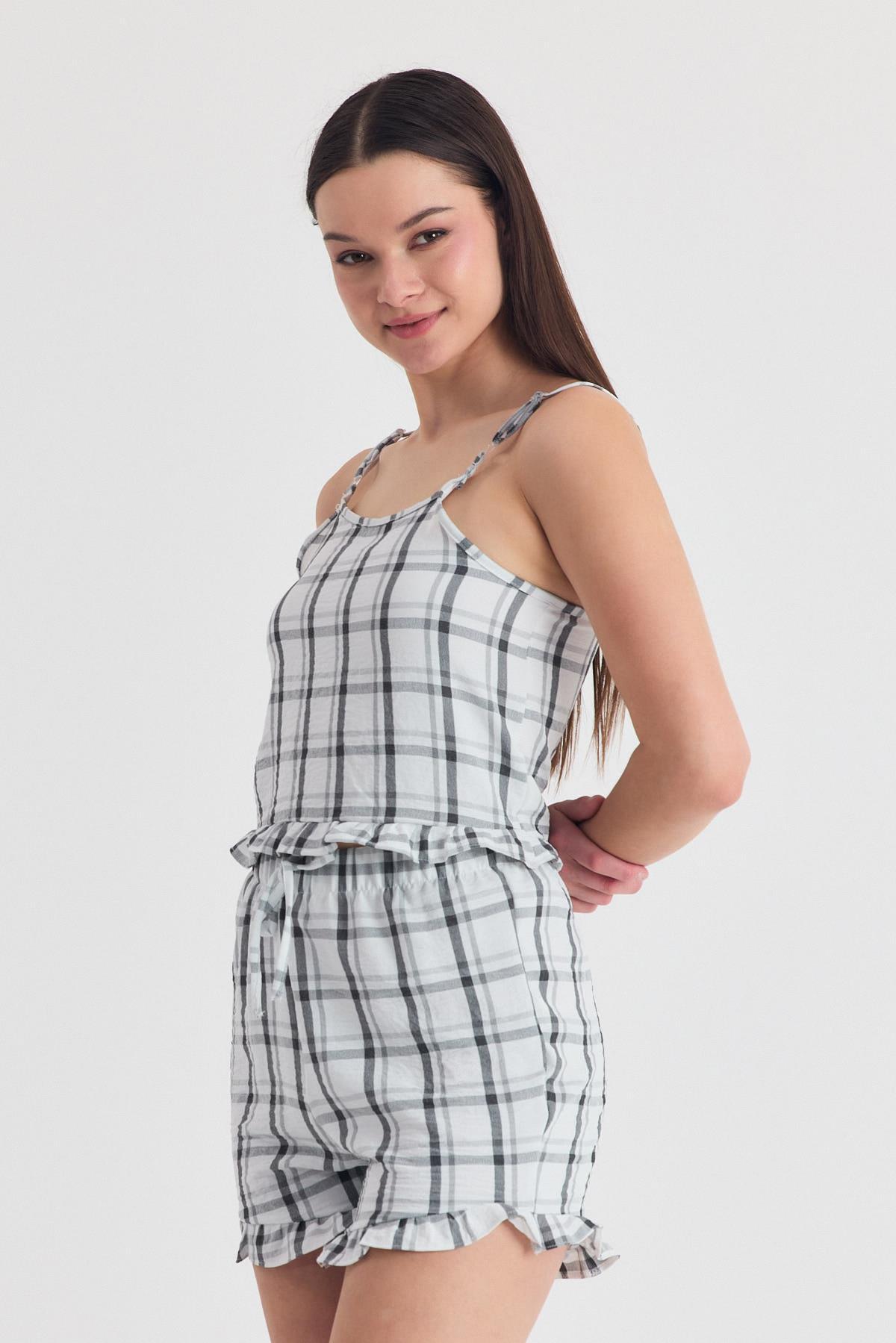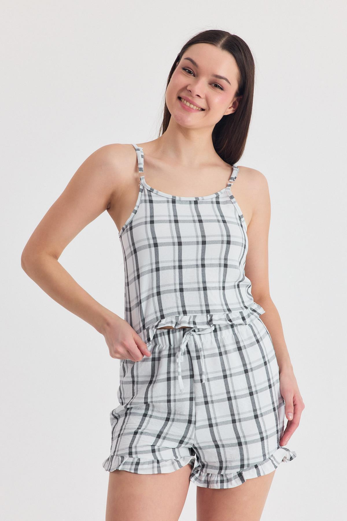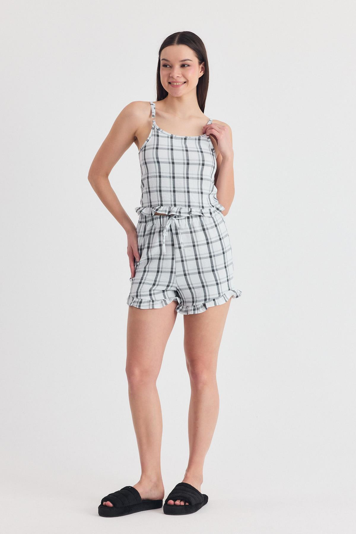 Siyah Ekose Desenli Fırfır Detaylı Şortlu Takım 4452