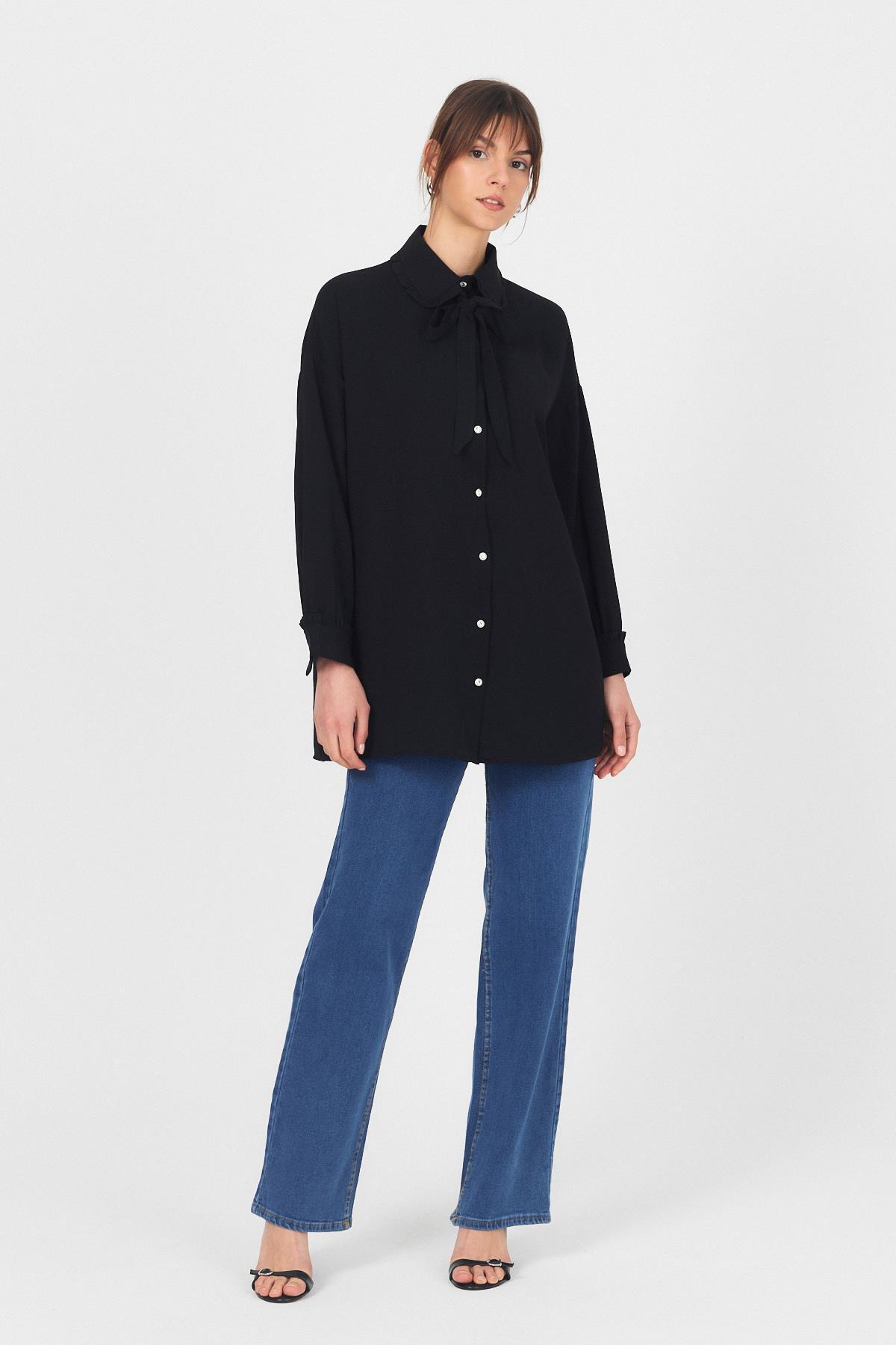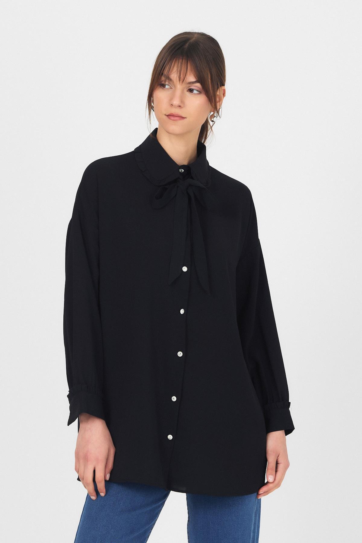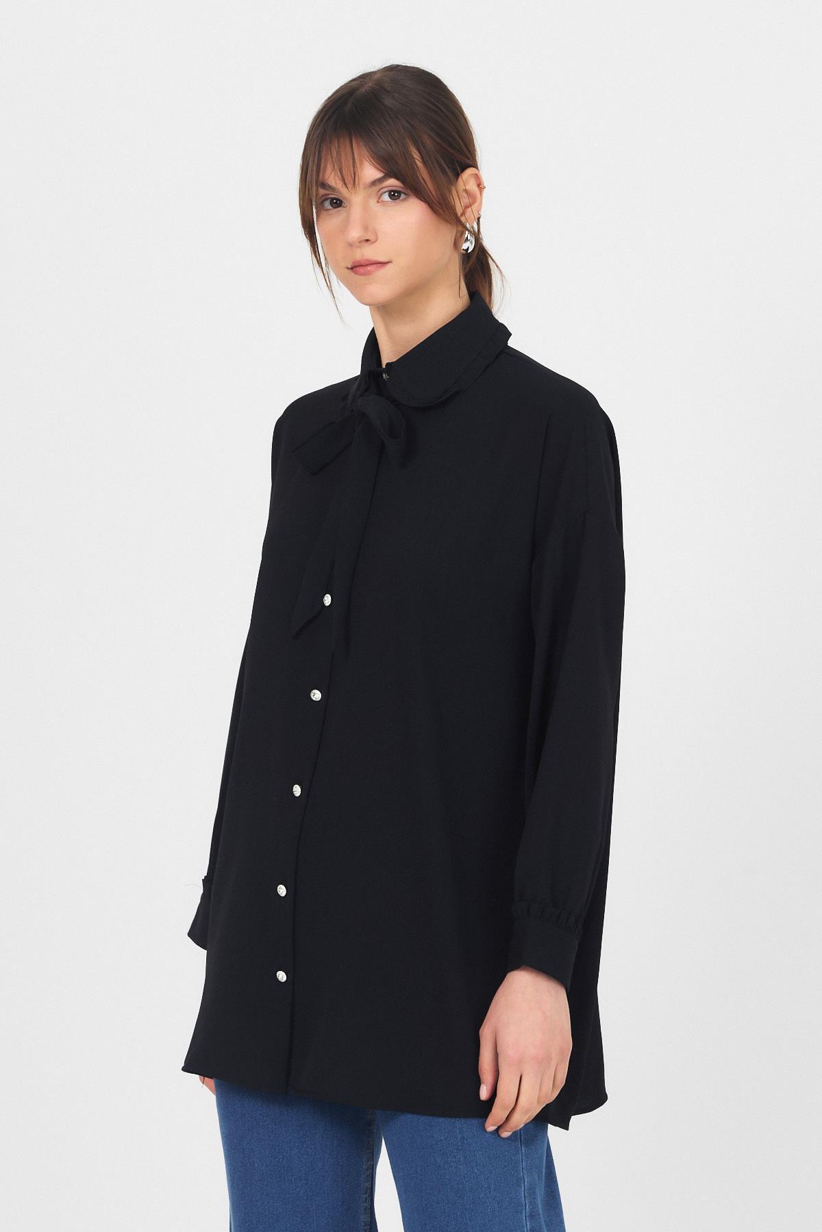 Siyah Fırfır Yaka Detaylı Bağlamalı Tunik 4586A