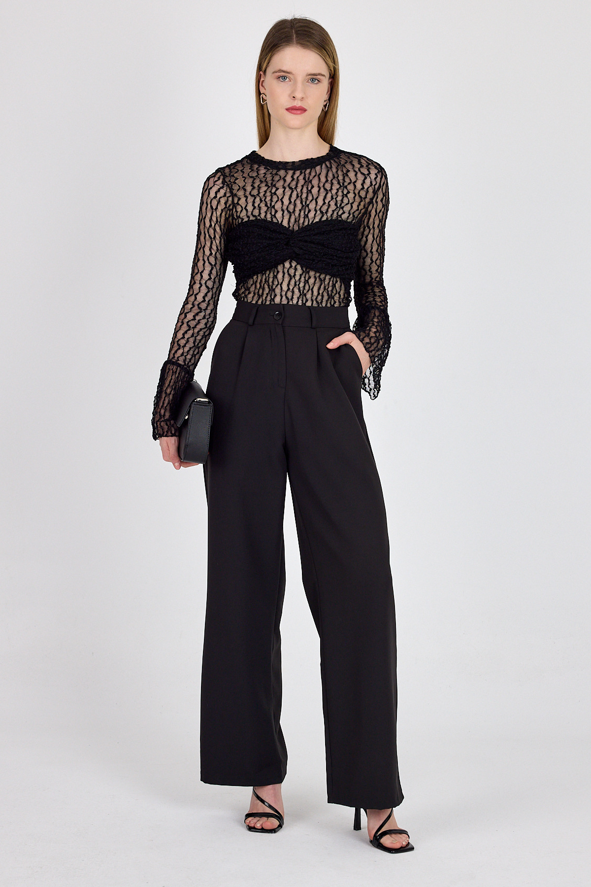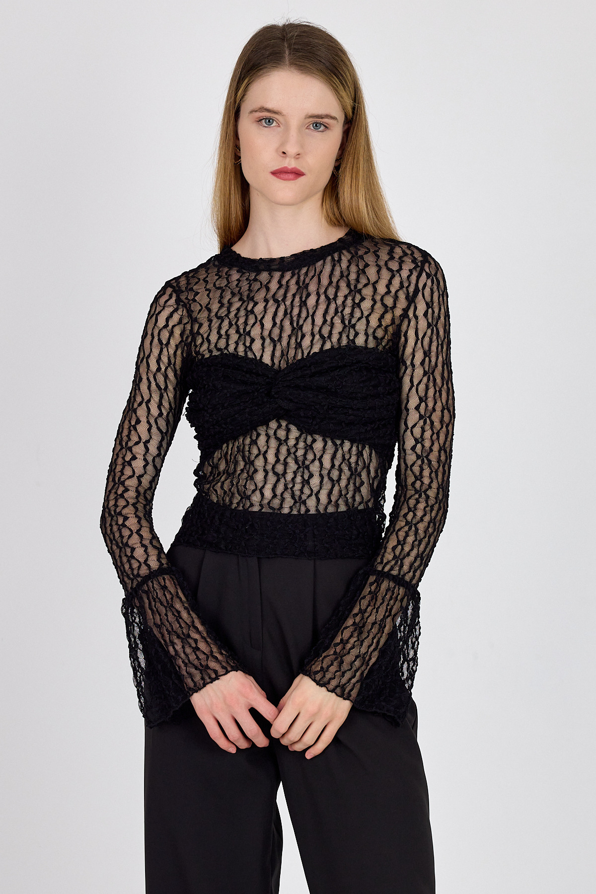 Siyah Göğüs Detaylı Transparan Dantel Bluz 251109