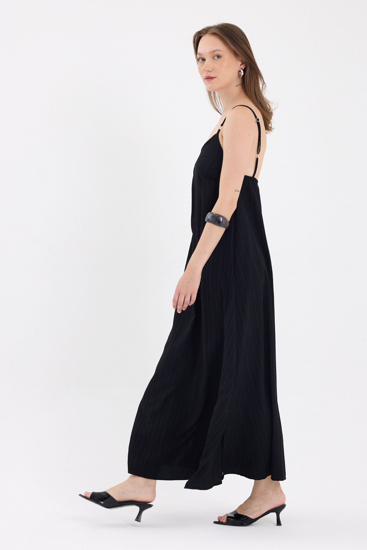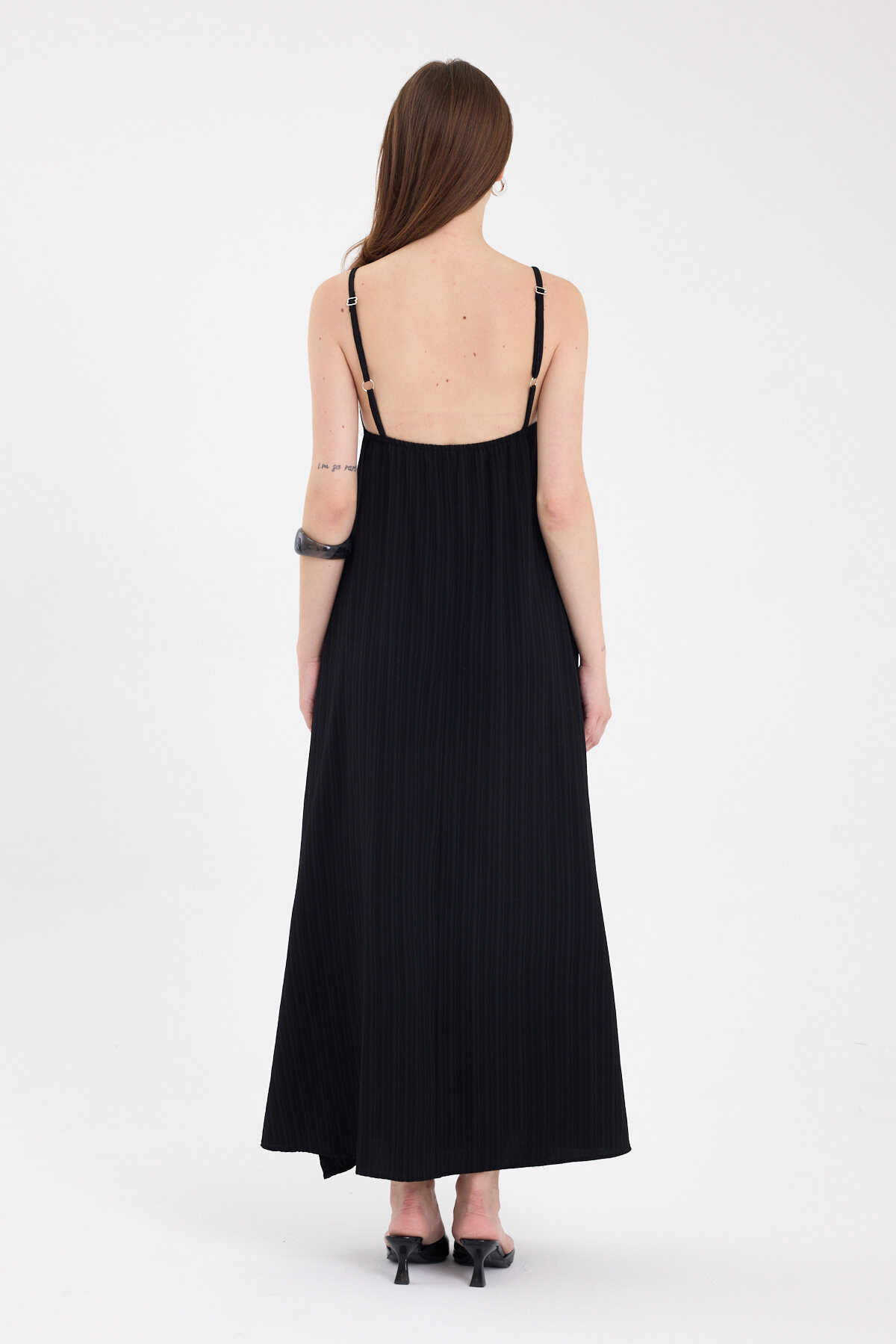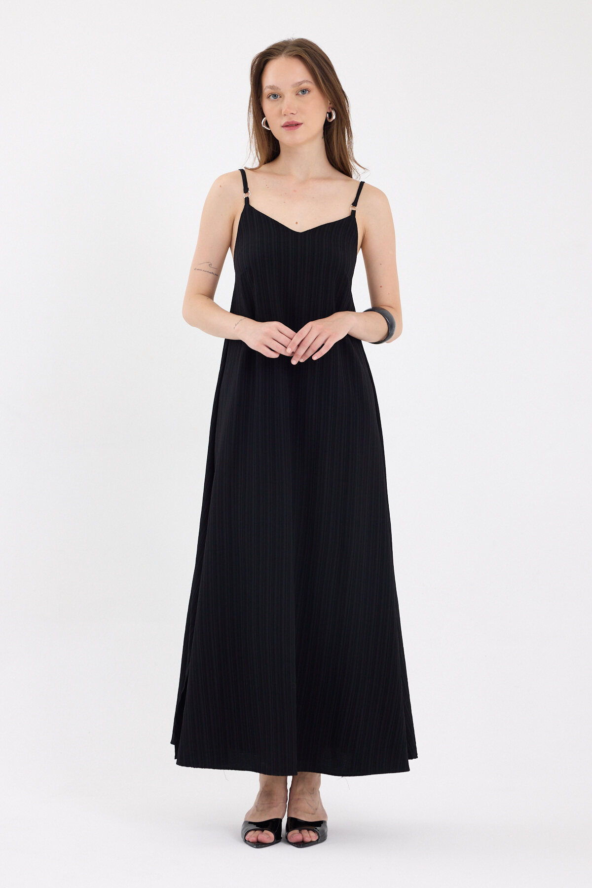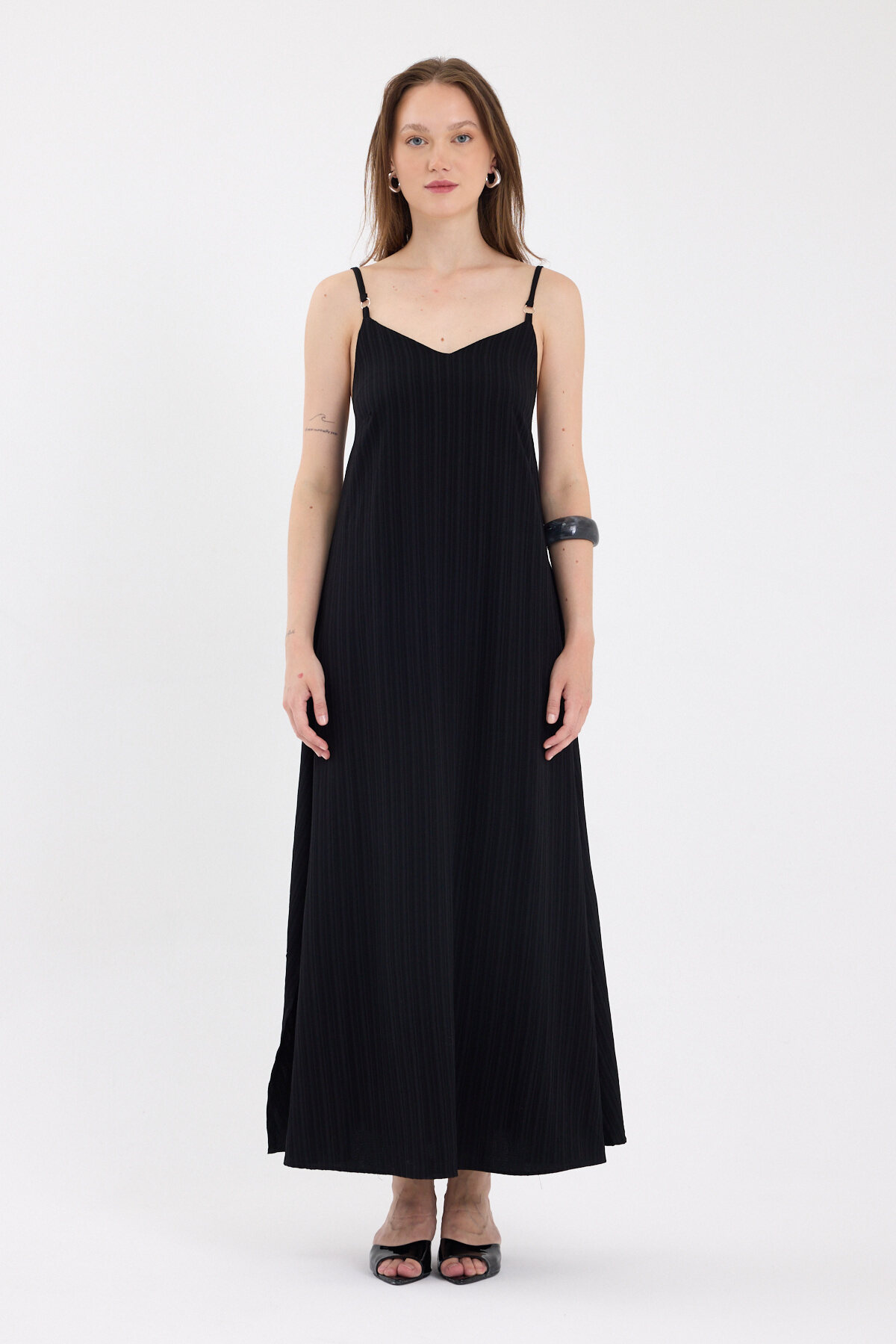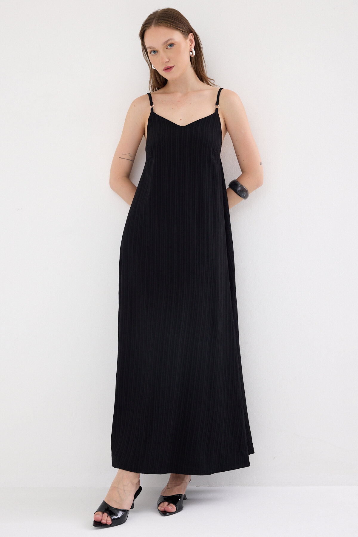 Siyah İnce Askılı V Yaka Uzun Elbise 8026A
