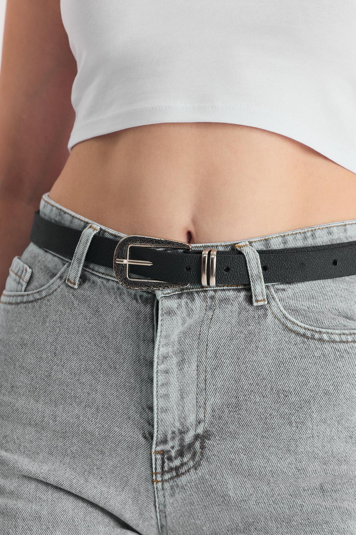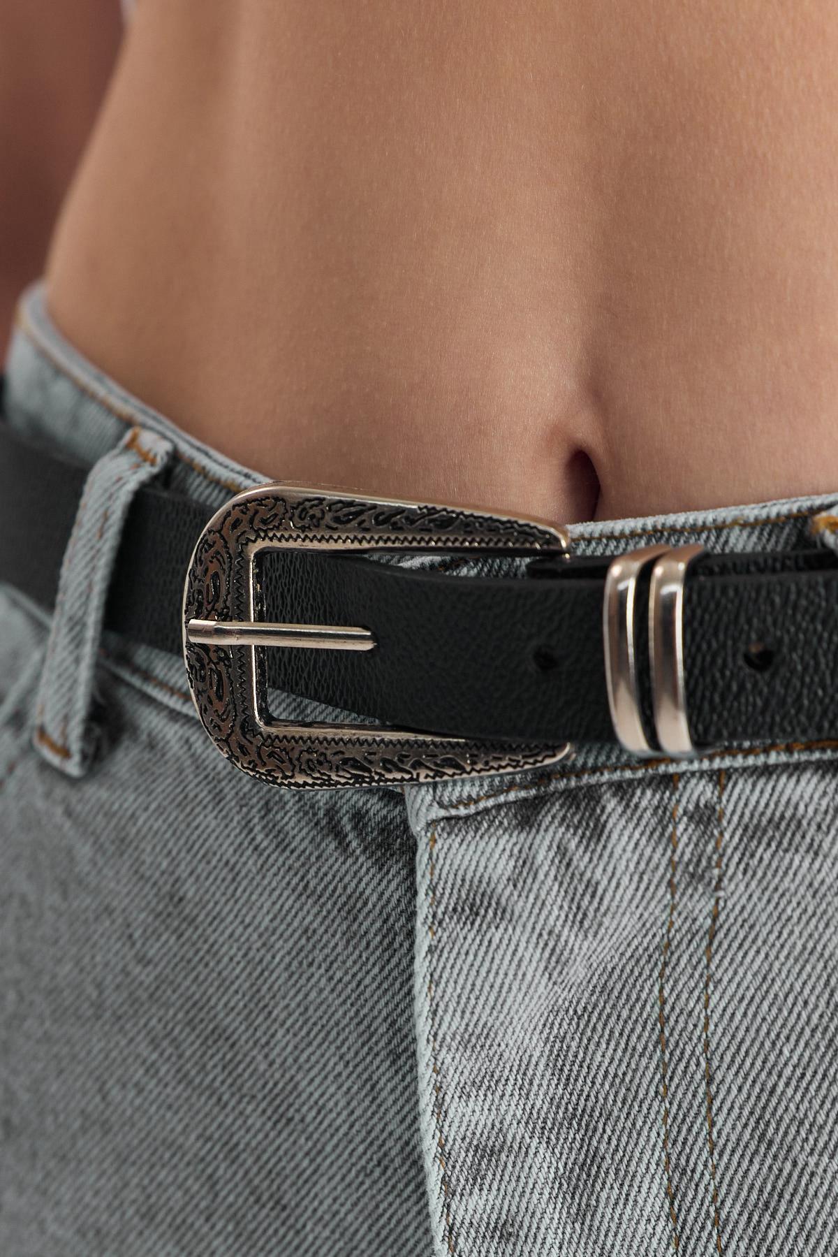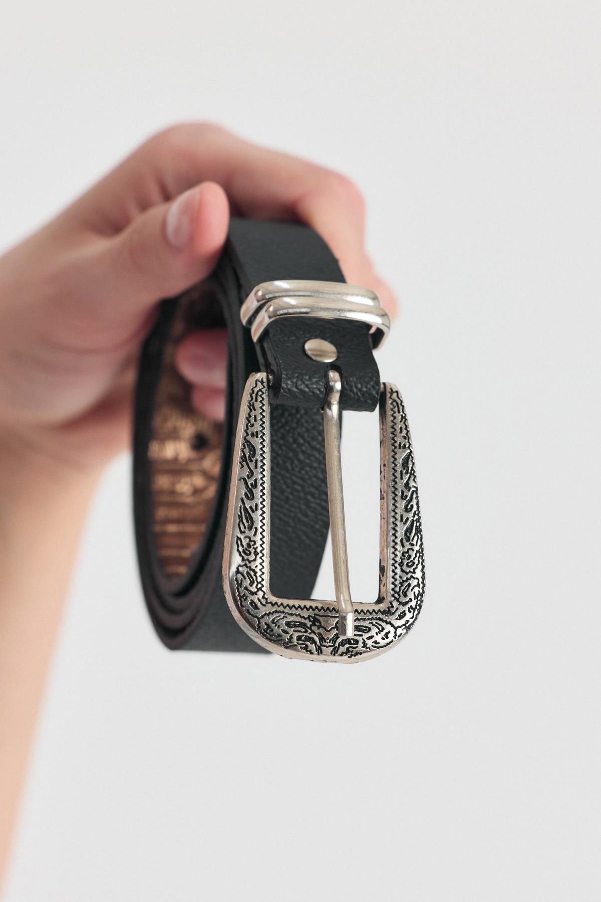Siyah İşleme Detay Gümüş Tokalı Kemer 419
