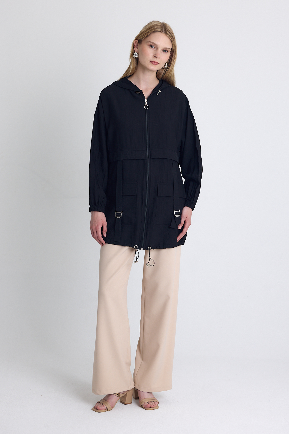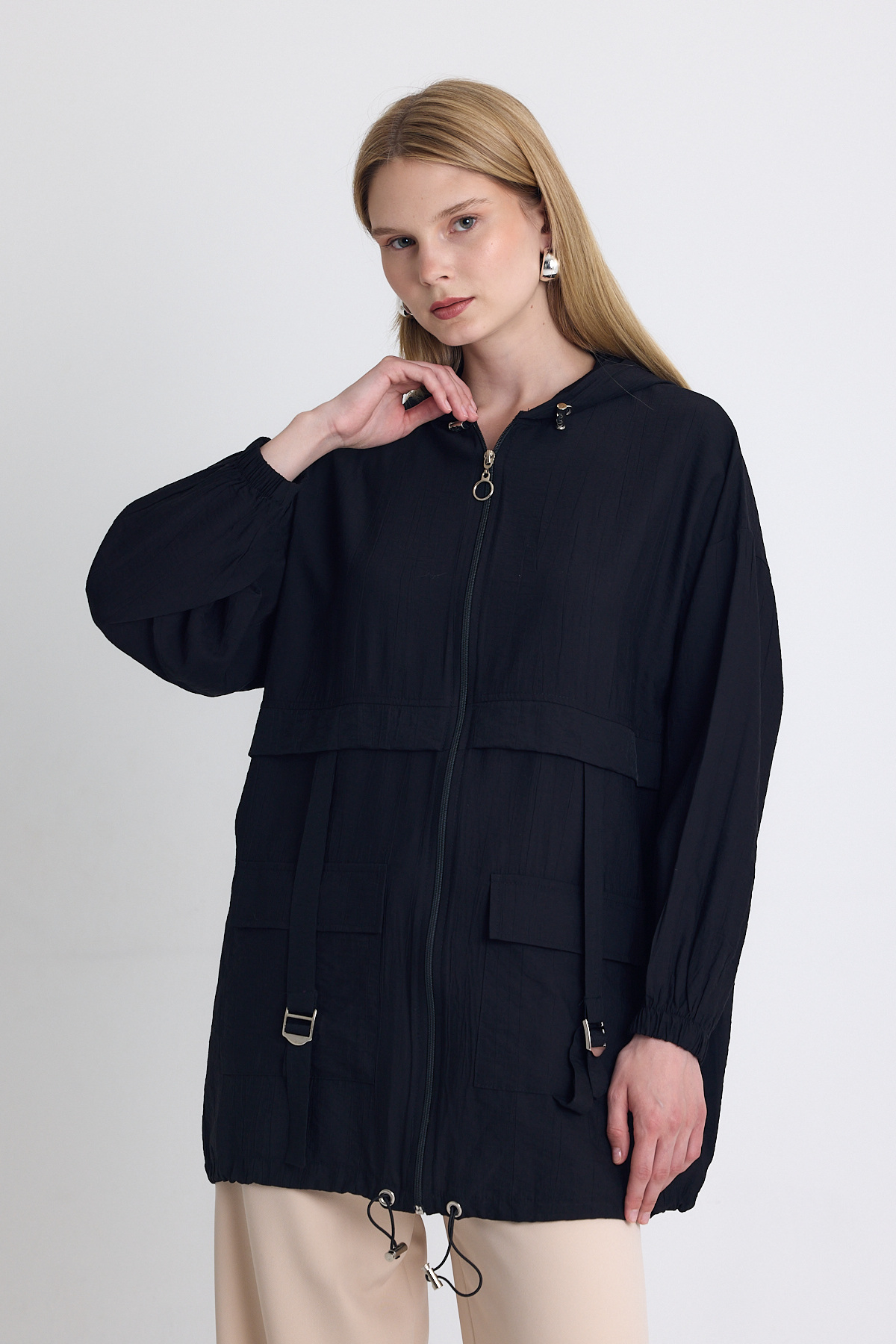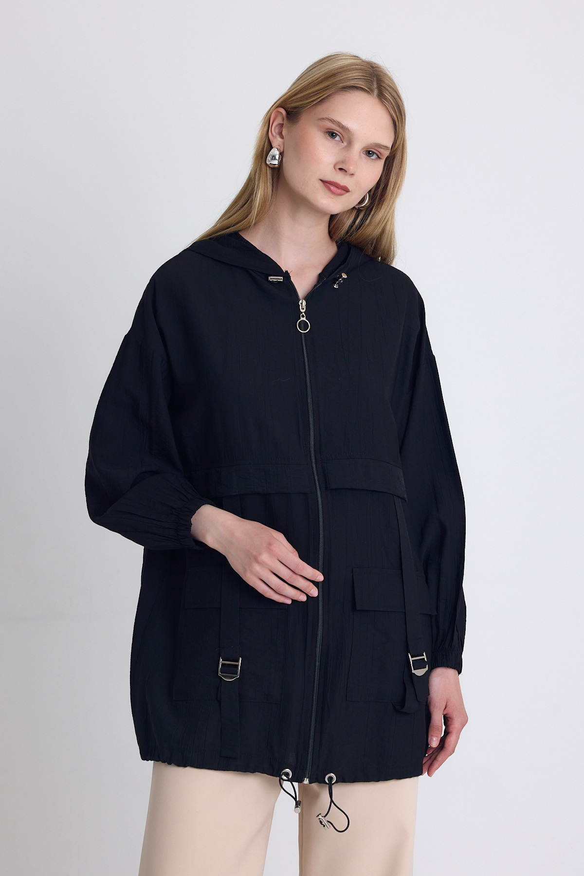 Siyah Kapüşonlu Cepli Fermuarlı Kap 4572A