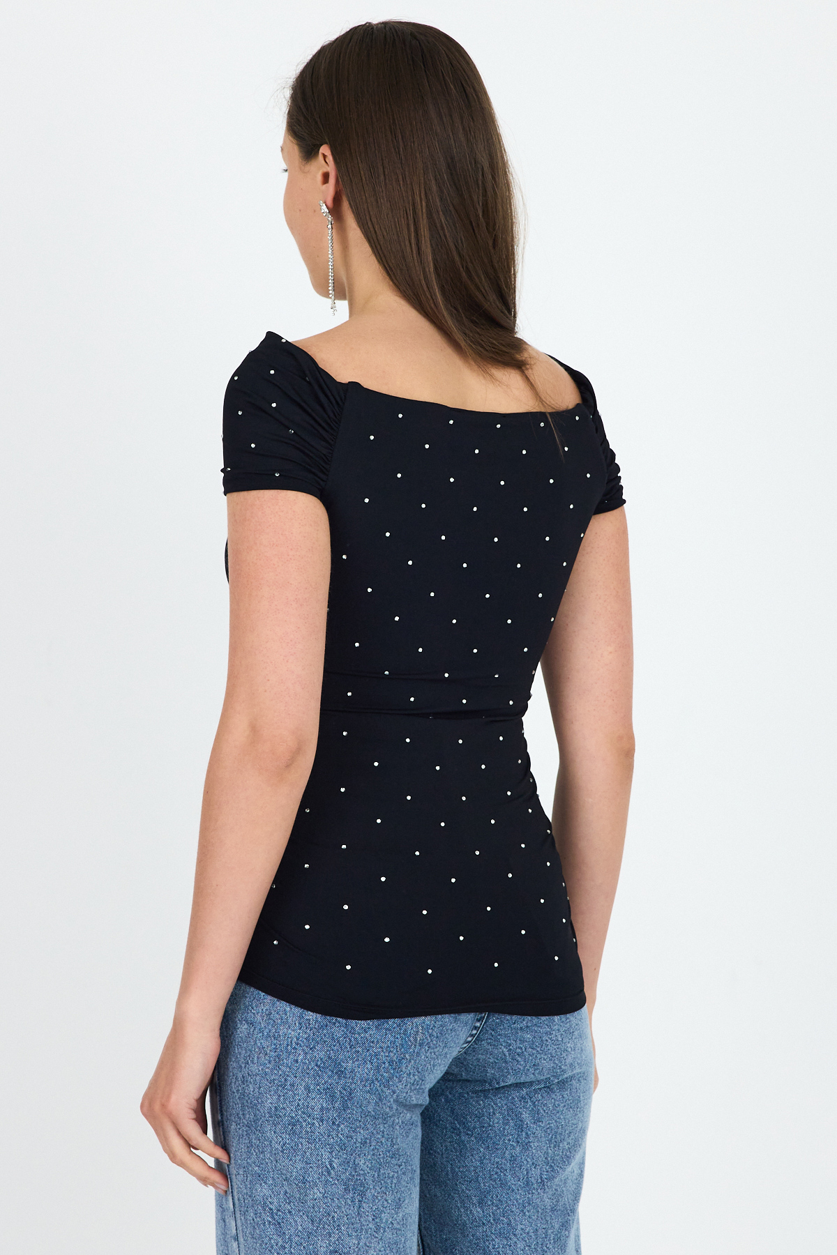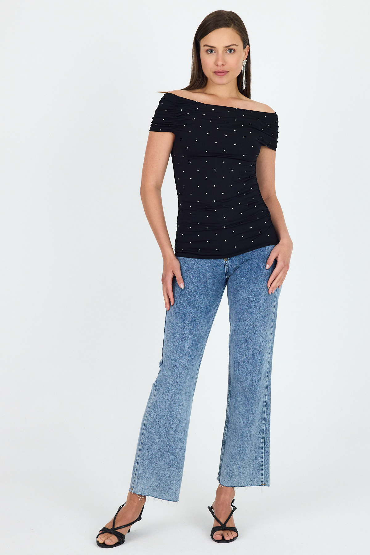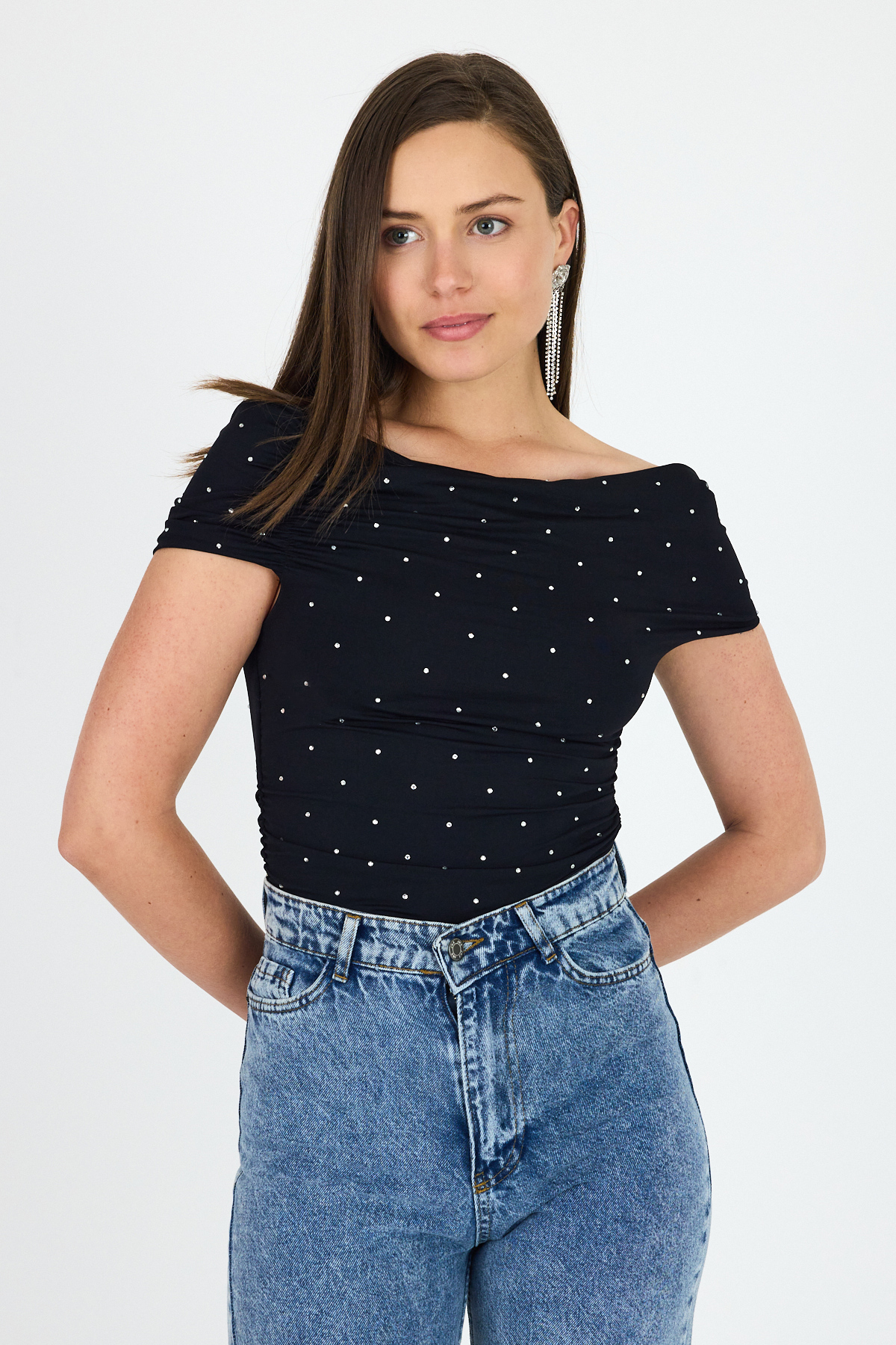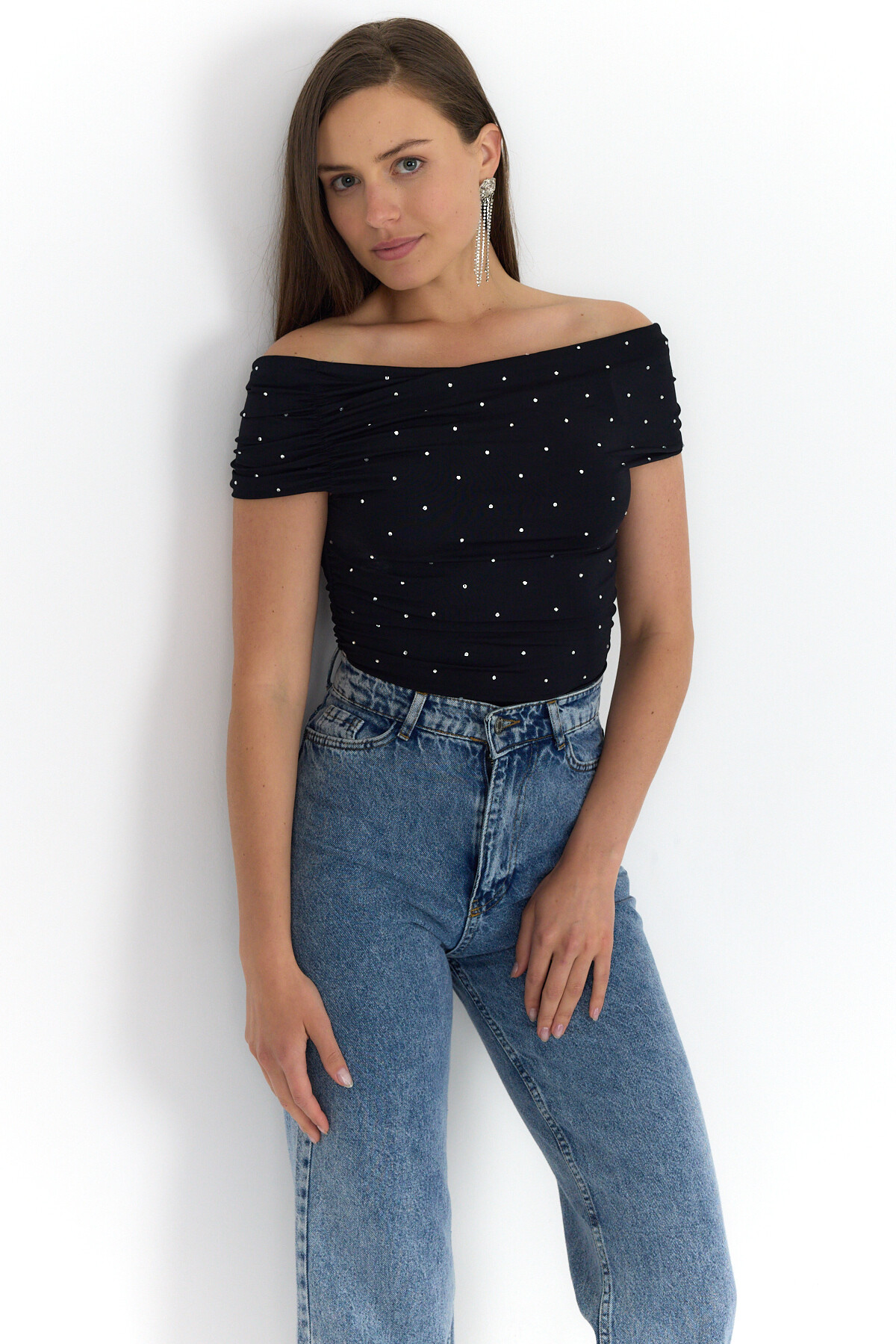 Siyah Kayık Yaka Taş Detaylı Büzgülü Bluz 2462