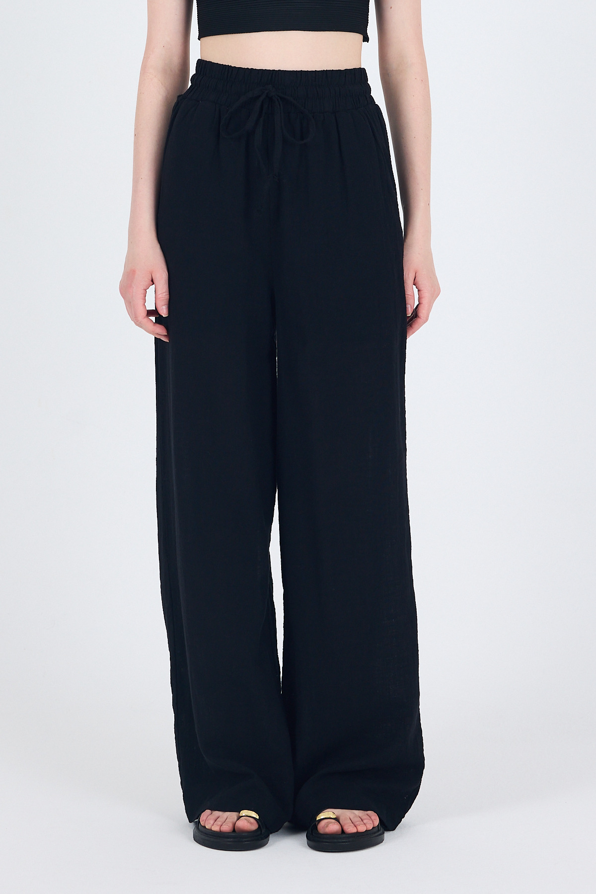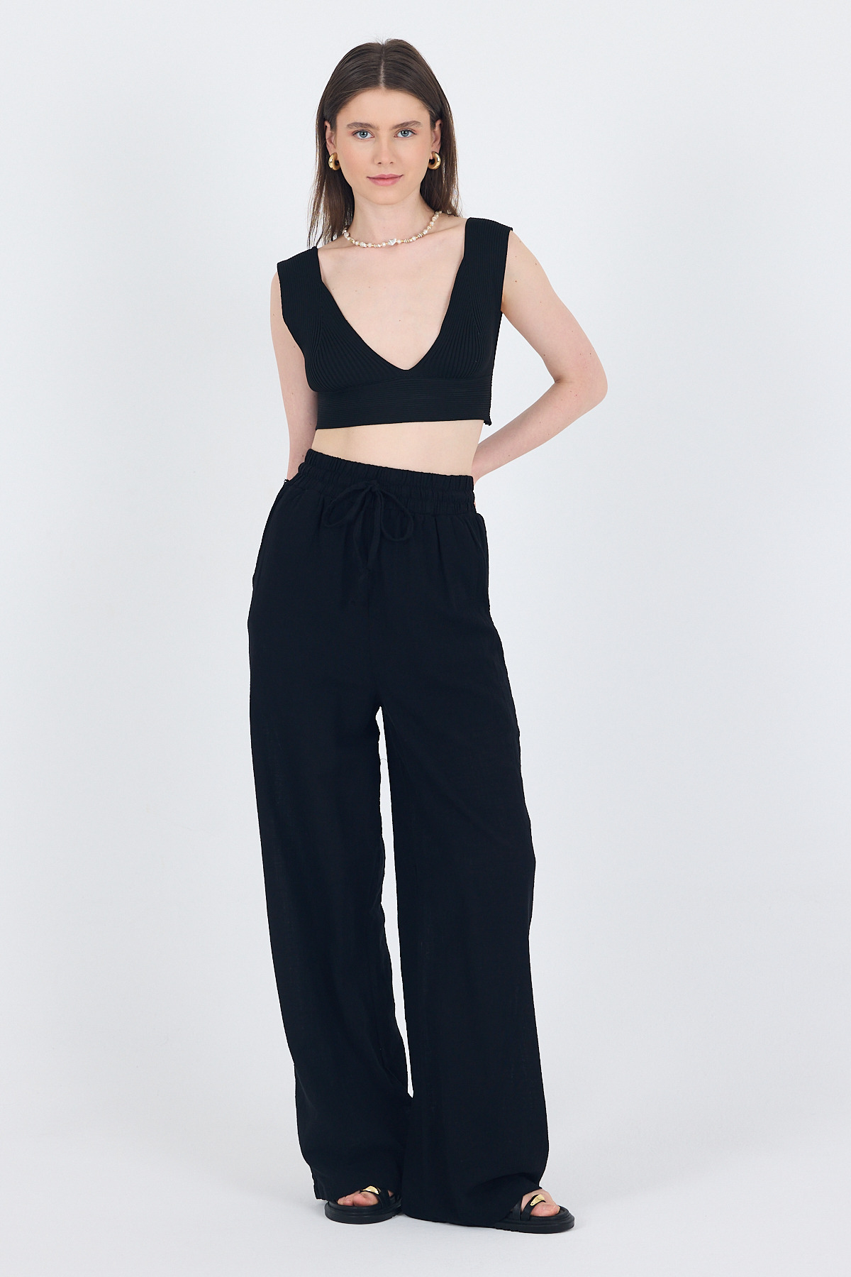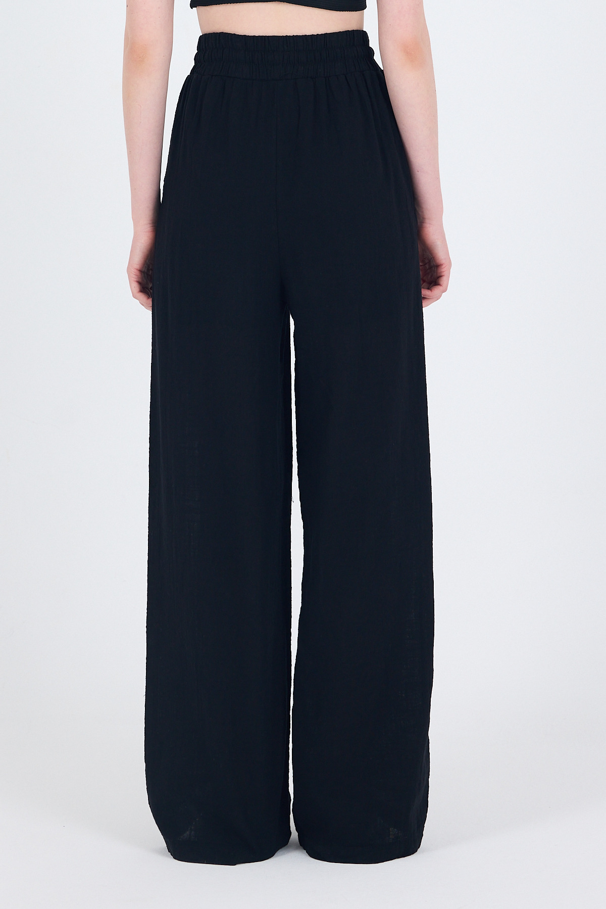 Siyah Keten Görünümlü %100 Pamuk Bol Paça Pantolon 3040