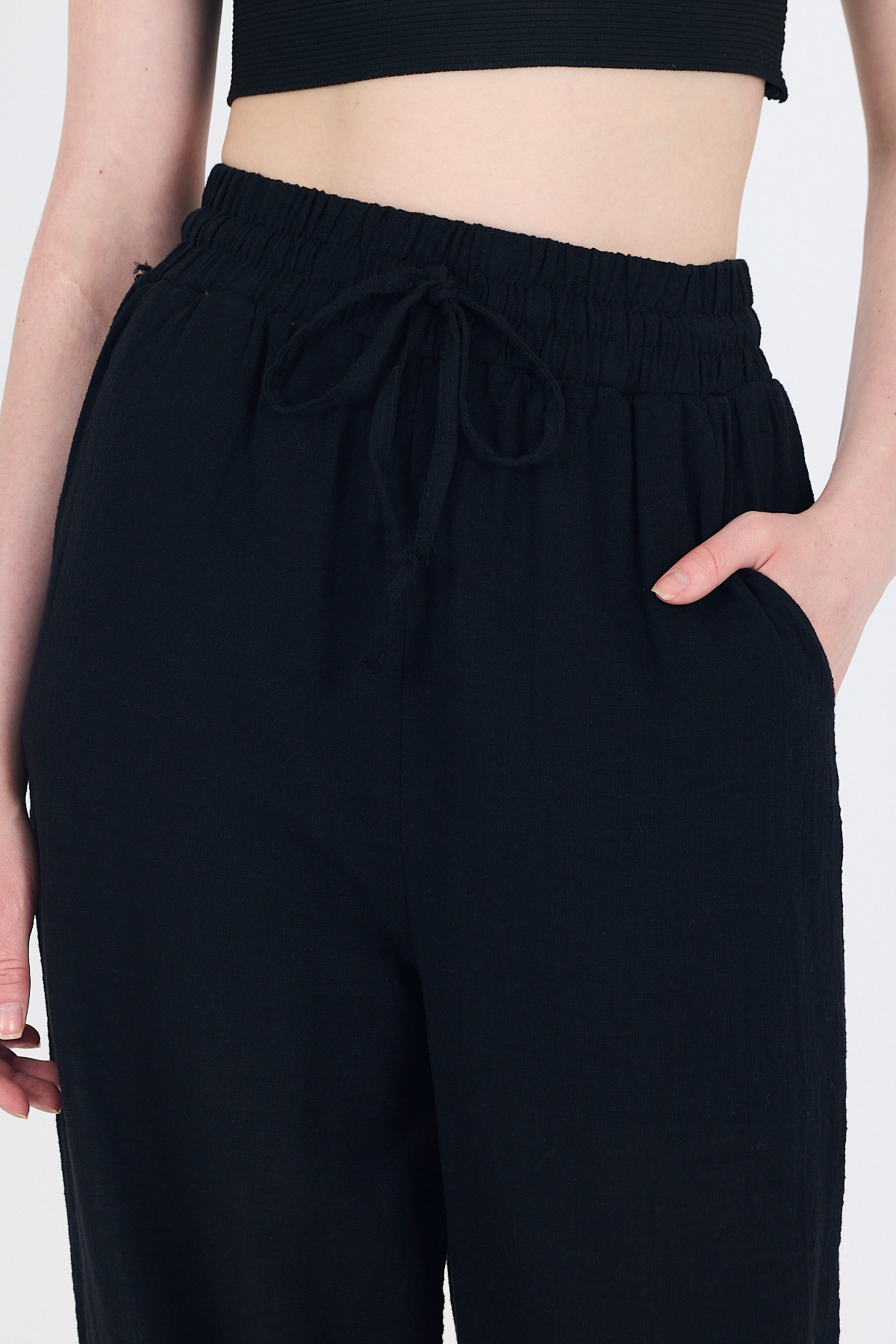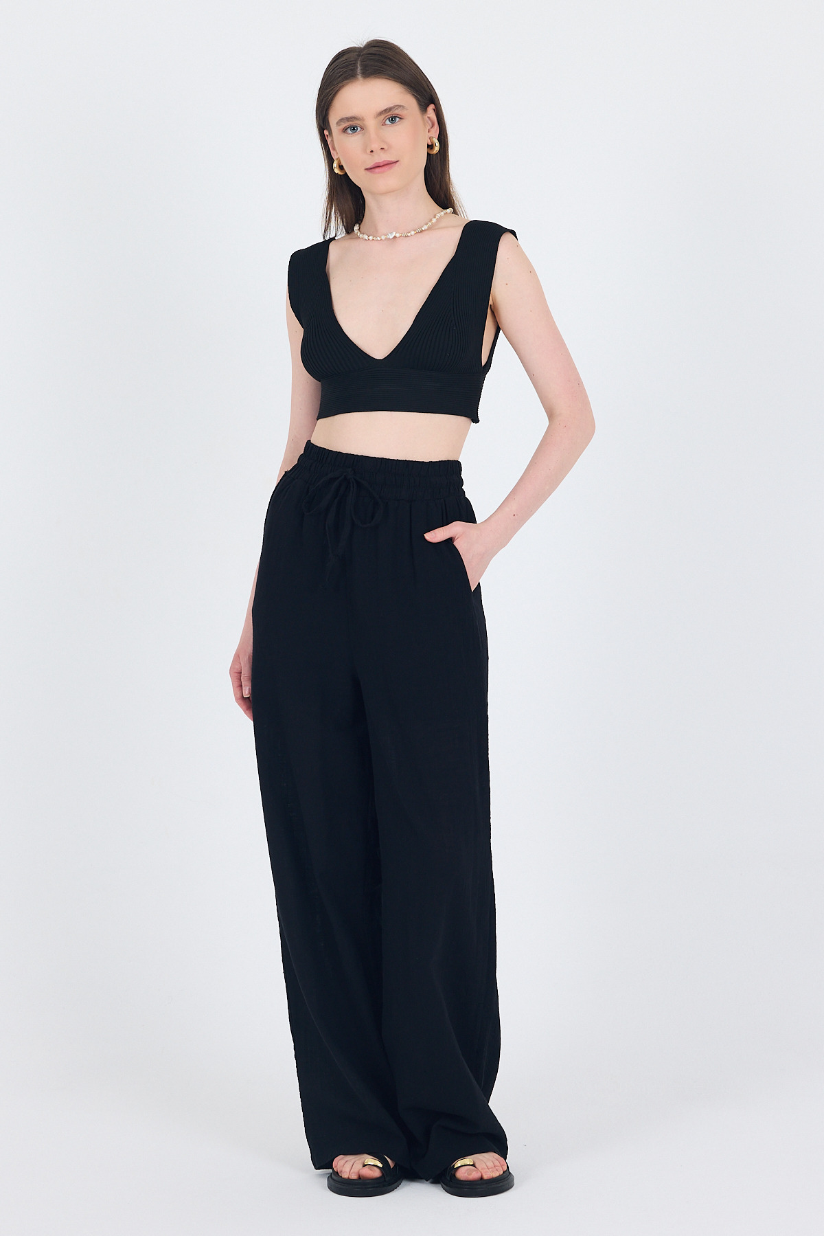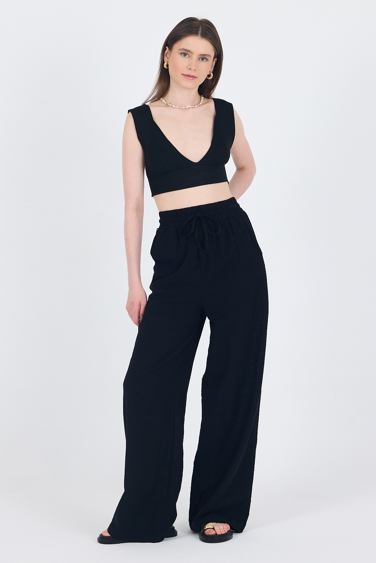 Siyah Keten Görünümlü %100 Pamuk Bol Paça Pantolon 3040