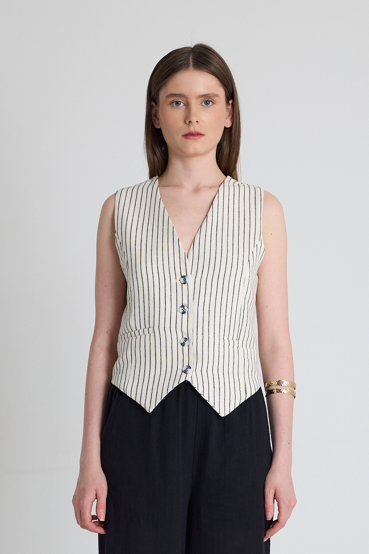 Siyah Keten Görünümlü %100 Pamuk Çizgili Yelek 2323