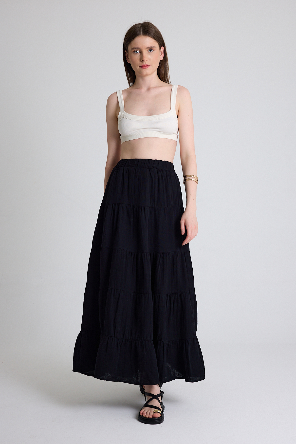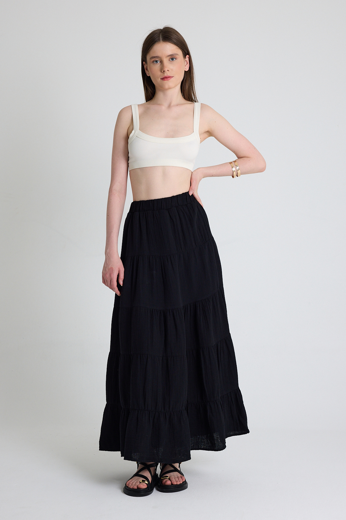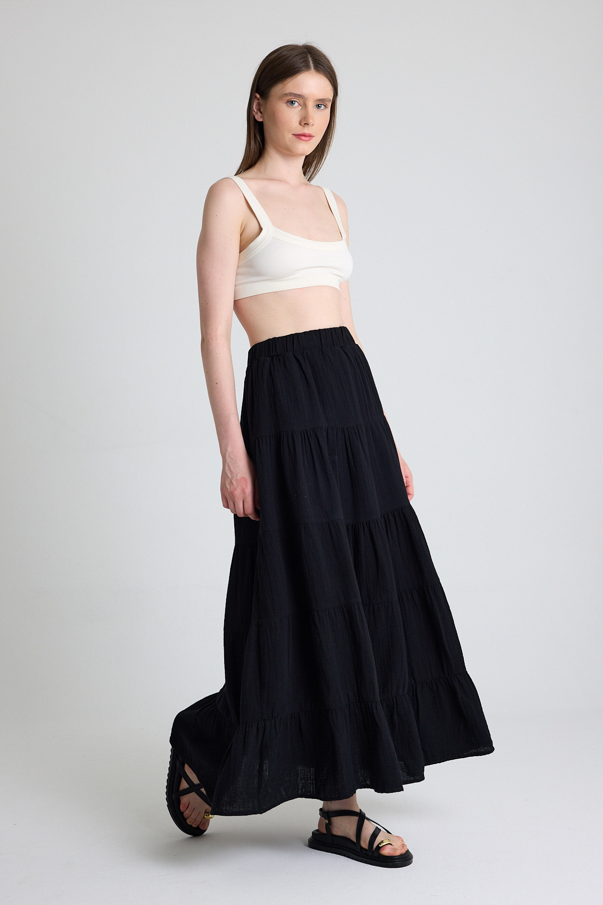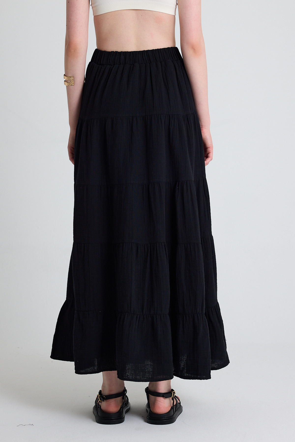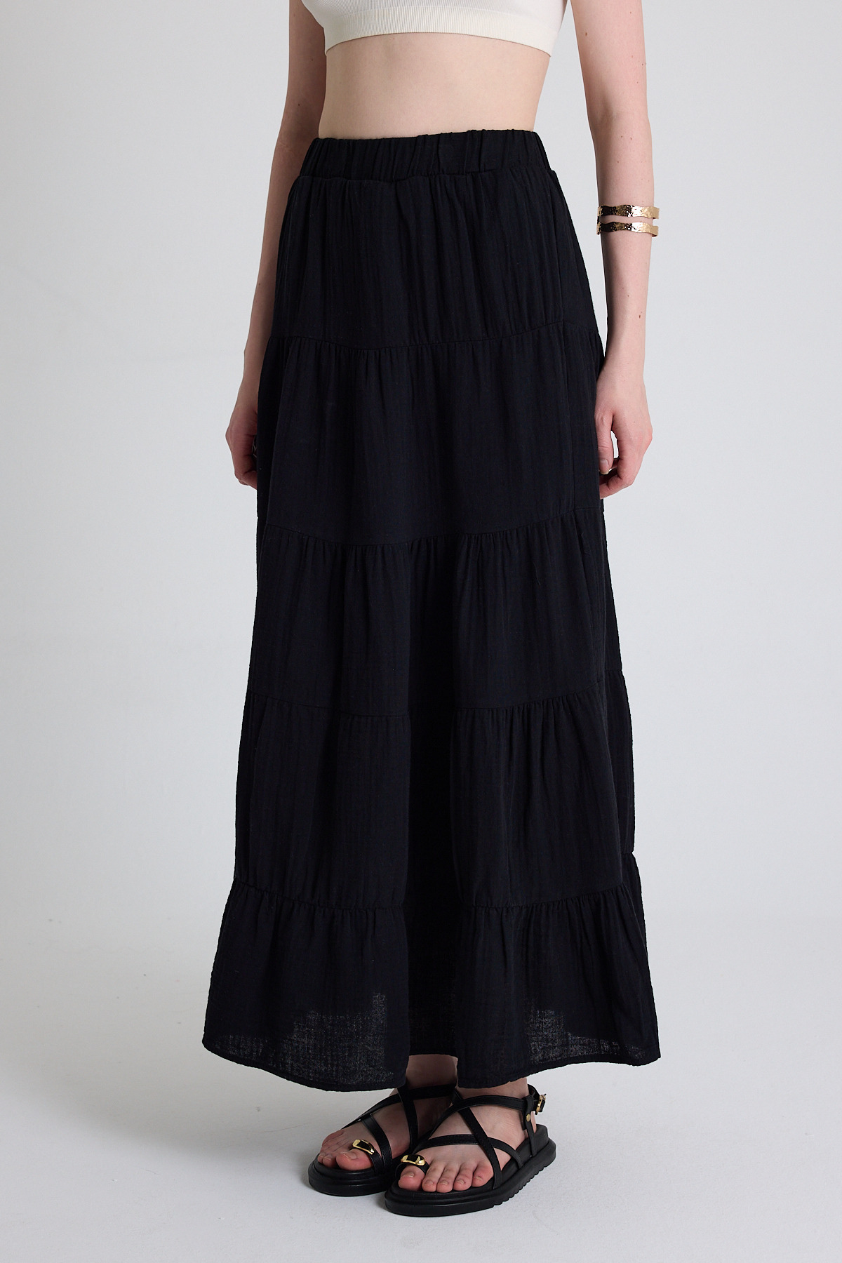 Siyah Keten Görünümlü %100 Pamuk Kat Kat Uzun Etek 4801A