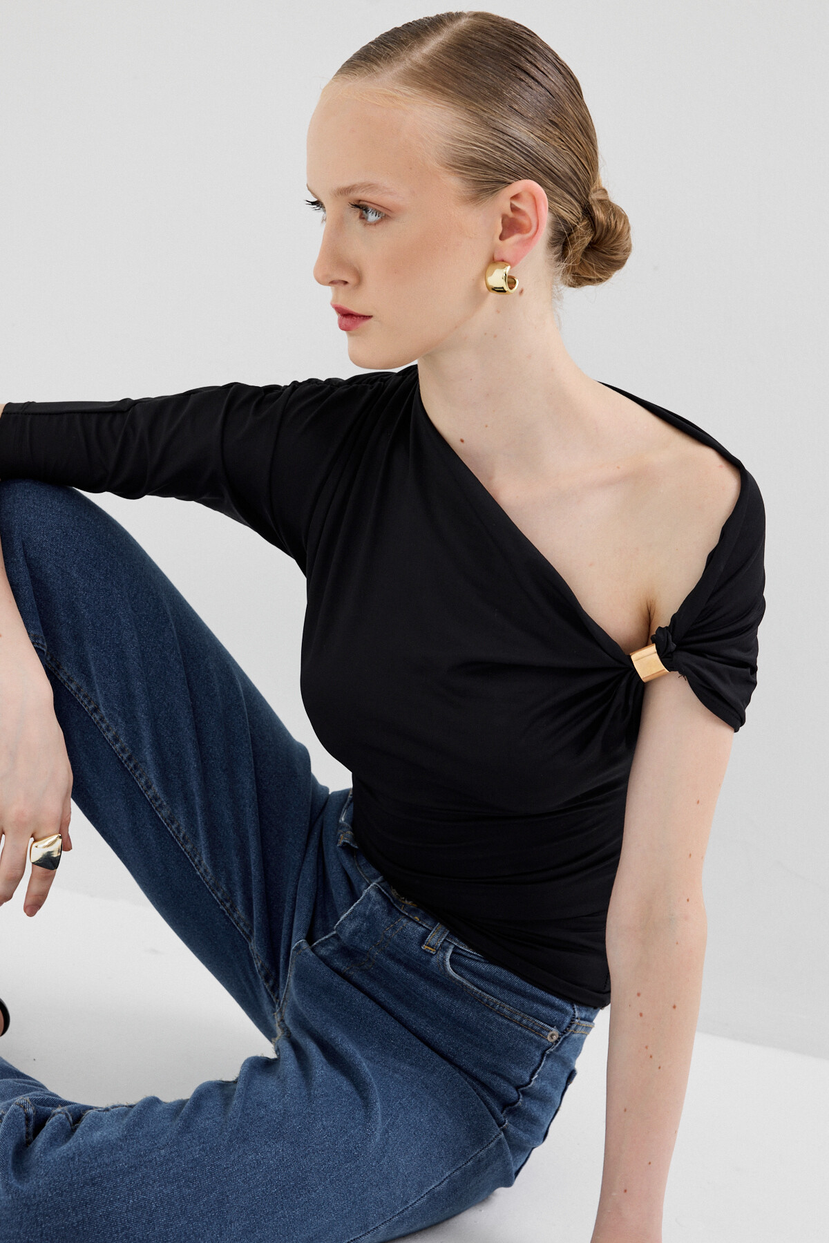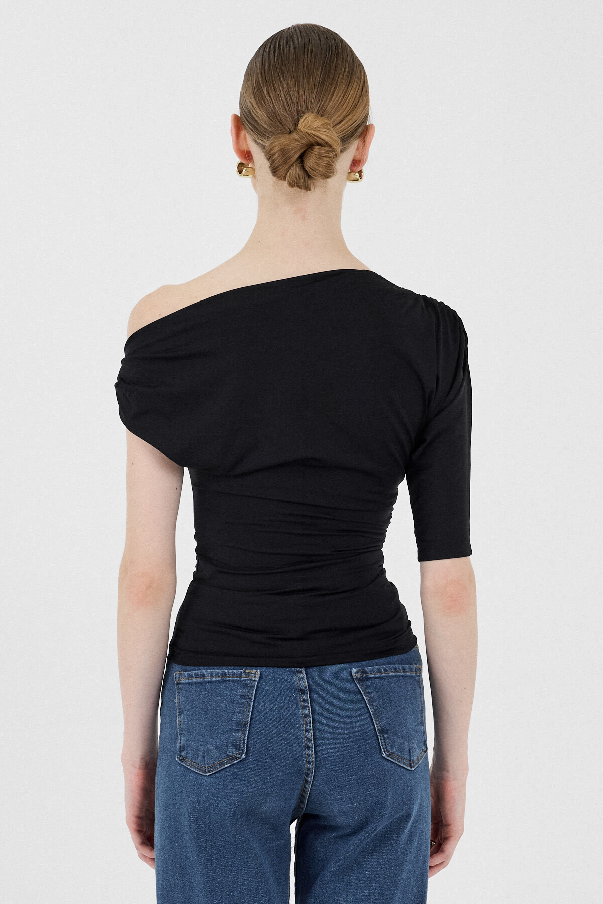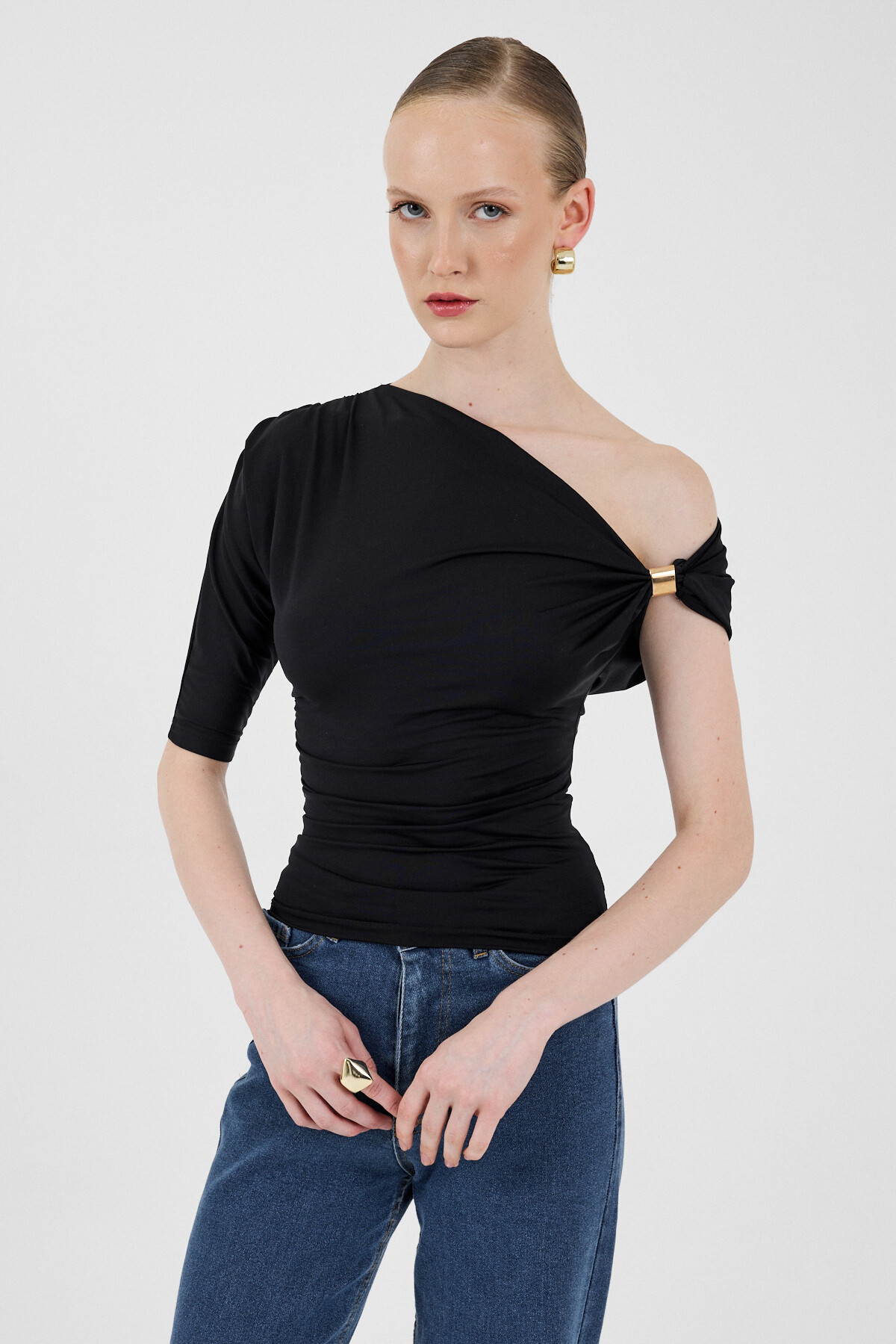 Siyah Omuz Aksesuar Detaylı Yarım Kol Bluz 2490