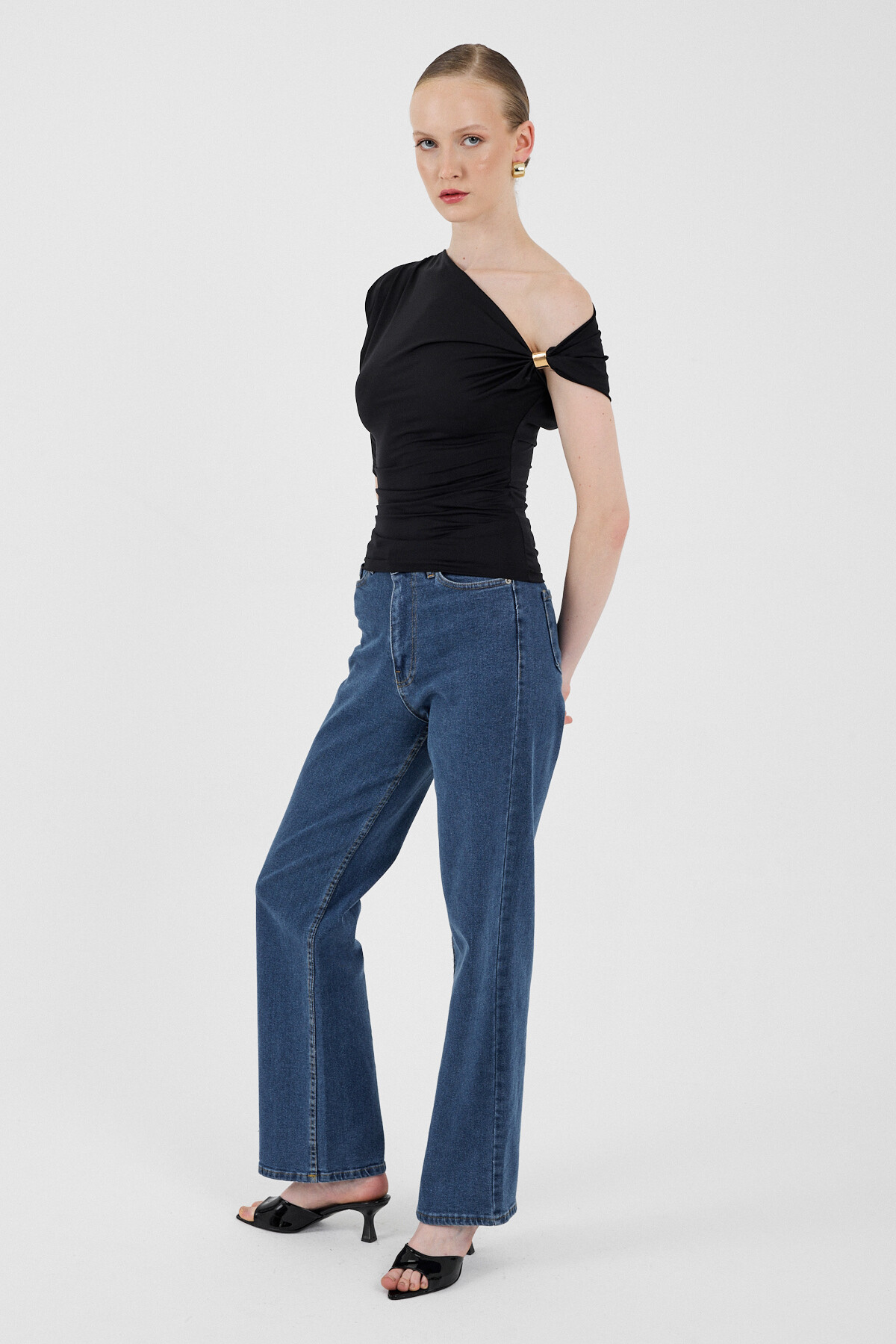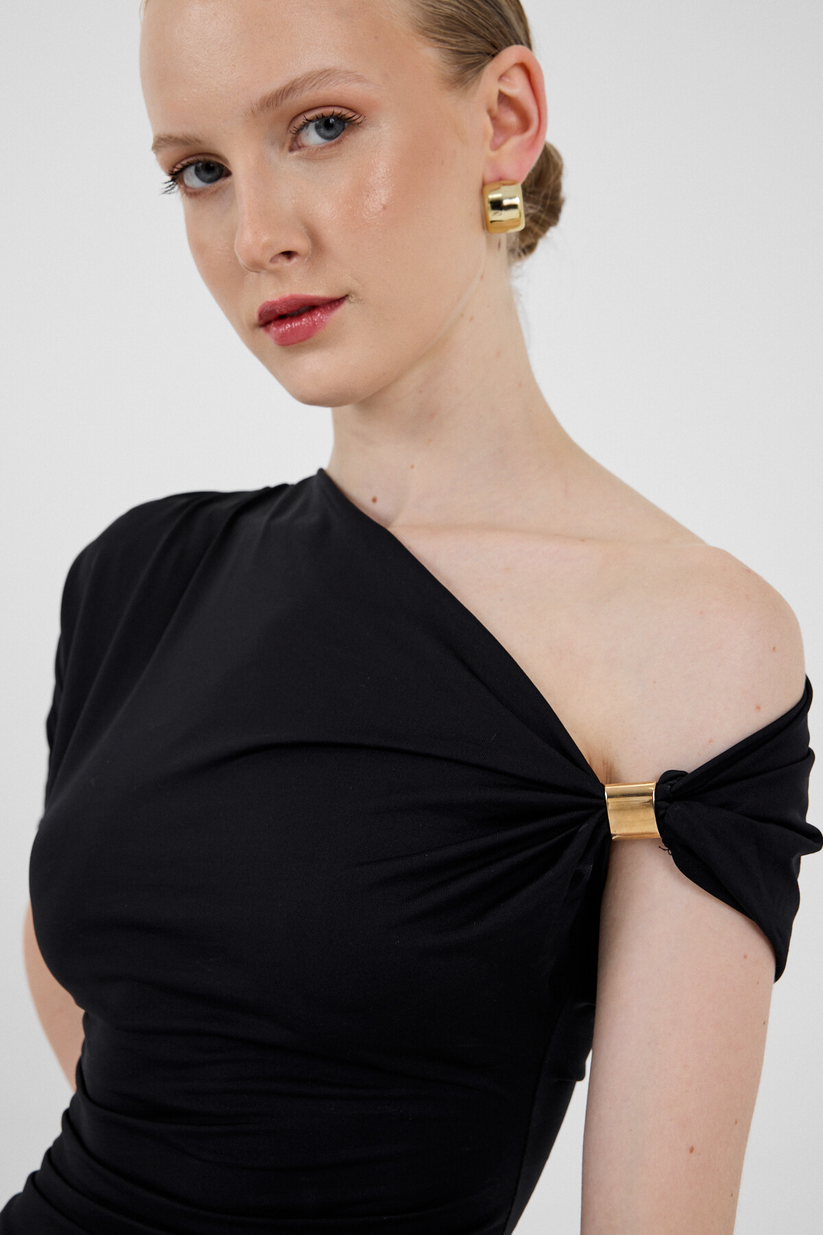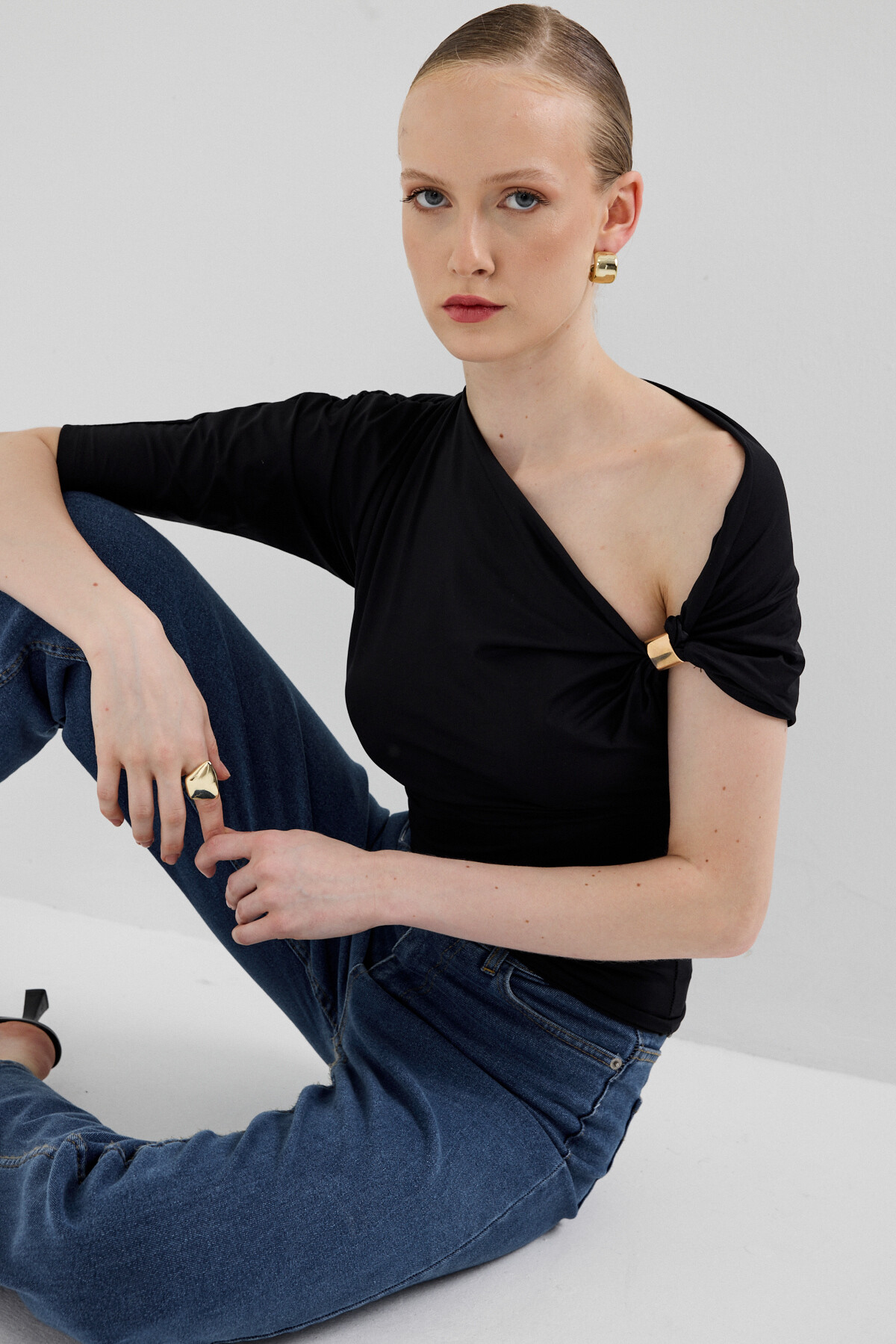 Siyah Omuz Aksesuar Detaylı Yarım Kol Bluz 2490