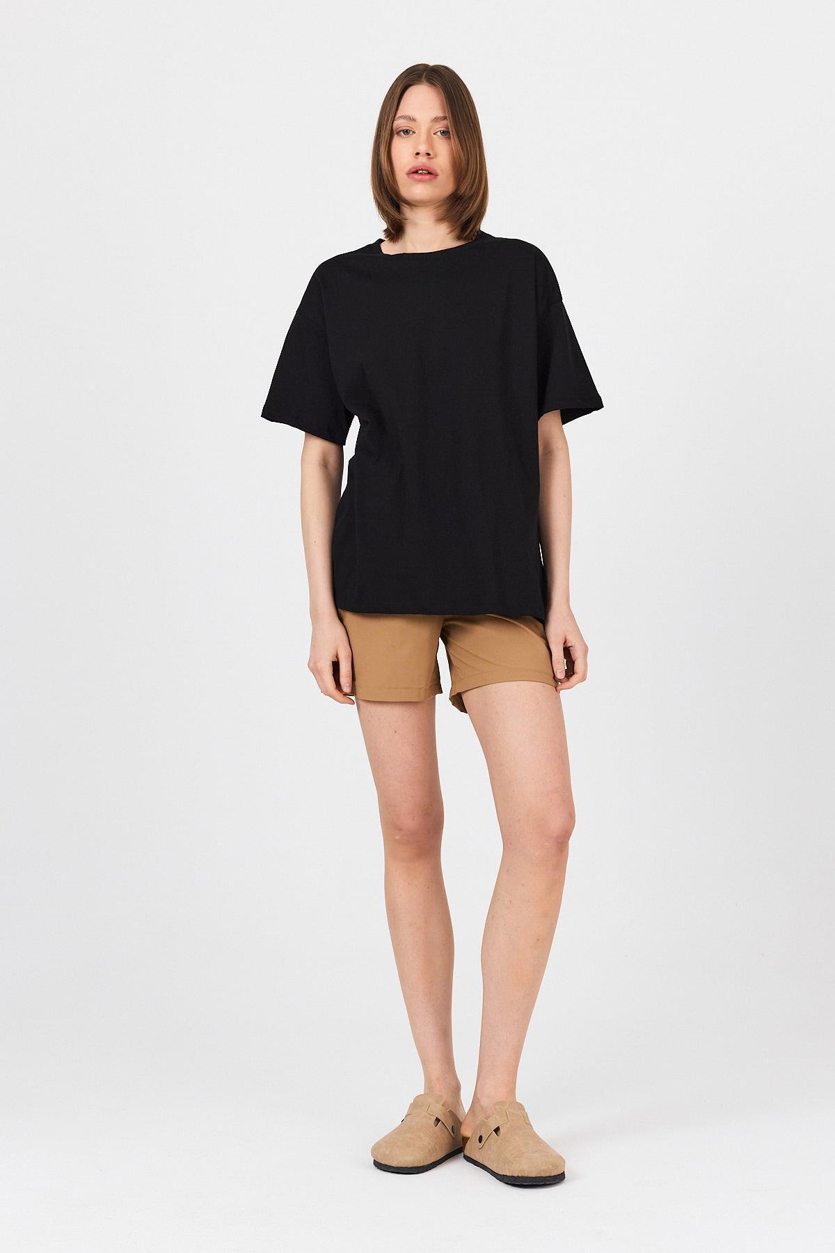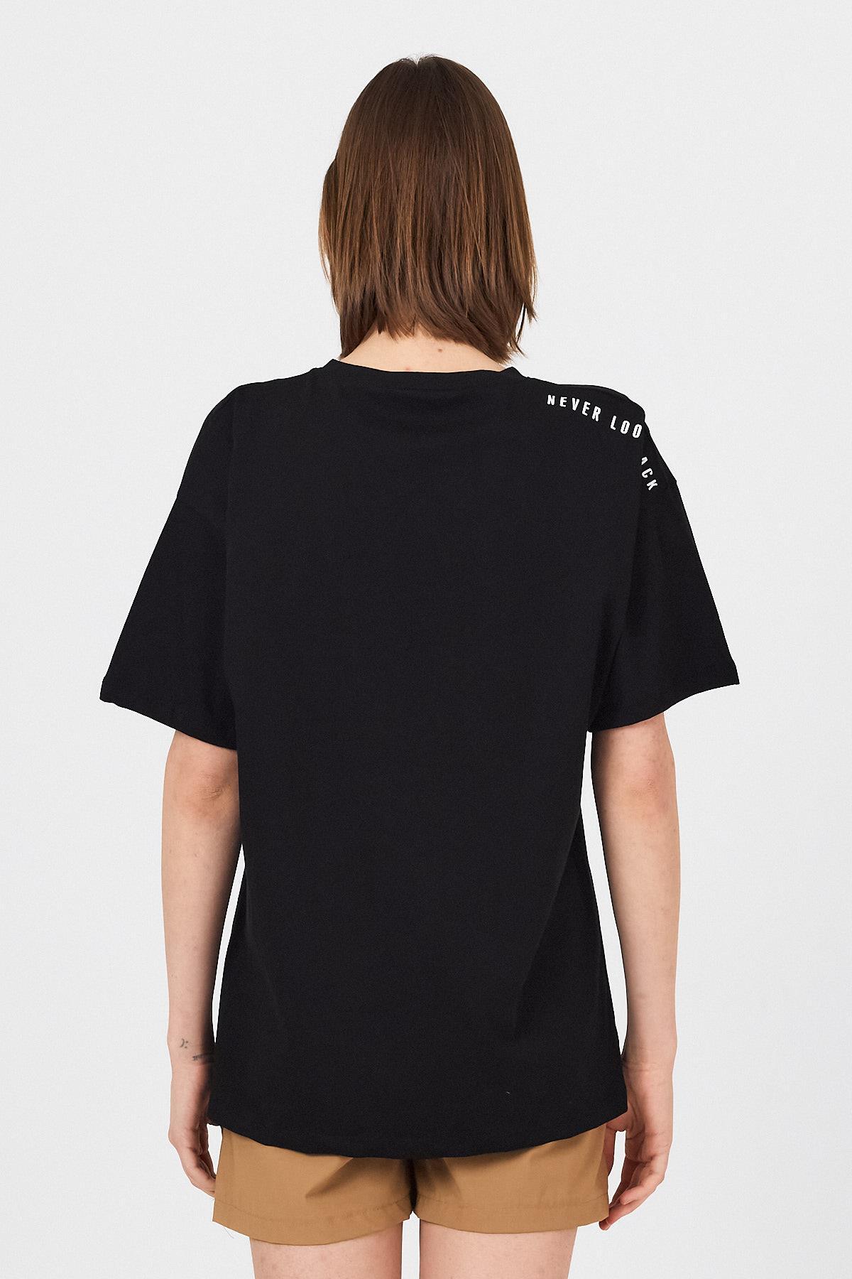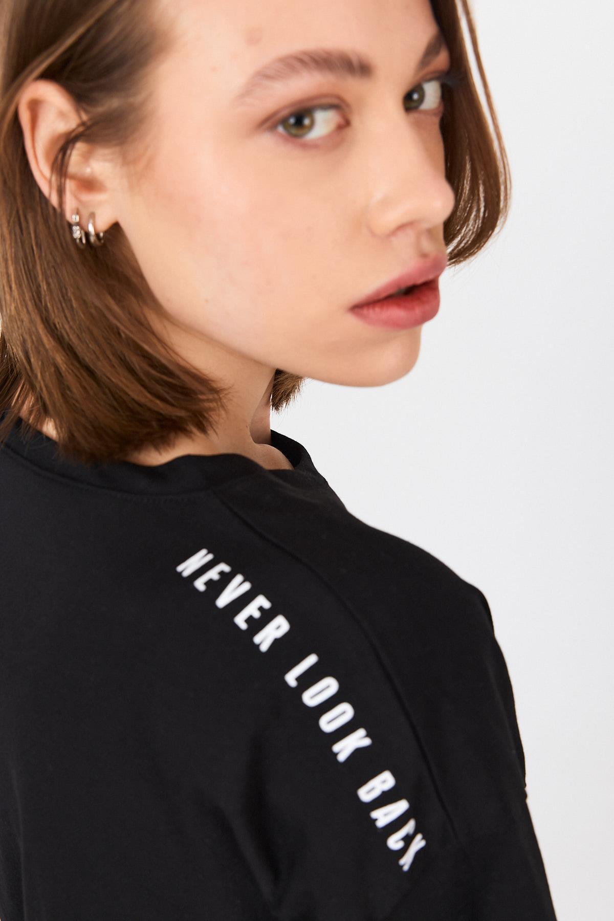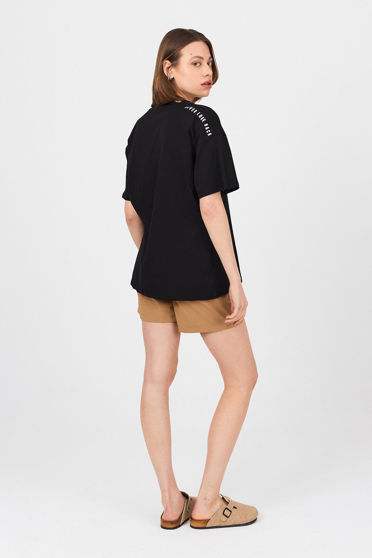 Siyah Omuz Yazı Baskılı %100 Pamuk Oversize Tişört 2150-30M