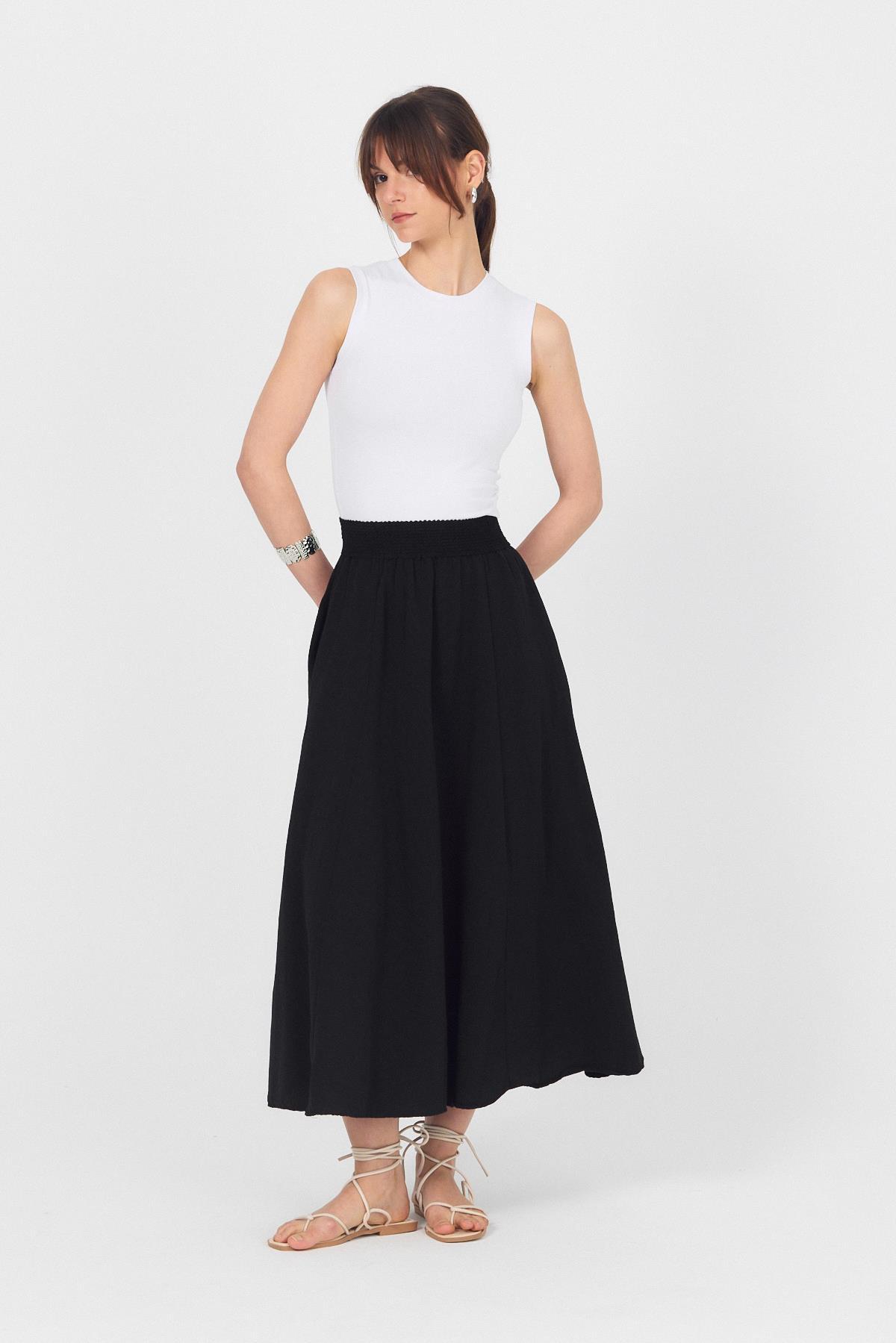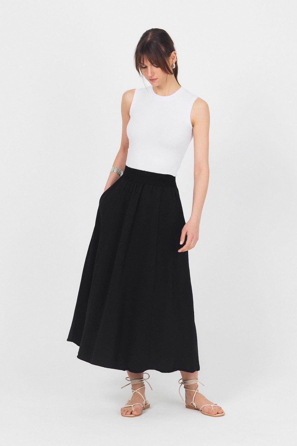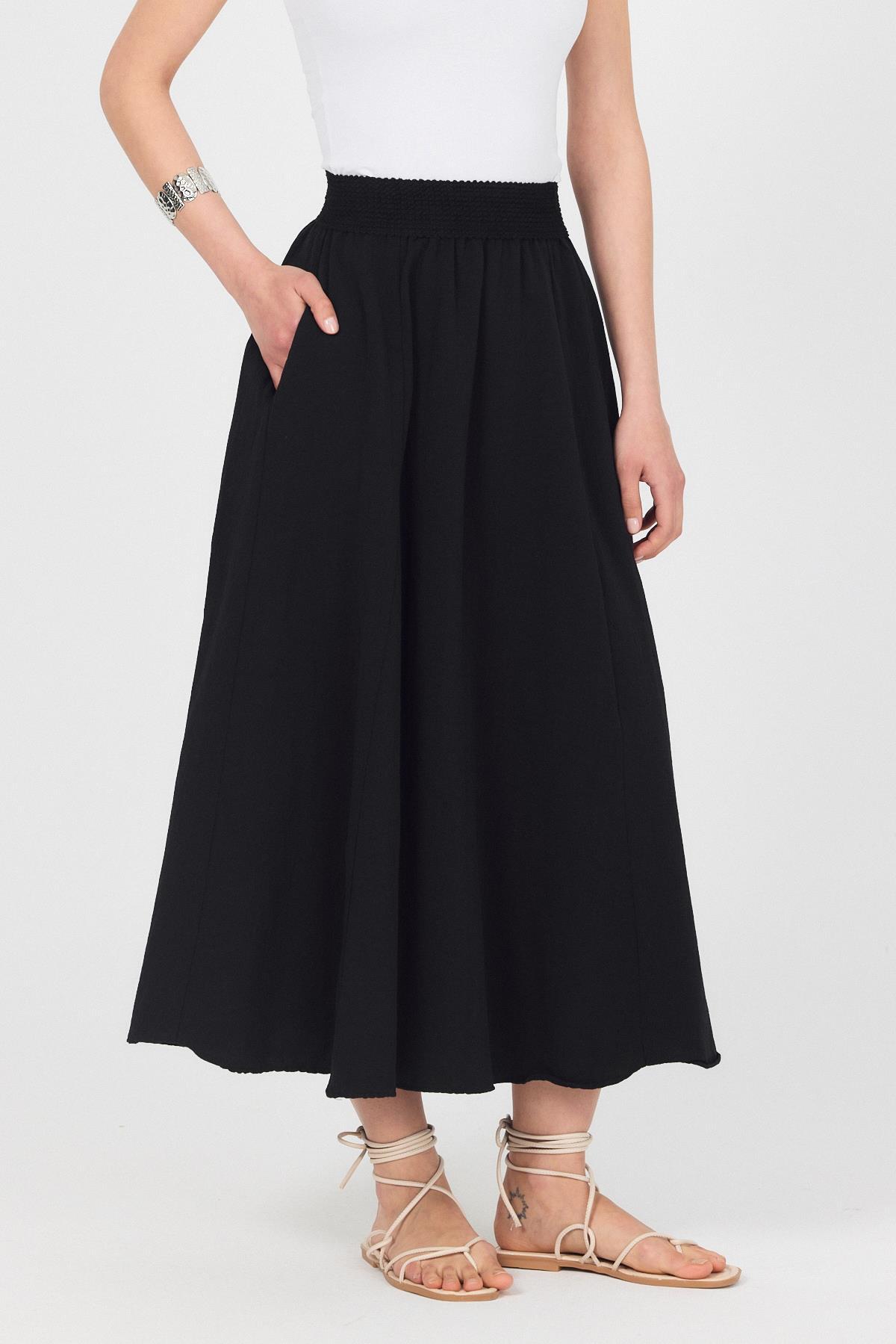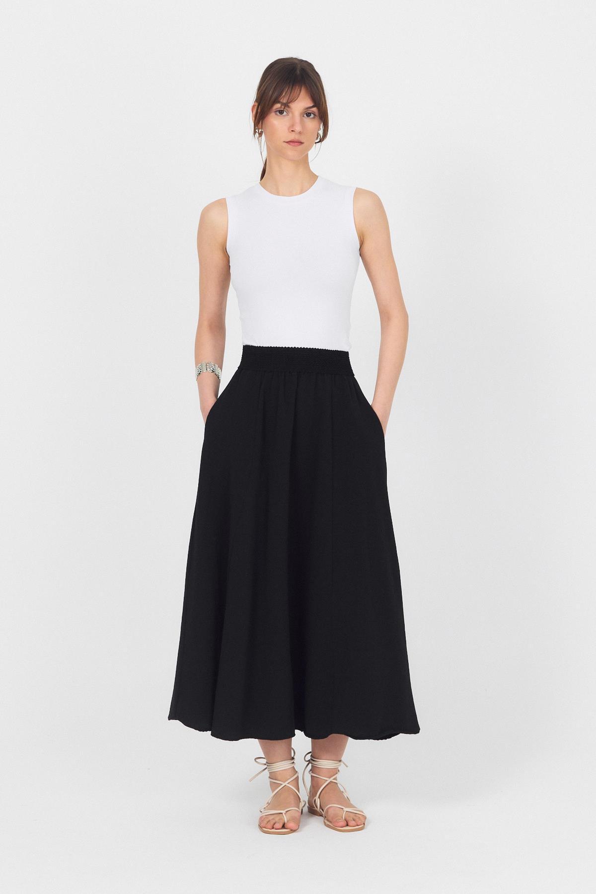 Siyah Örgü Kemer Detay Cepli Midi Etek 3027
