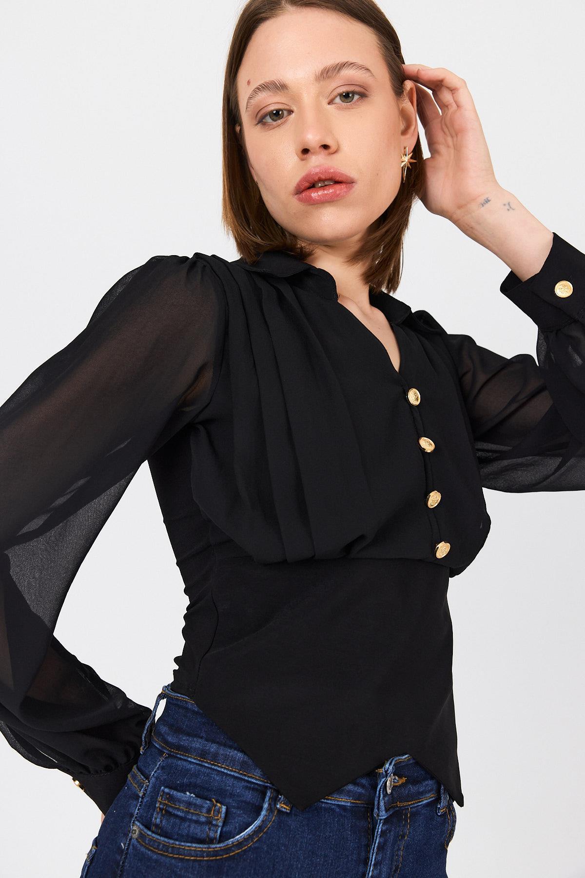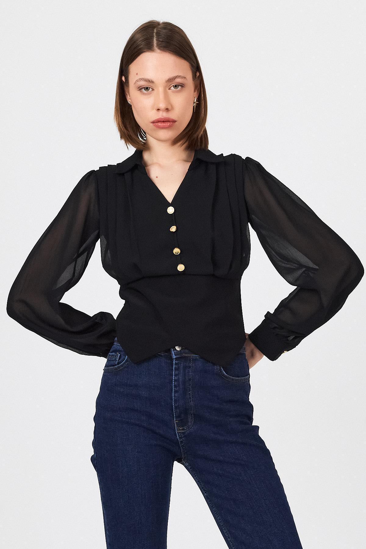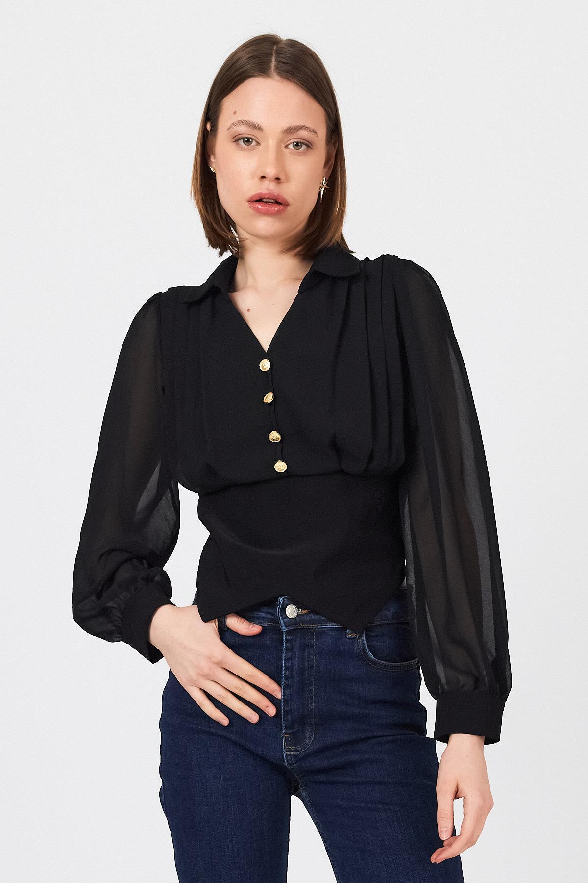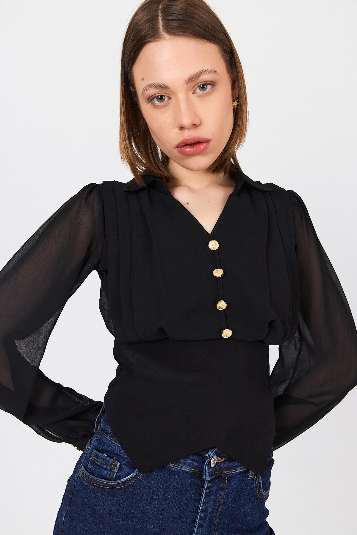Siyah Pileli Gömlek Yaka Düğmeli Bluz 9471