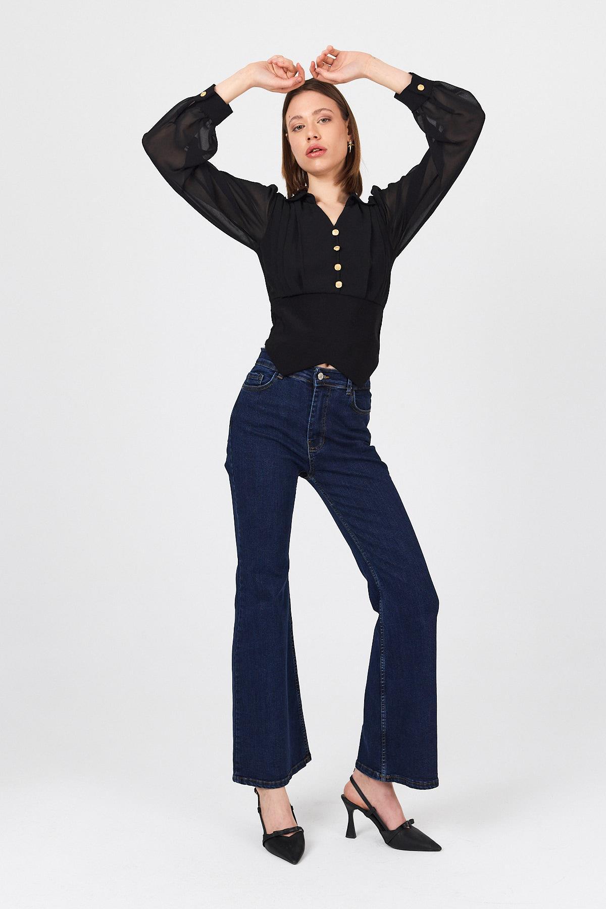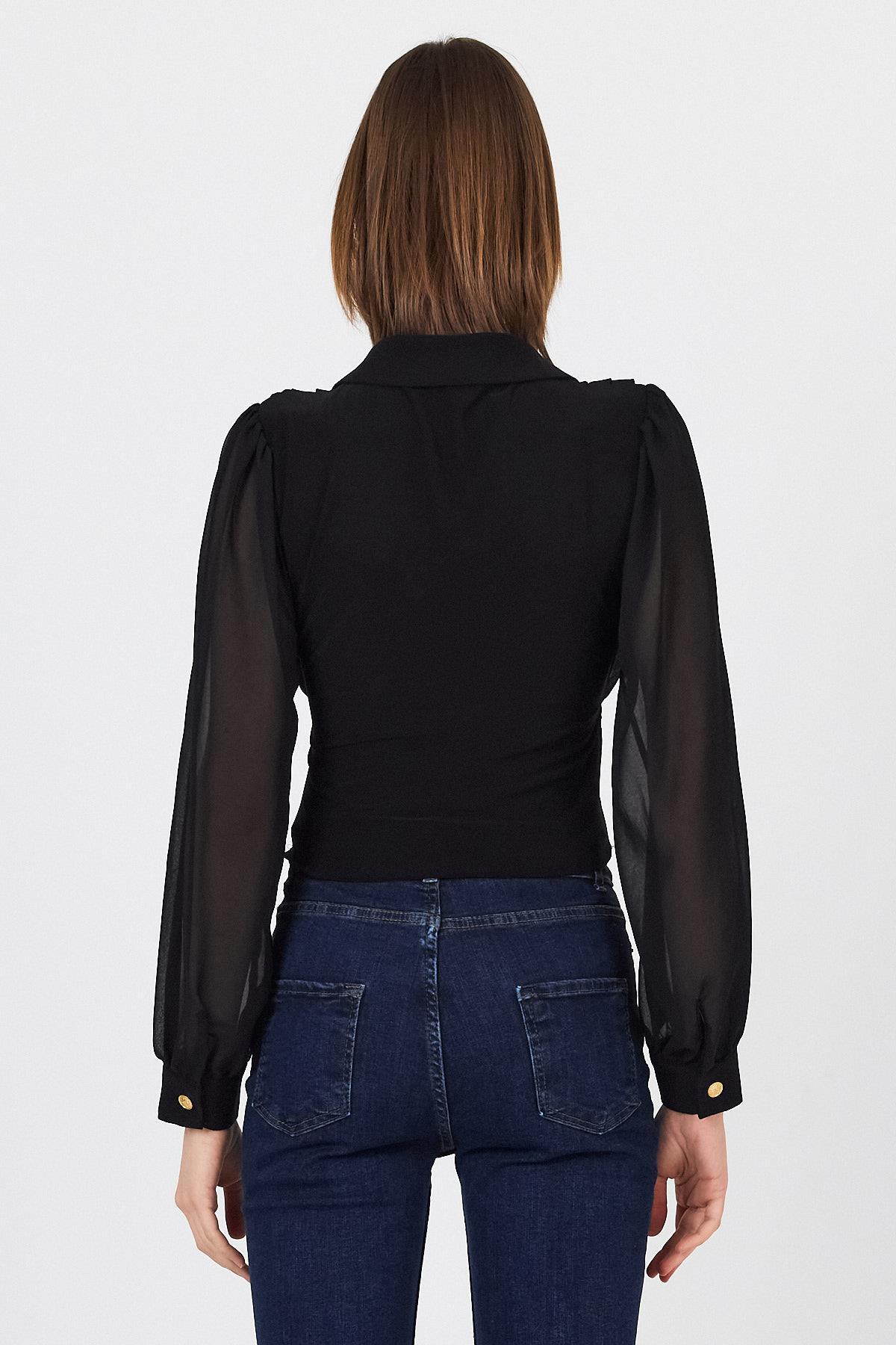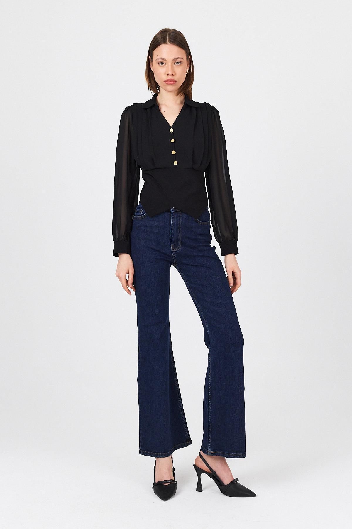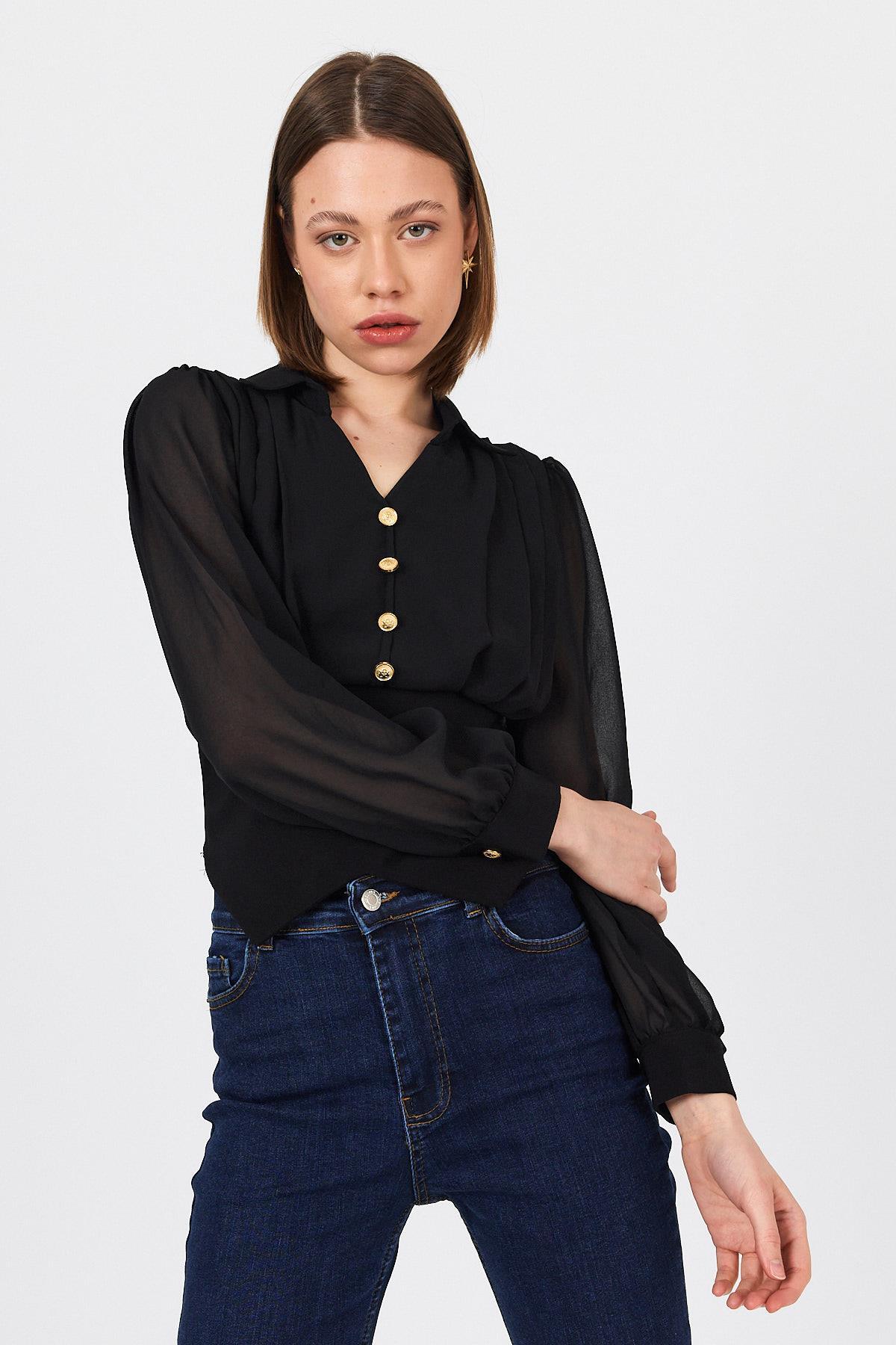 Siyah Pileli Gömlek Yaka Düğmeli Bluz 9471
