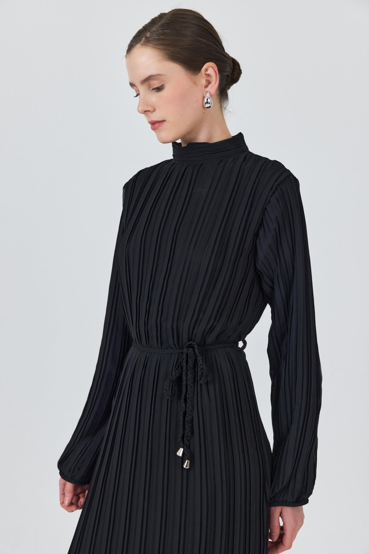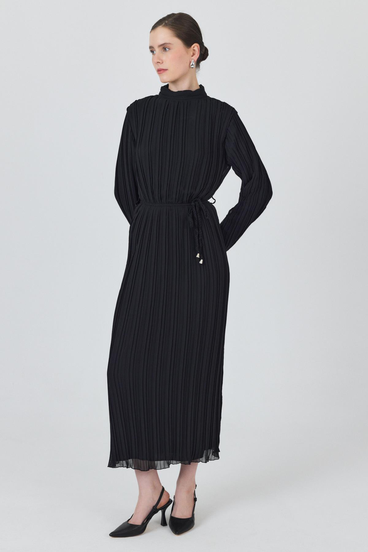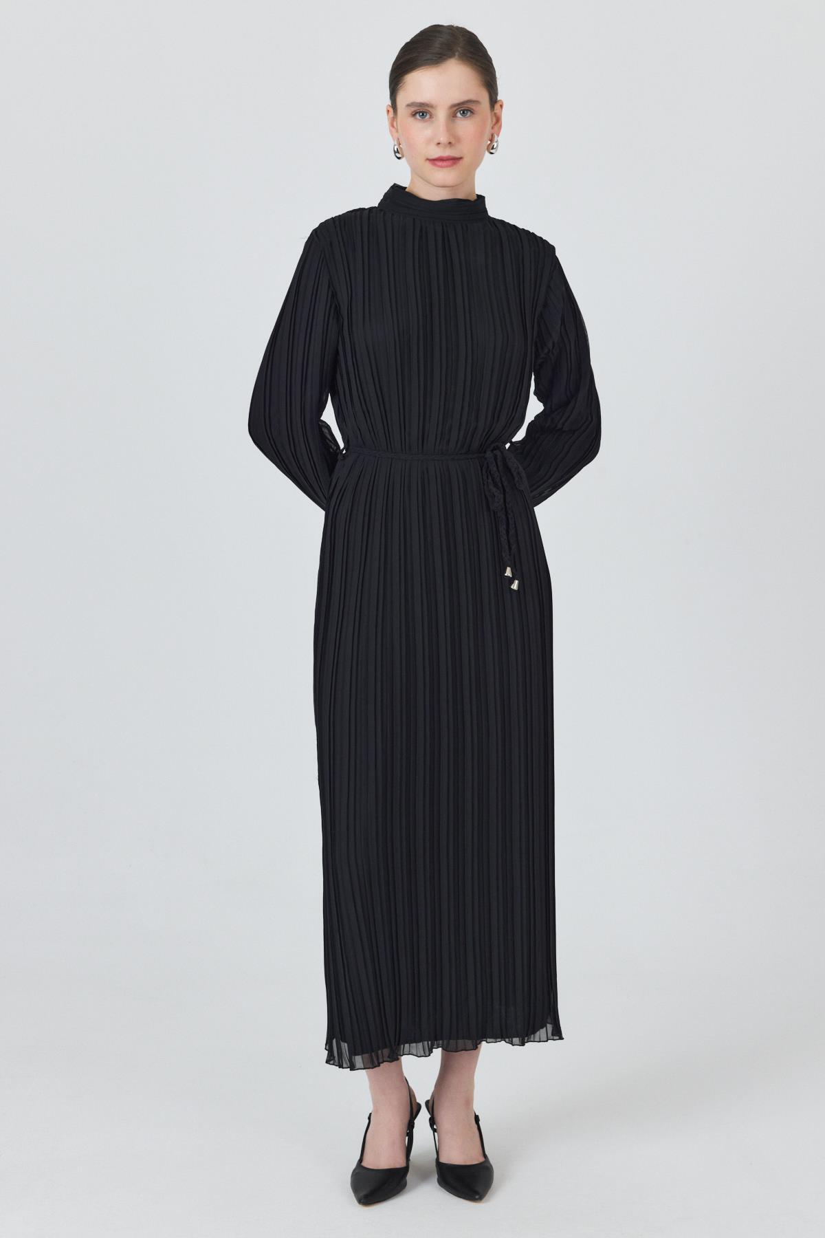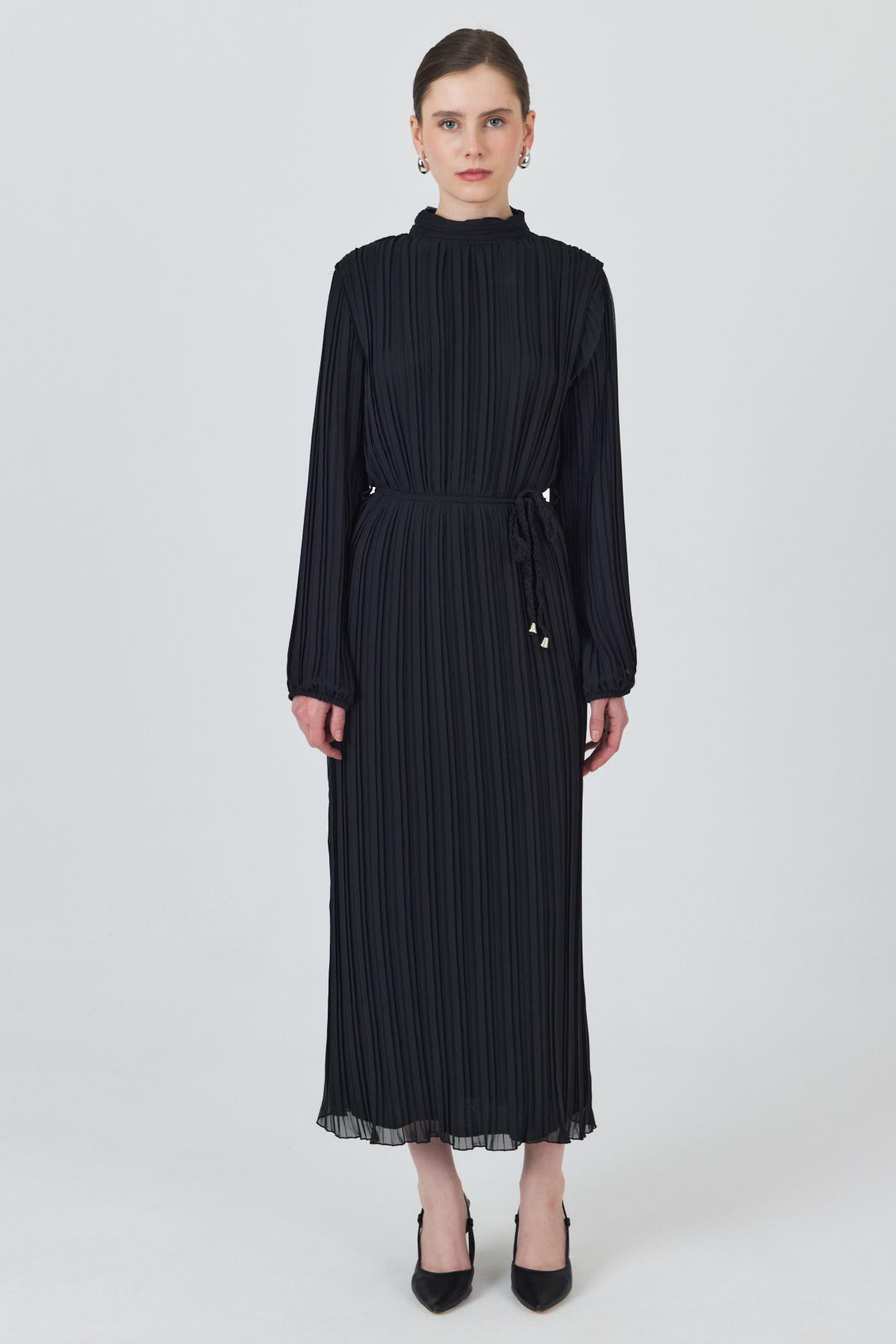 Siyah Pileli Uzun Kollu Kemer Detaylı Midi Boy Elbise 020