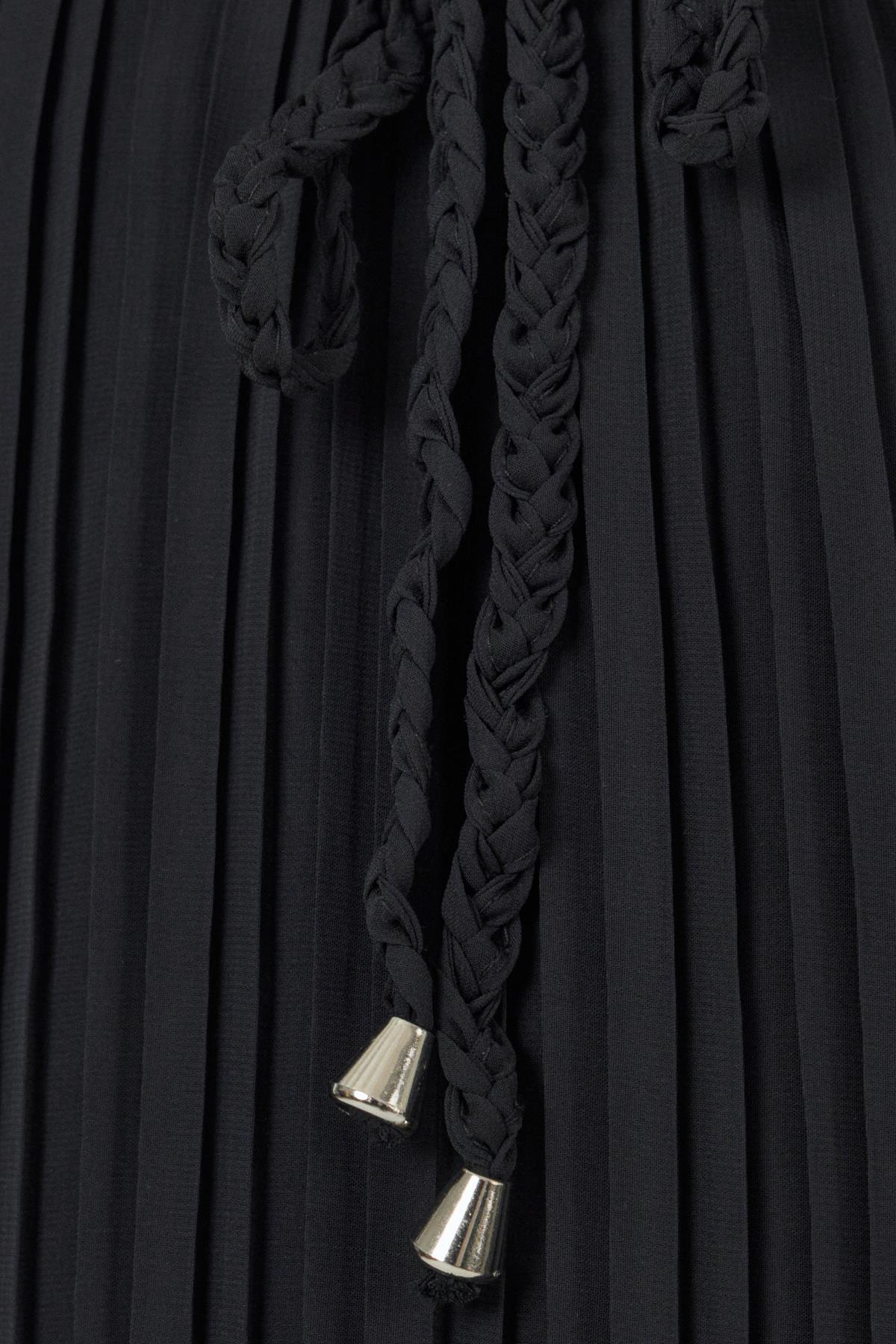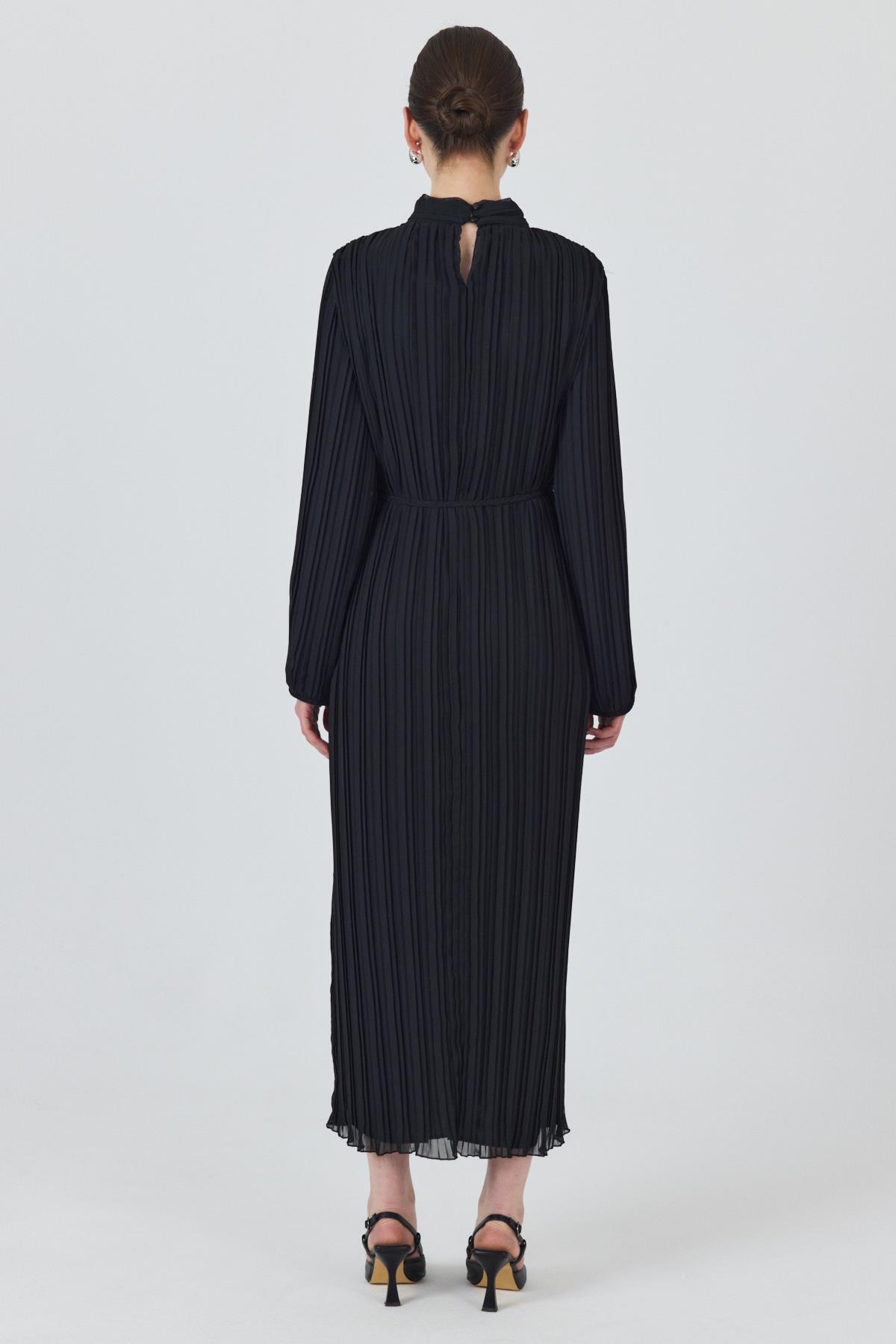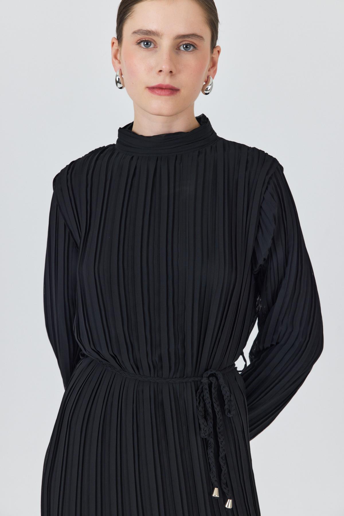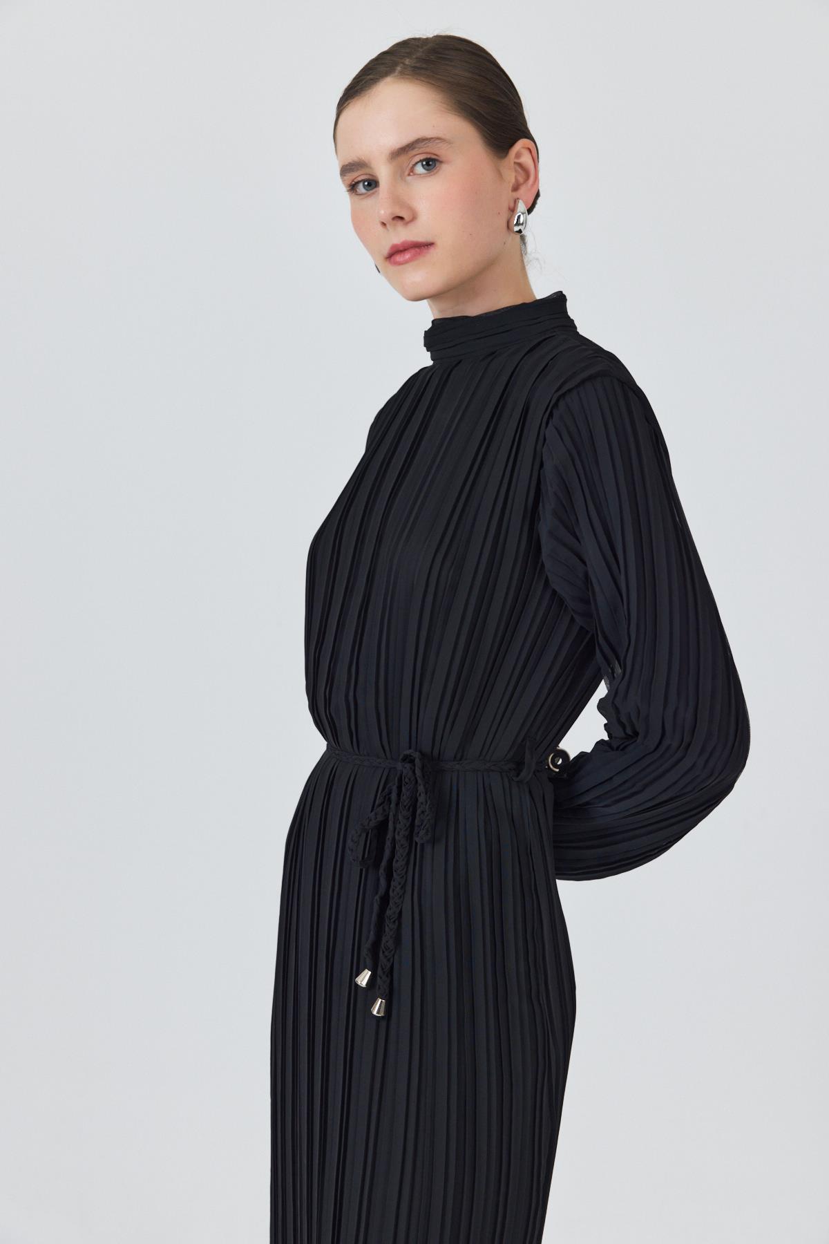 Siyah Pileli Uzun Kollu Kemer Detaylı Midi Boy Elbise 020