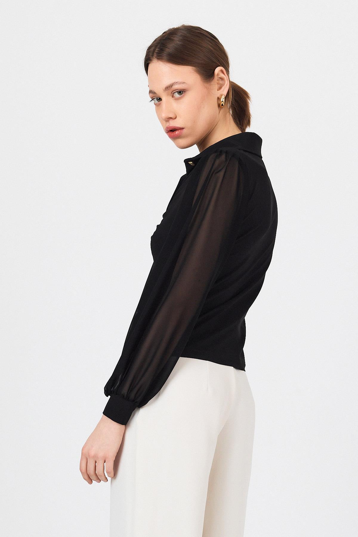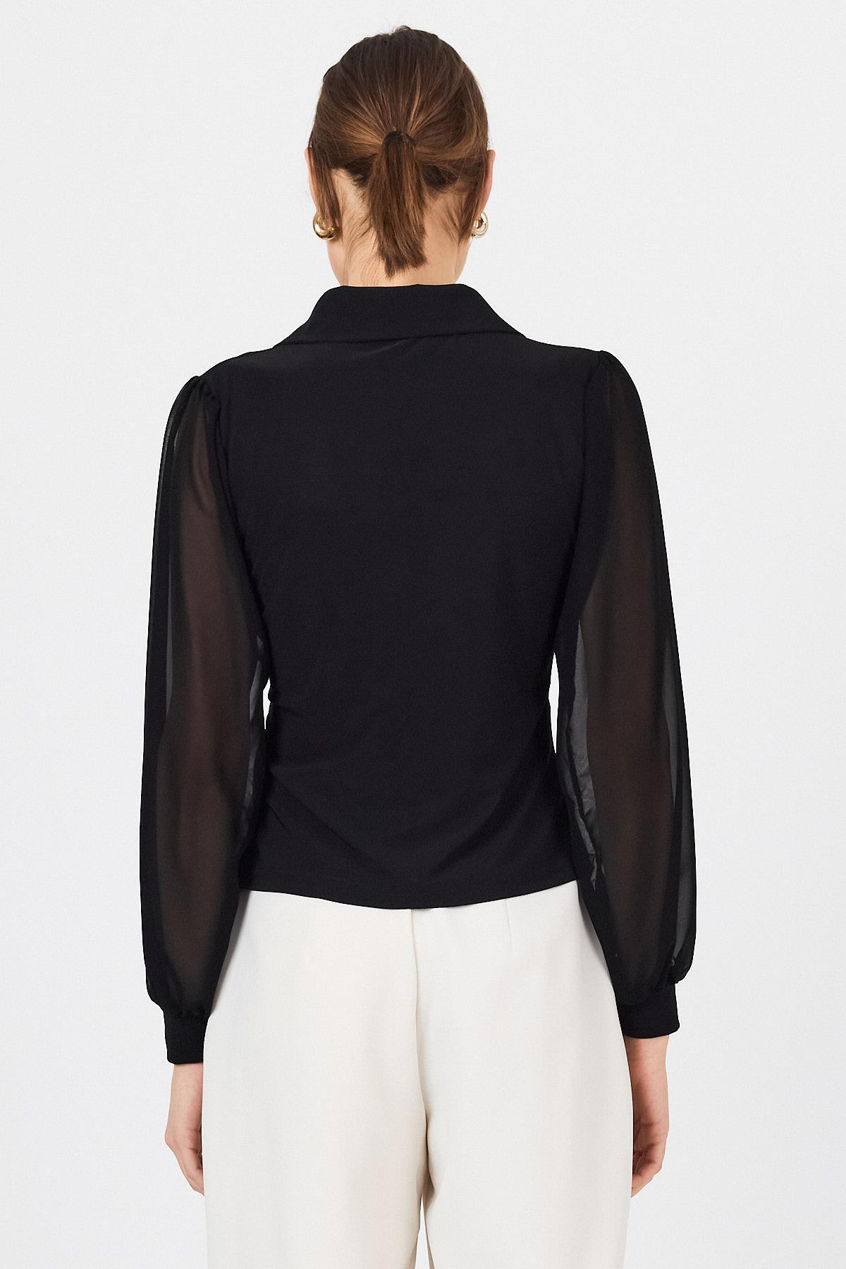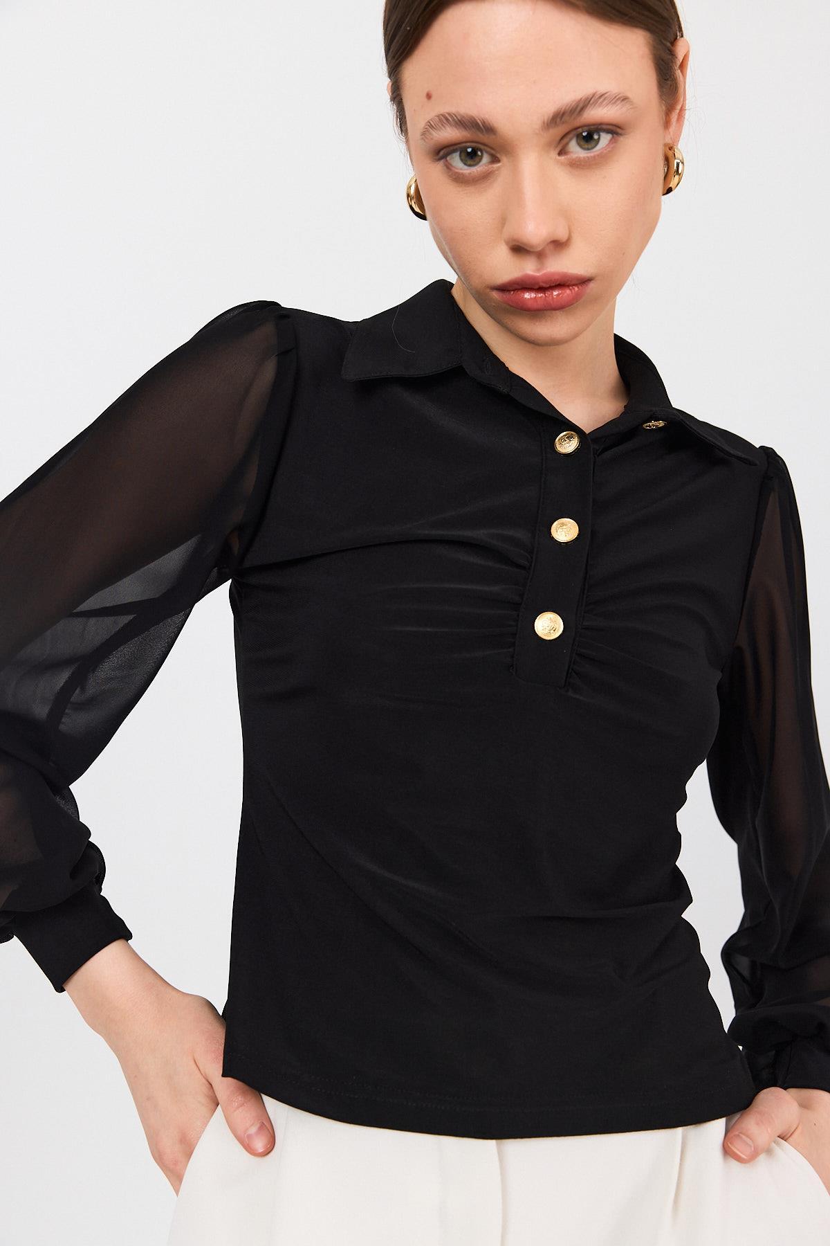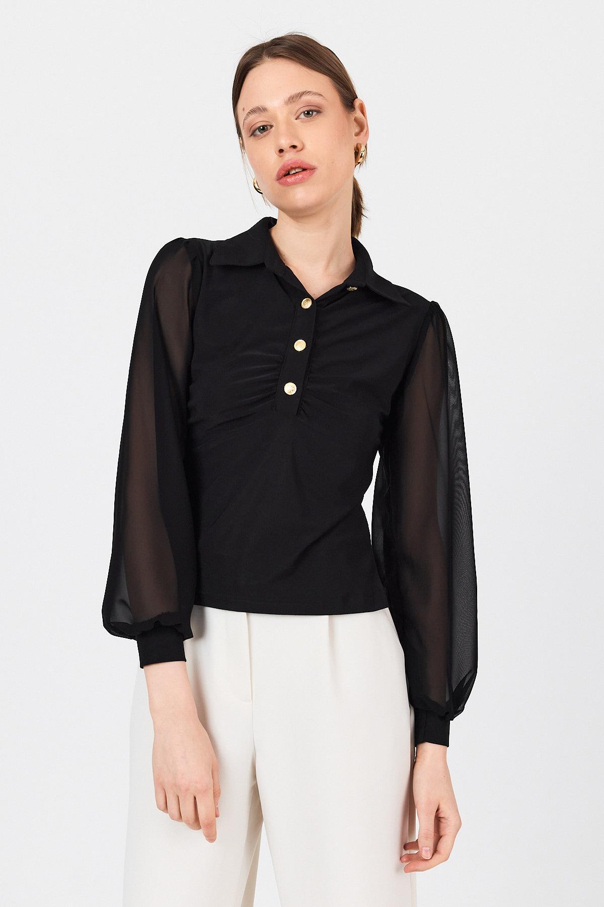 Siyah Şifon Kollu Gömlek Yaka Düğmeli Bluz 9478