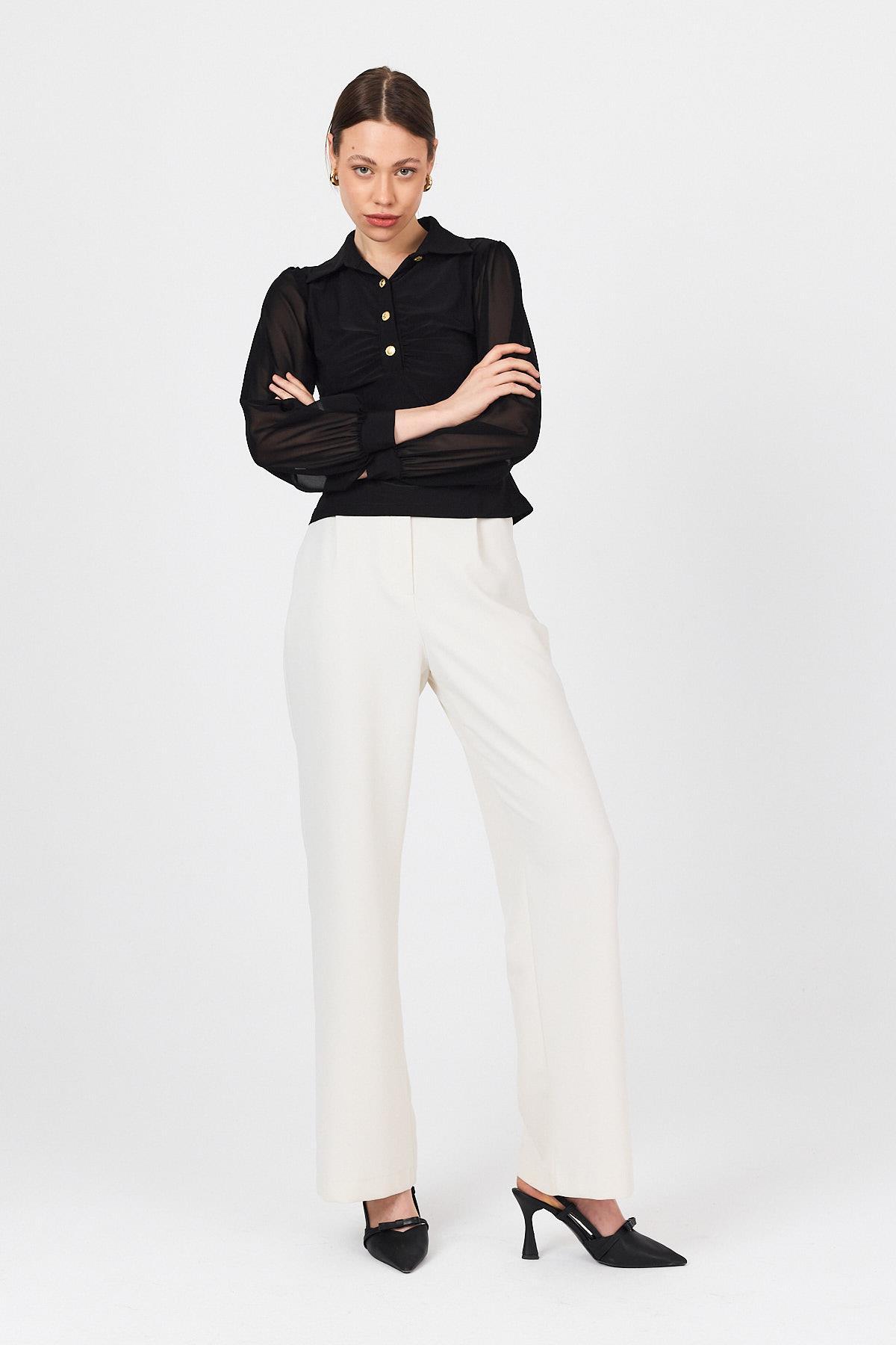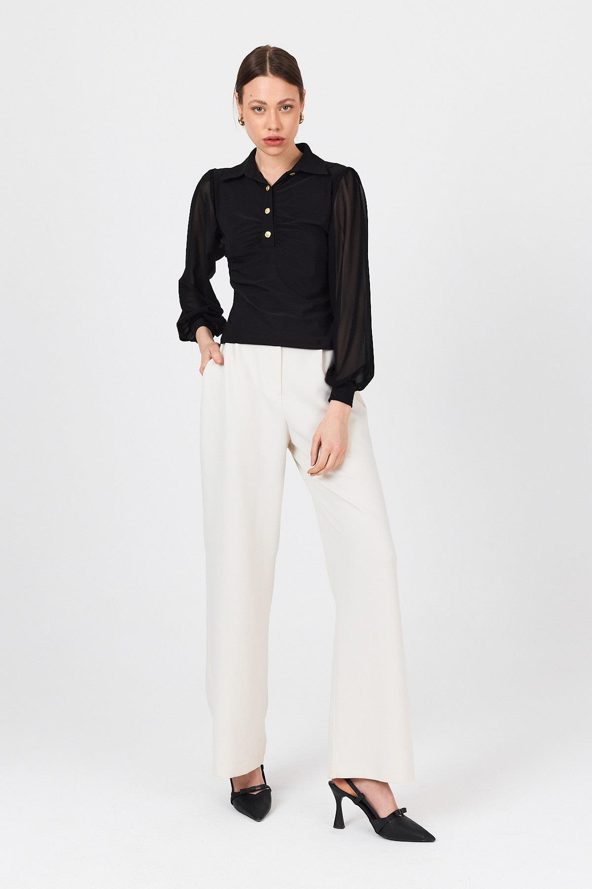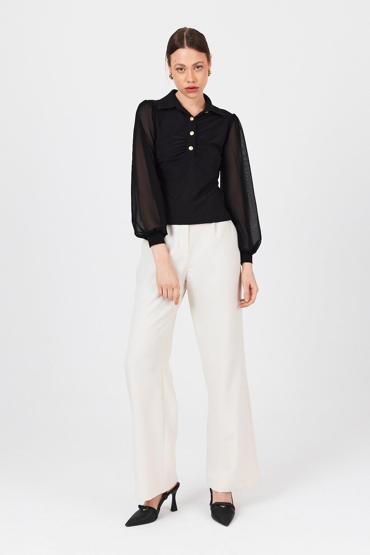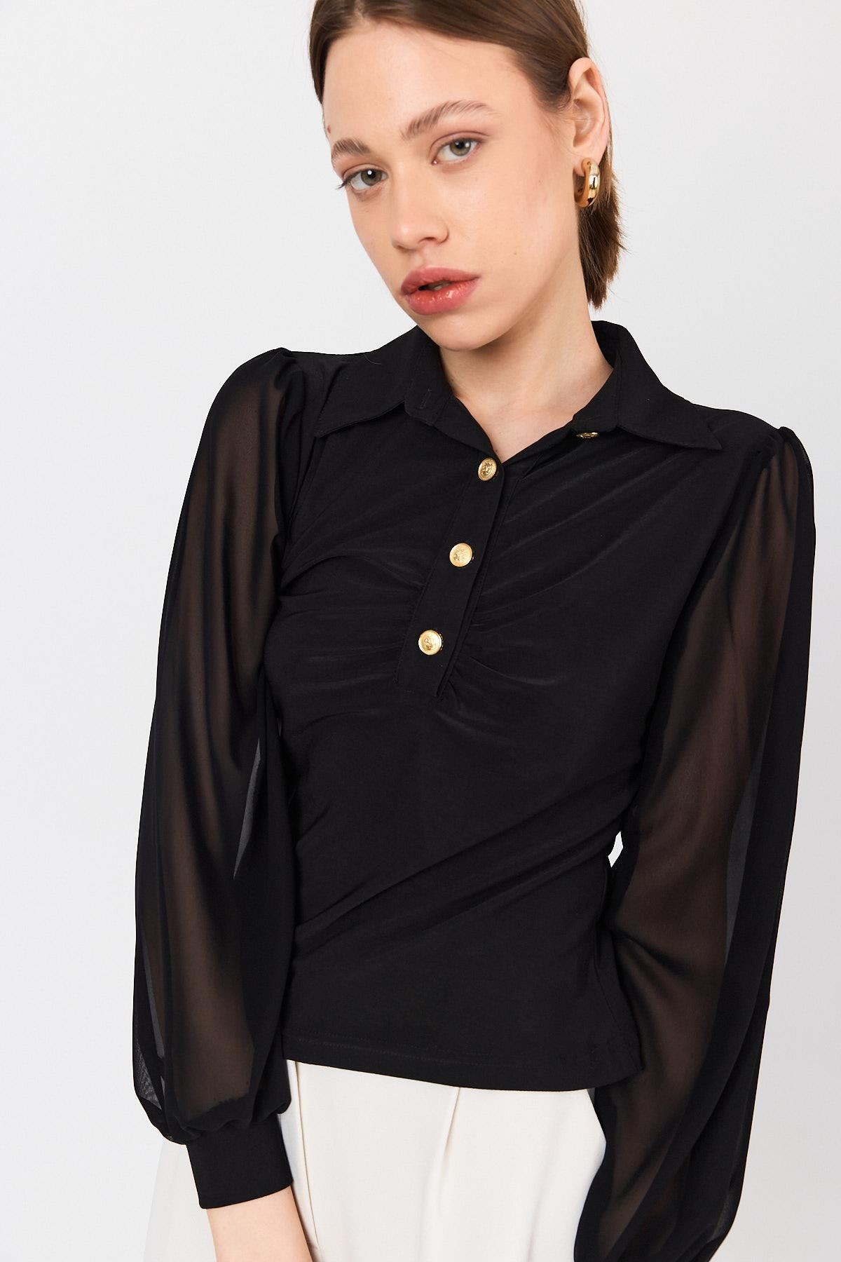 Siyah Şifon Kollu Gömlek Yaka Düğmeli Bluz 9478