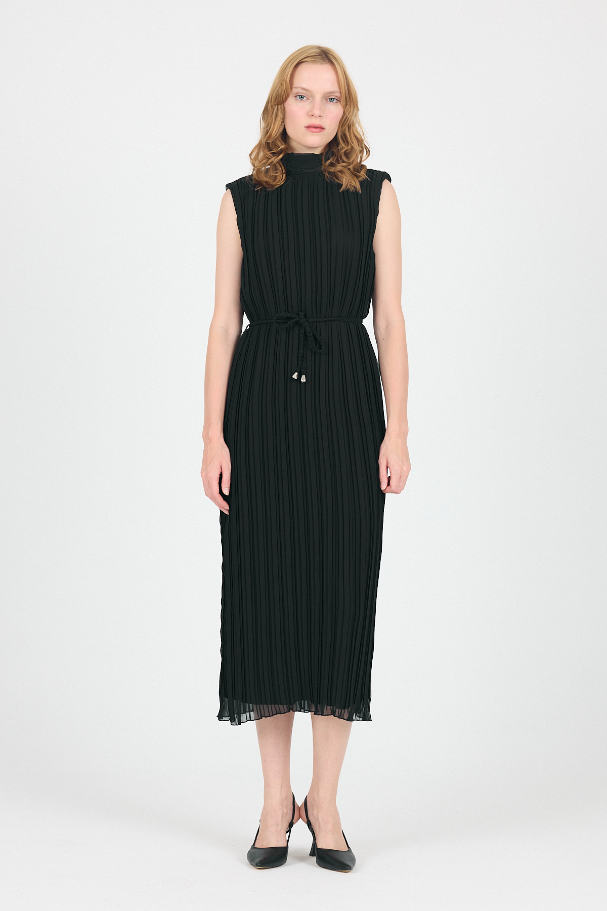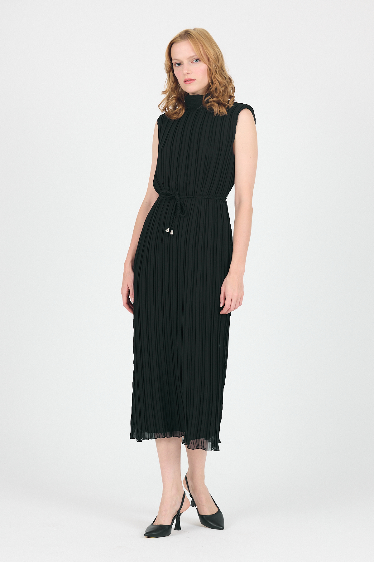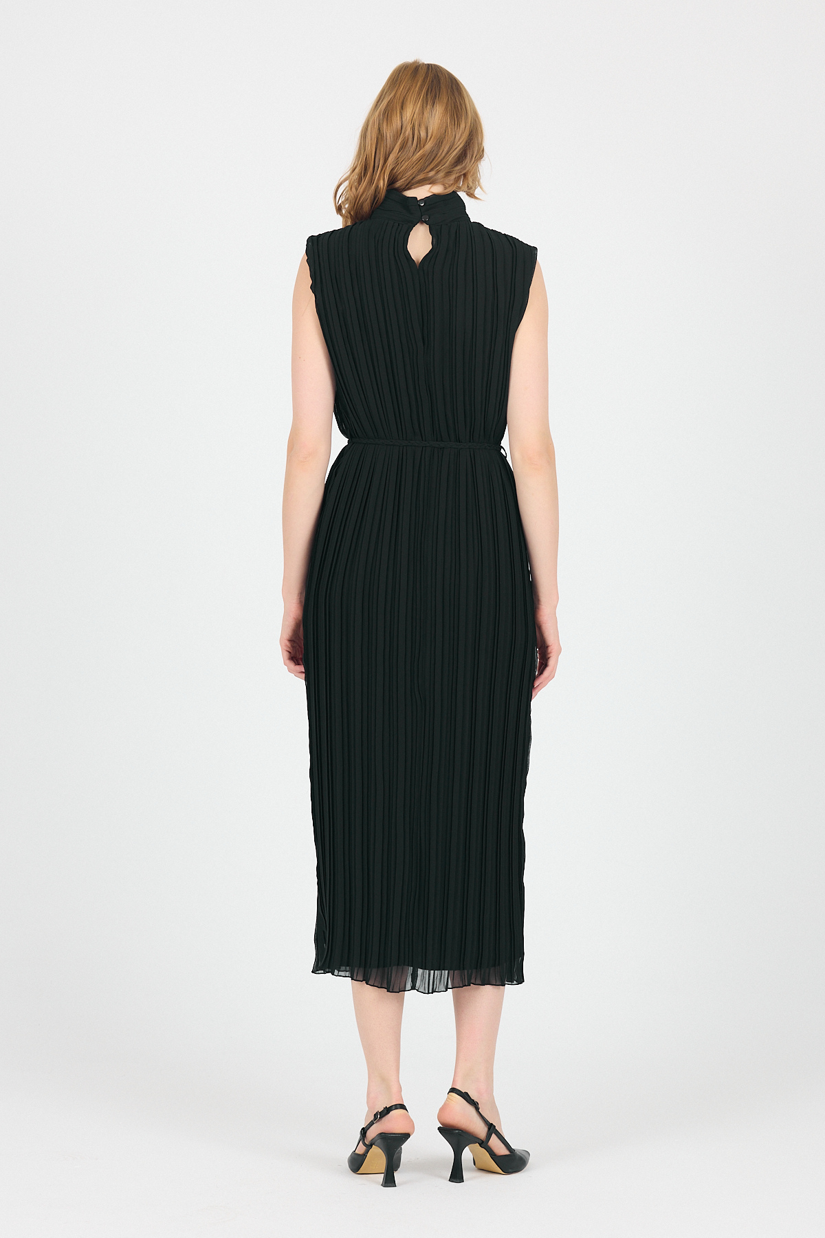 Siyah Şifon Kolsuz Pileli Bel Bağlamalı Midi Elbise 118