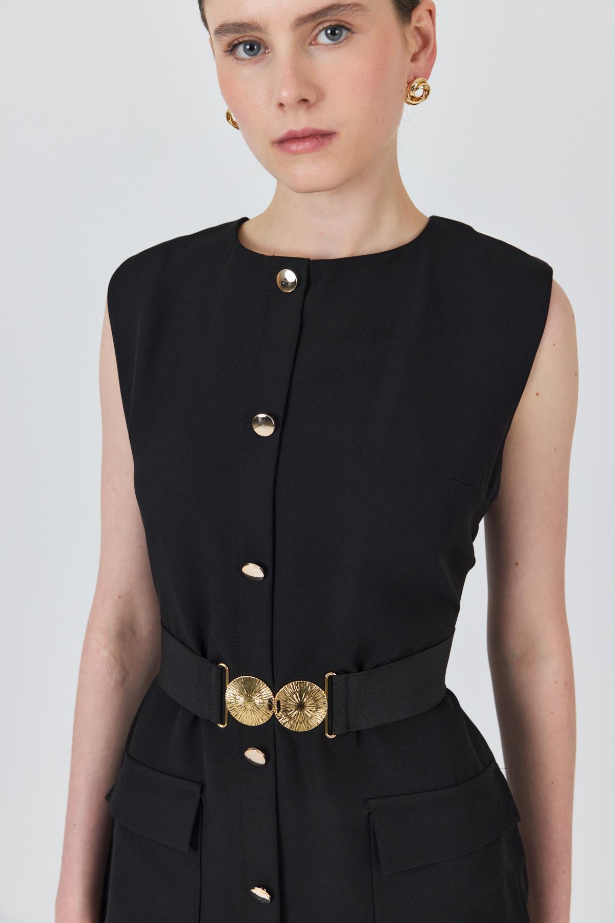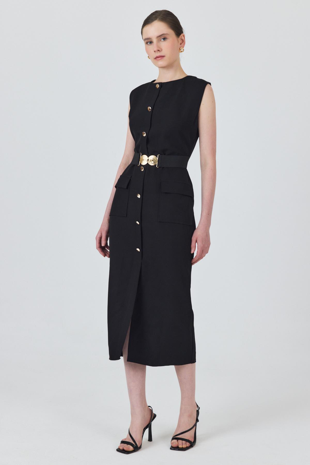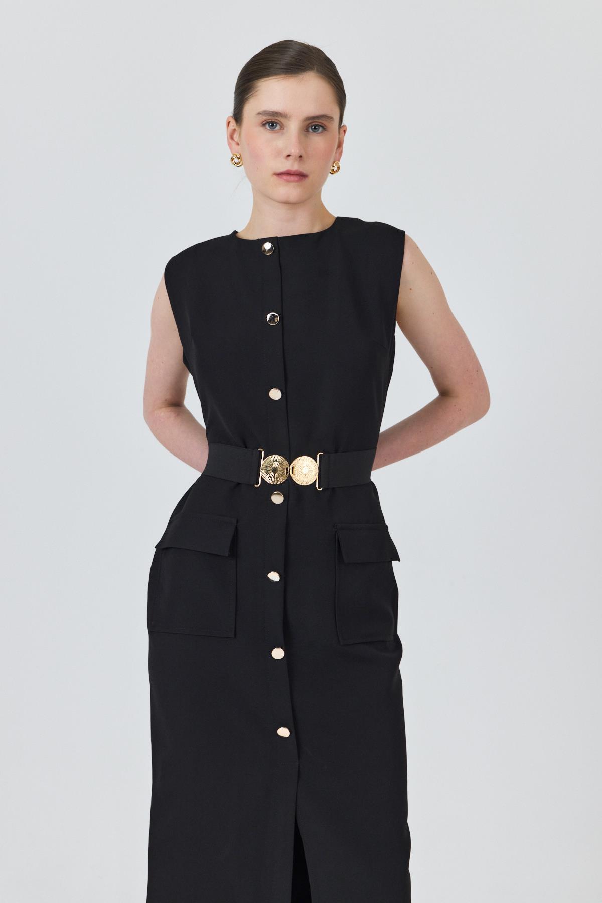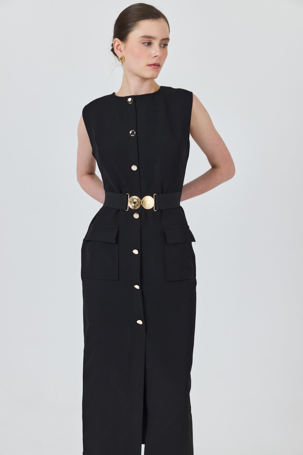 Siyah Tokalı Kemer Ve Düğme Detaylı Kolsuz Elbise 251653