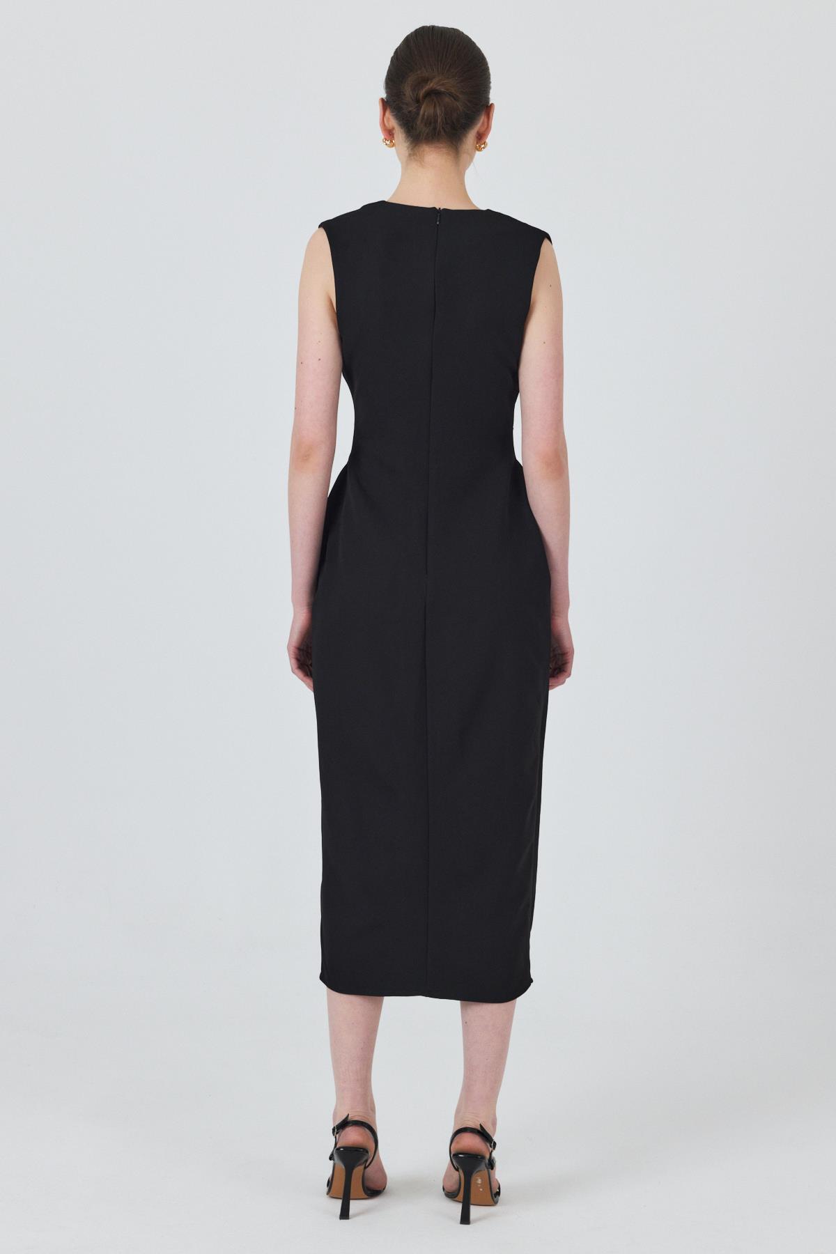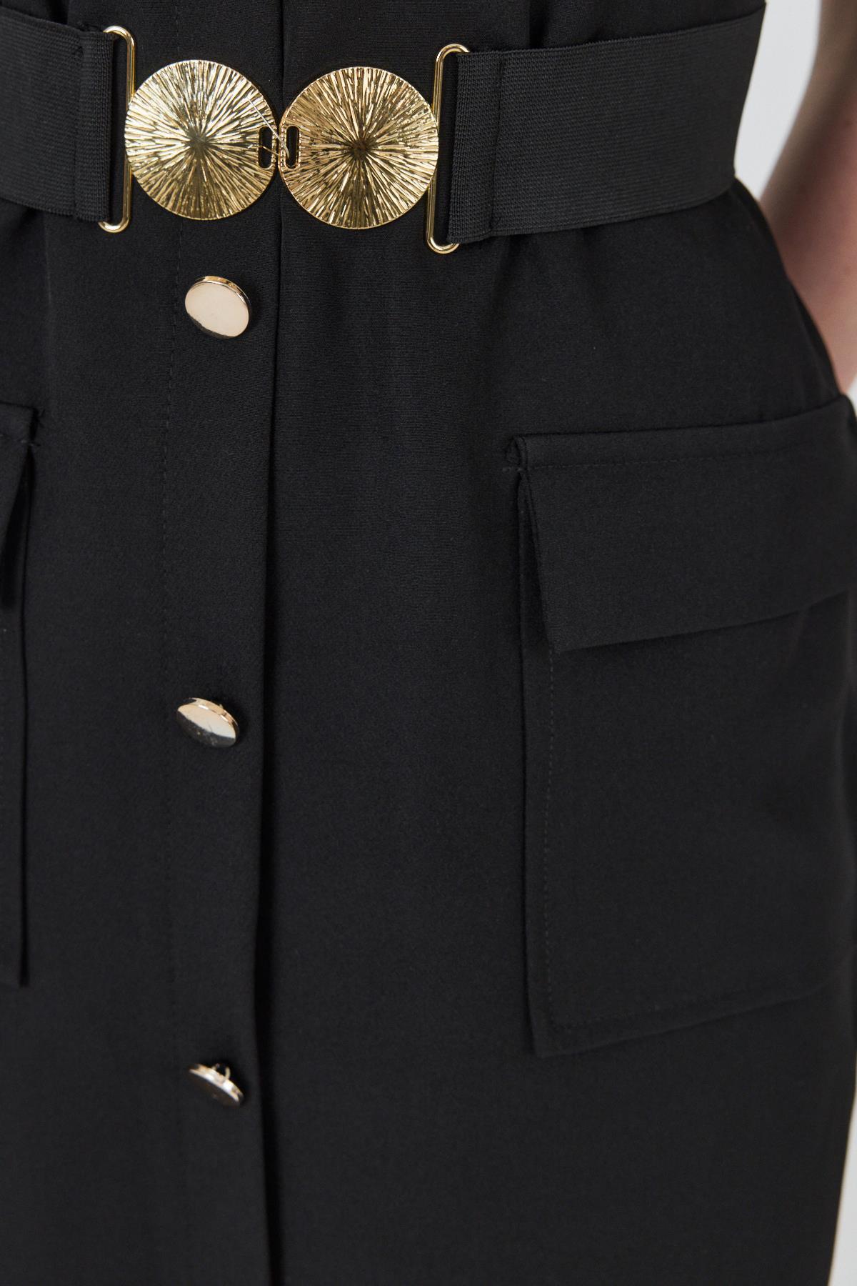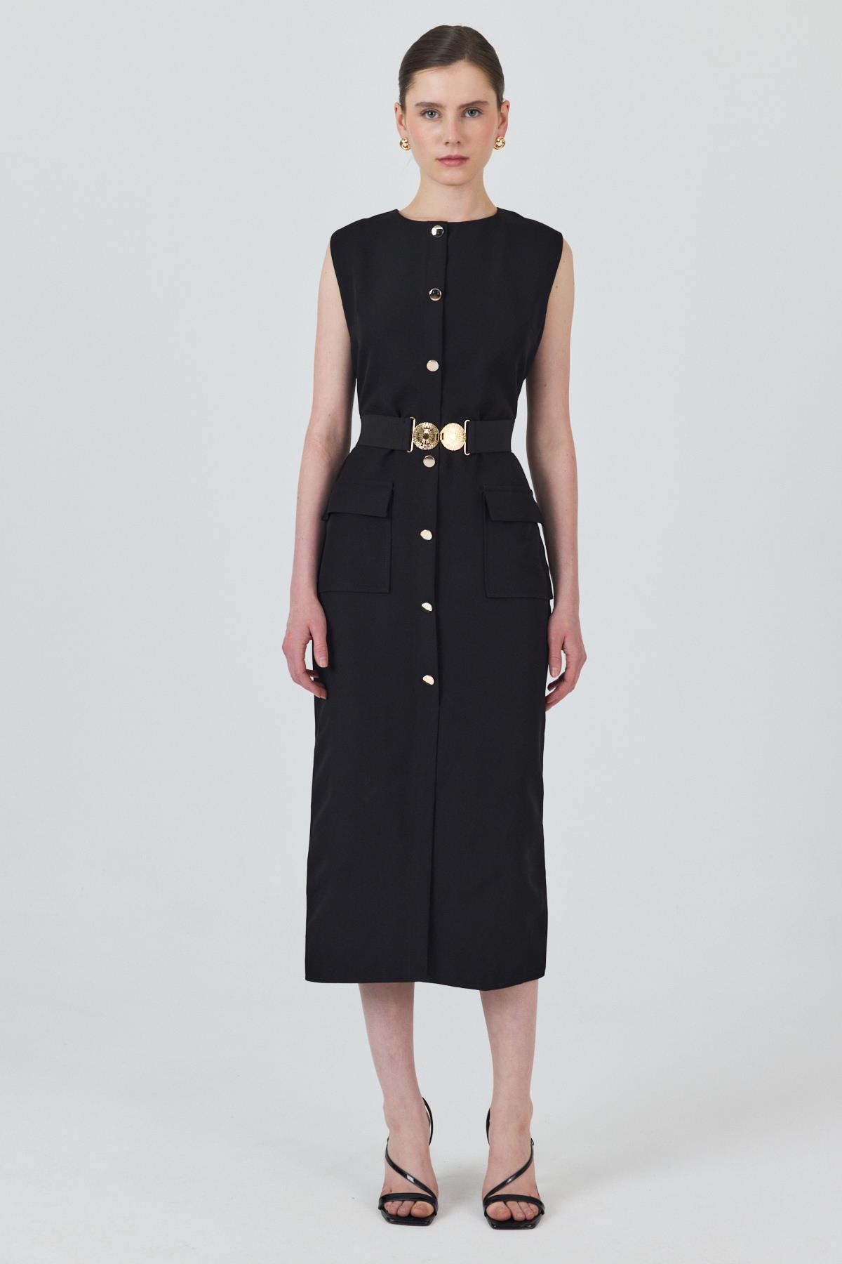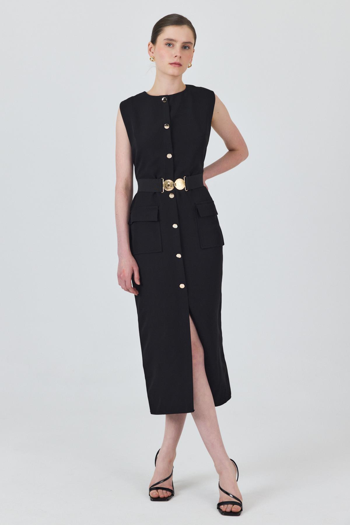 Siyah Tokalı Kemer Ve Düğme Detaylı Kolsuz Elbise 251653