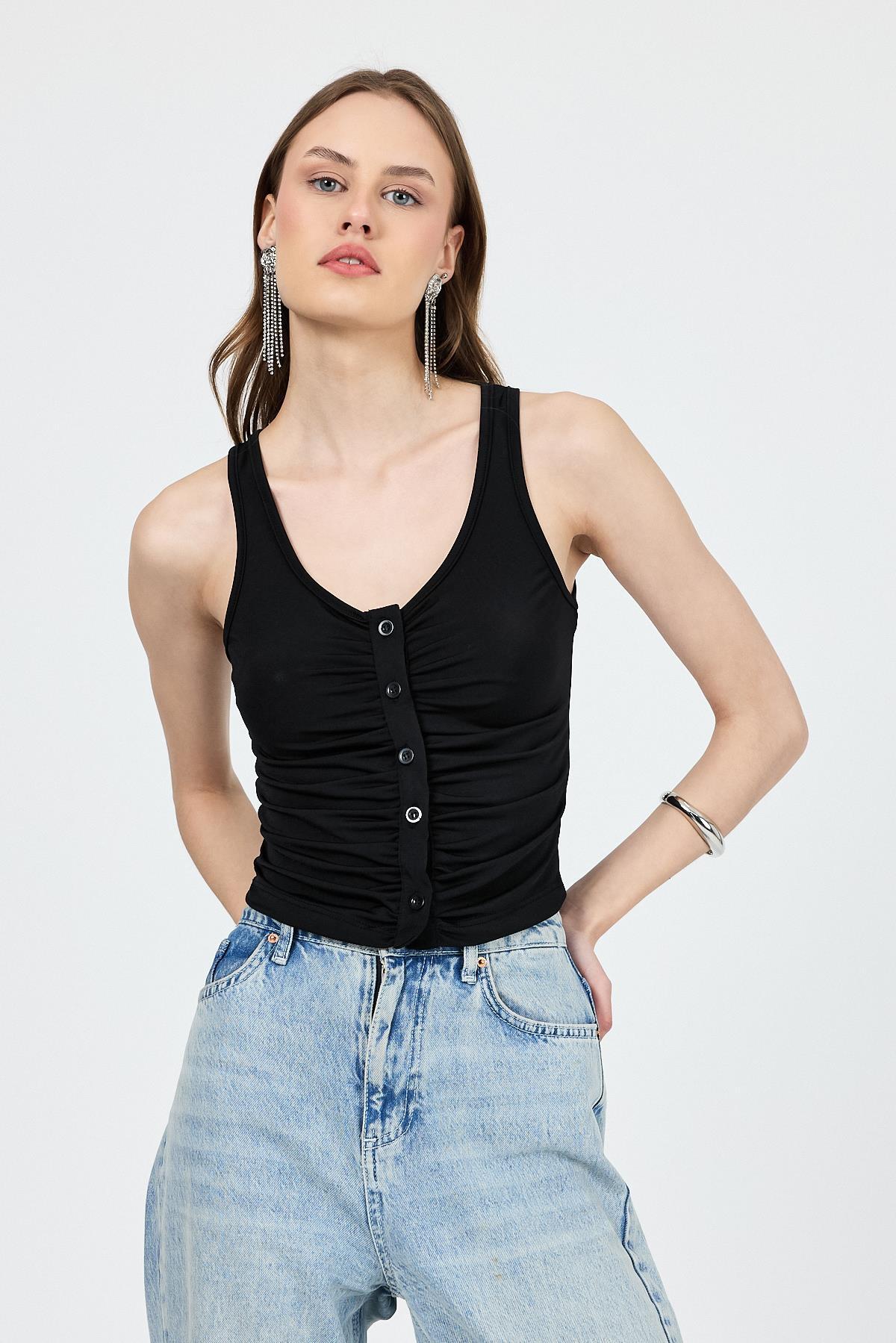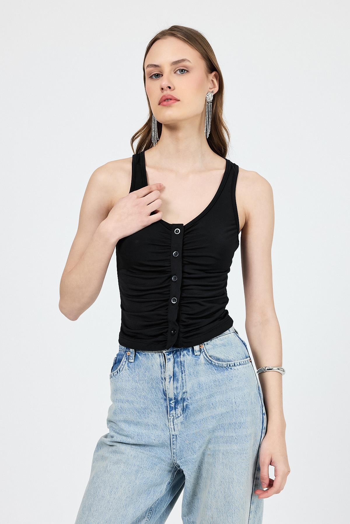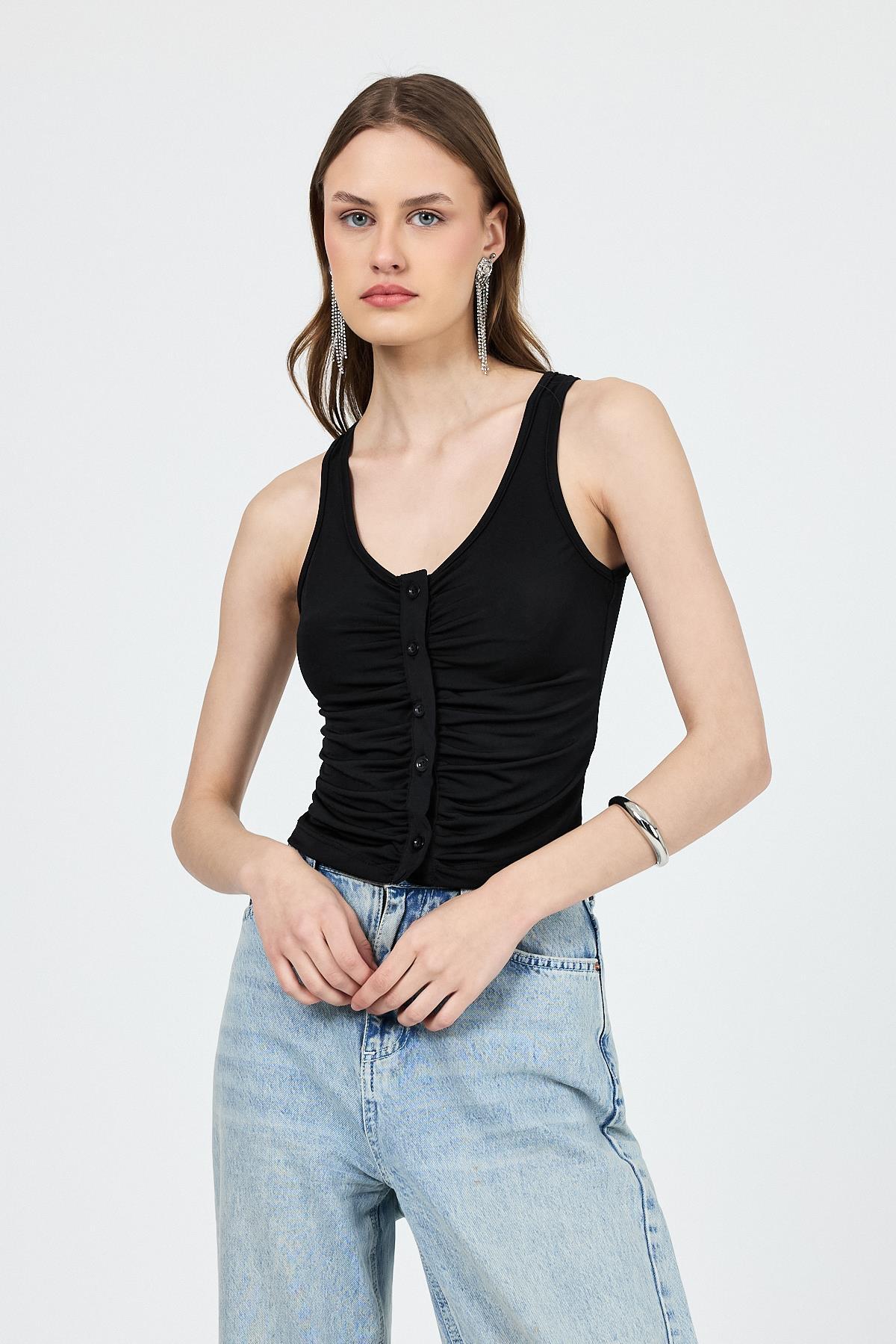 Siyah U Yaka Büzgülü Düğmeli Atlet 13298
