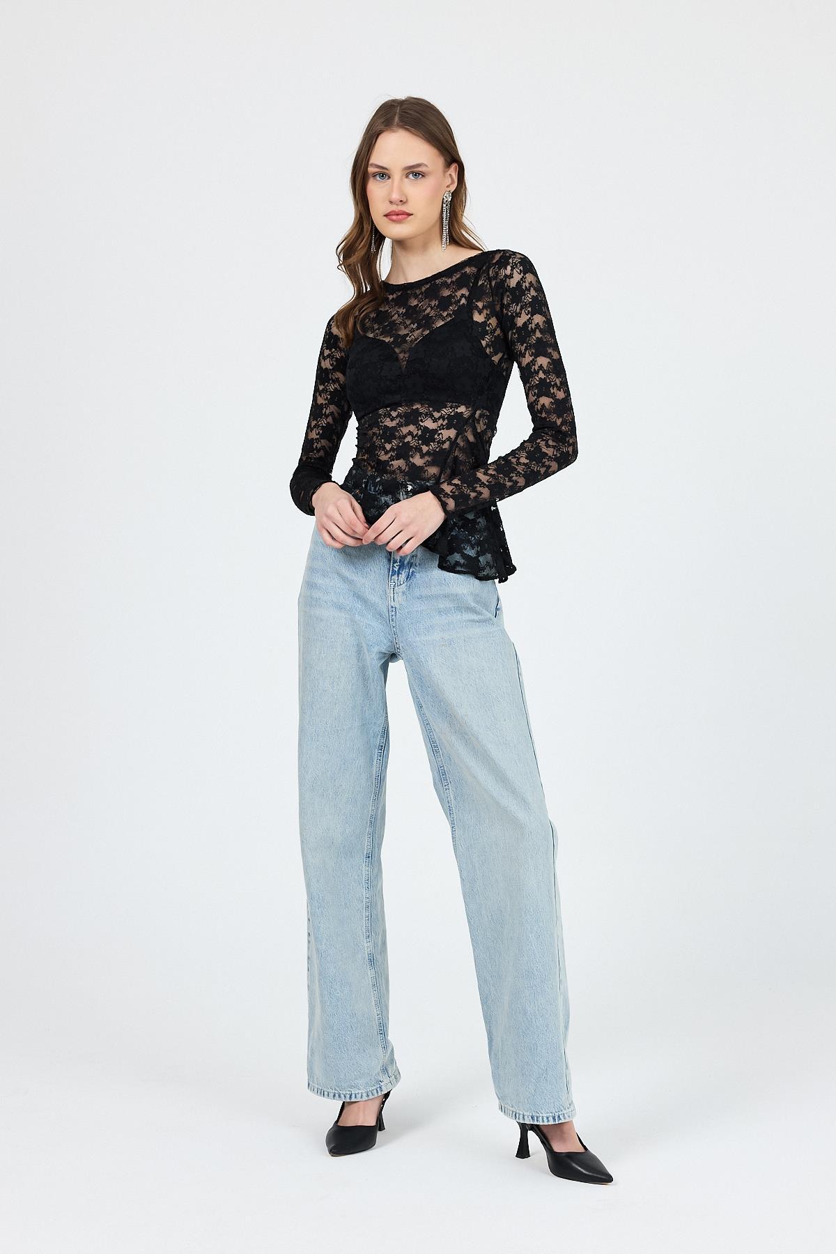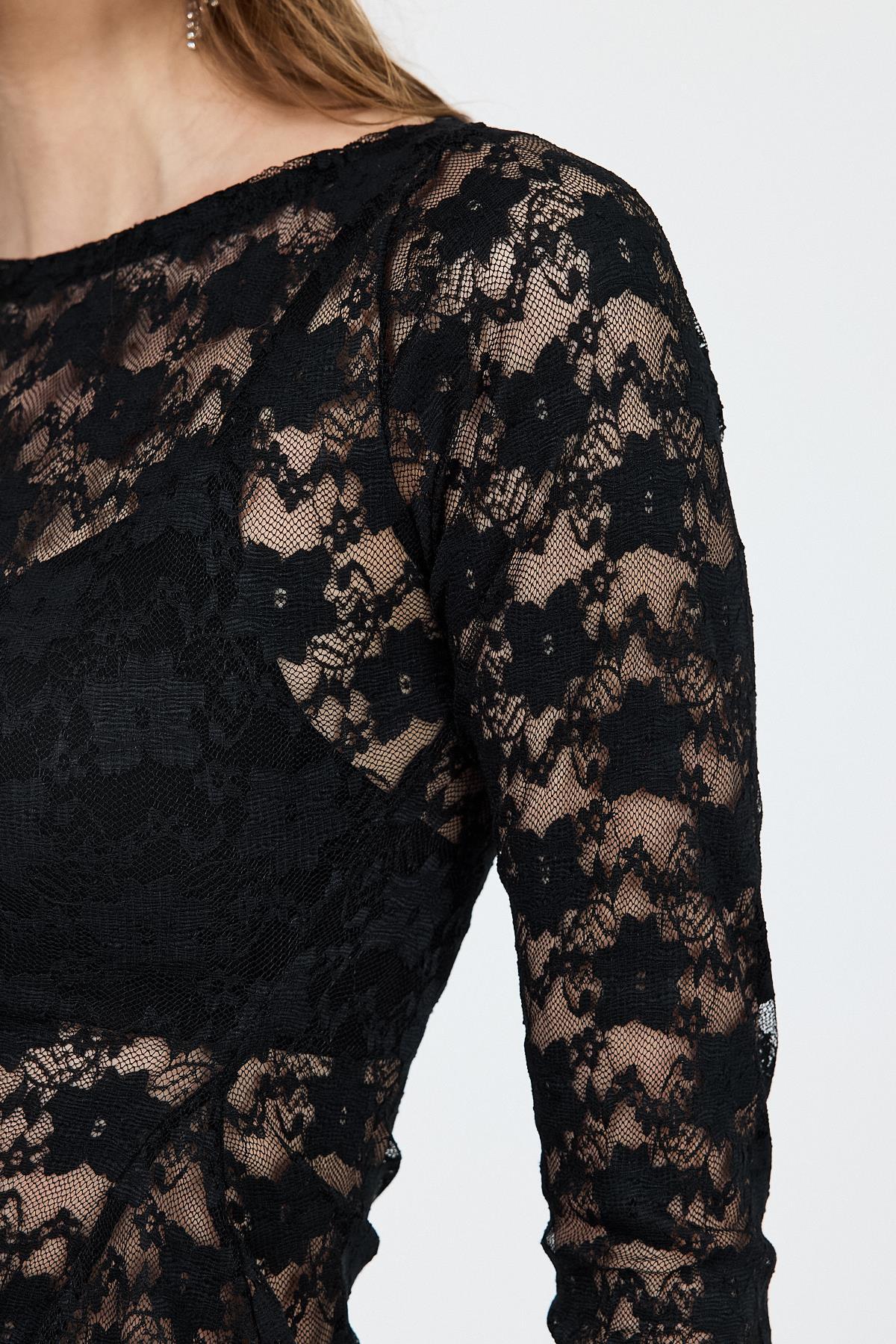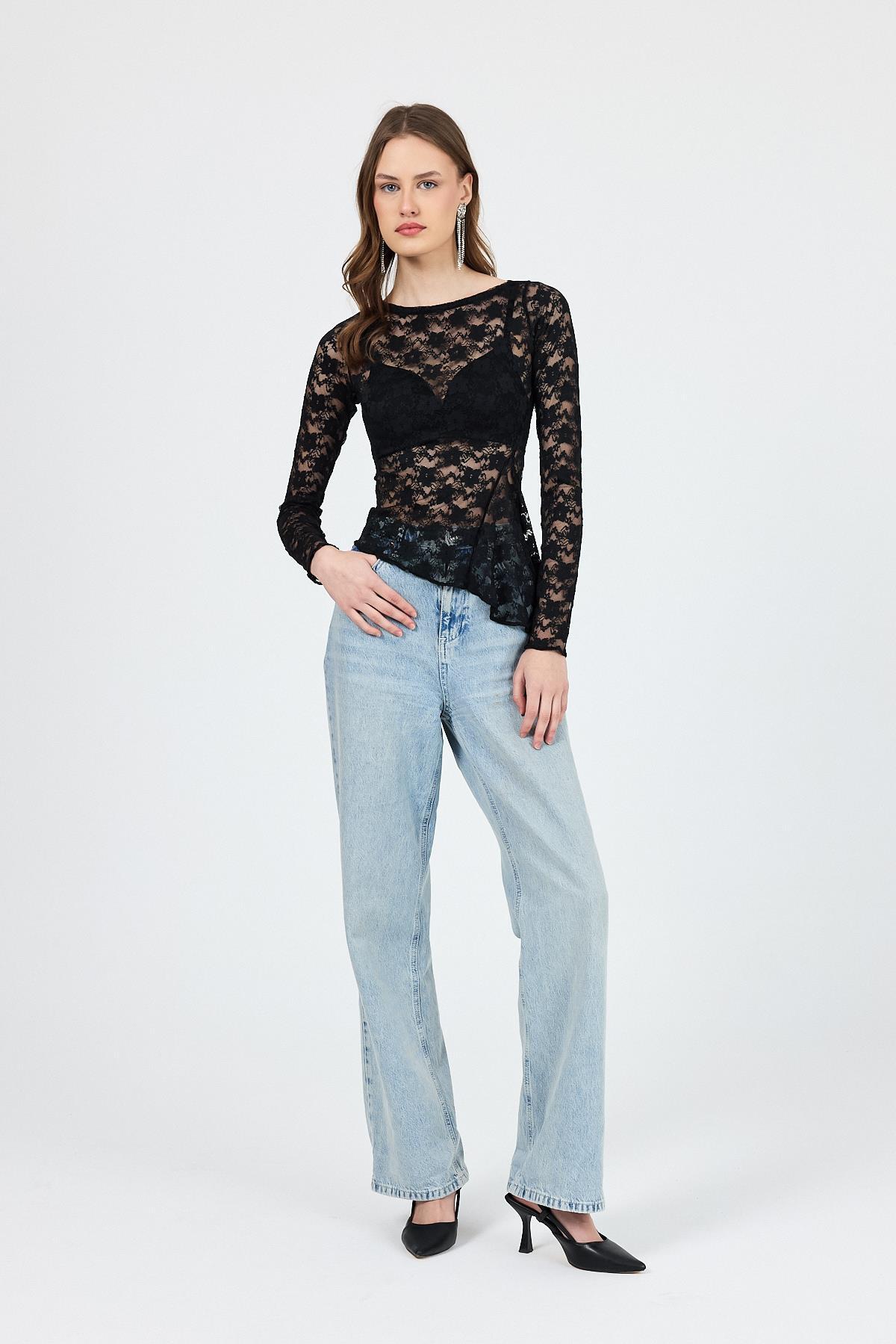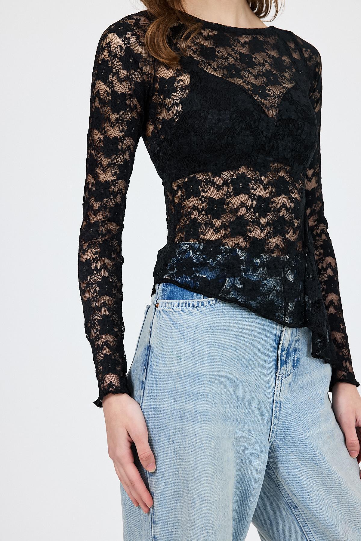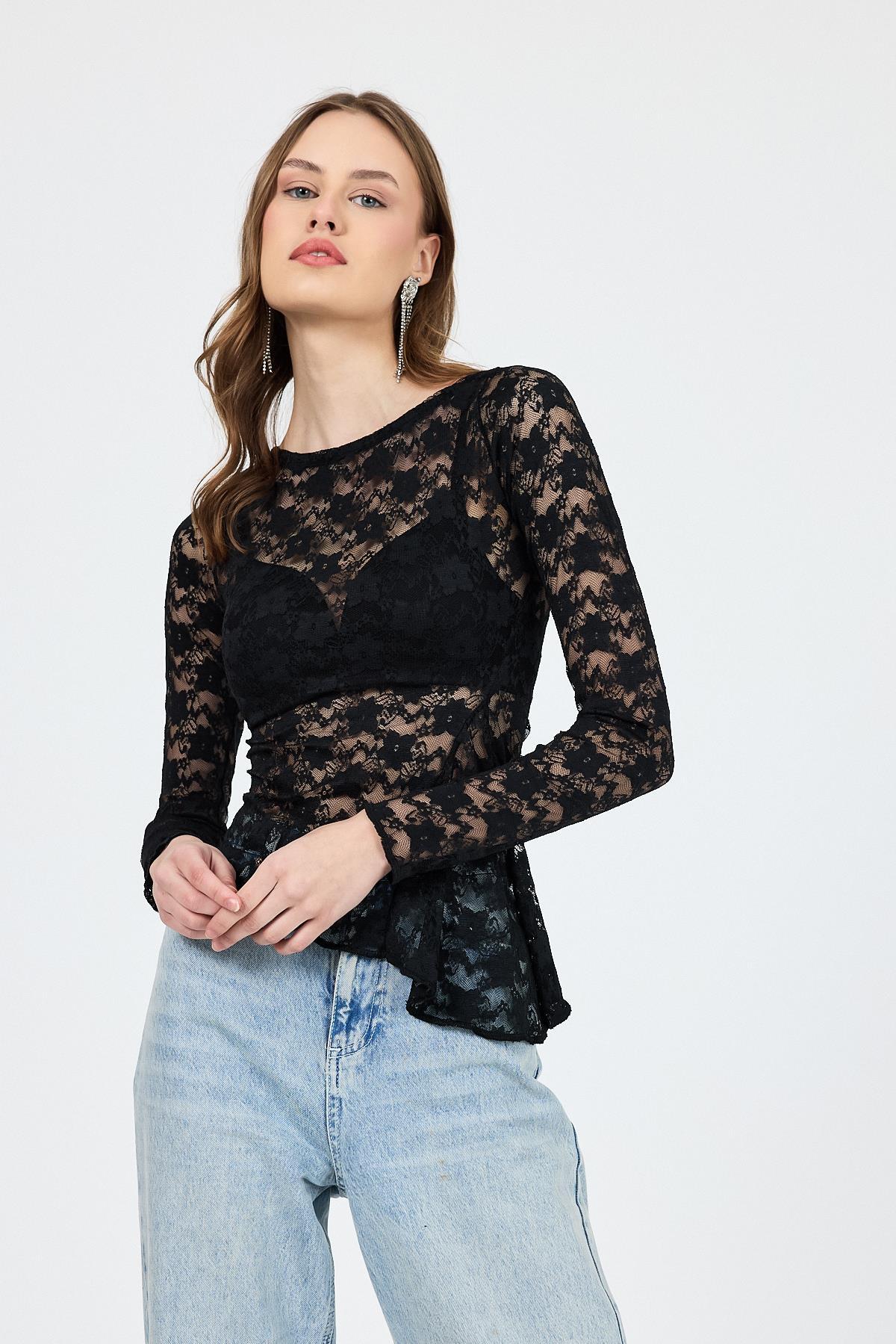 Siyah Uzun Kollu Transparan Dantel Bluz 13288