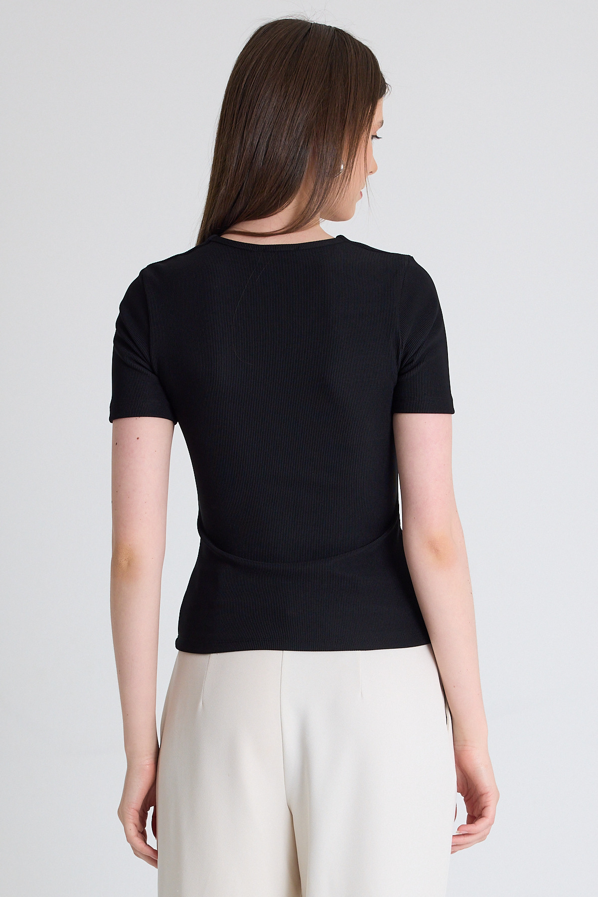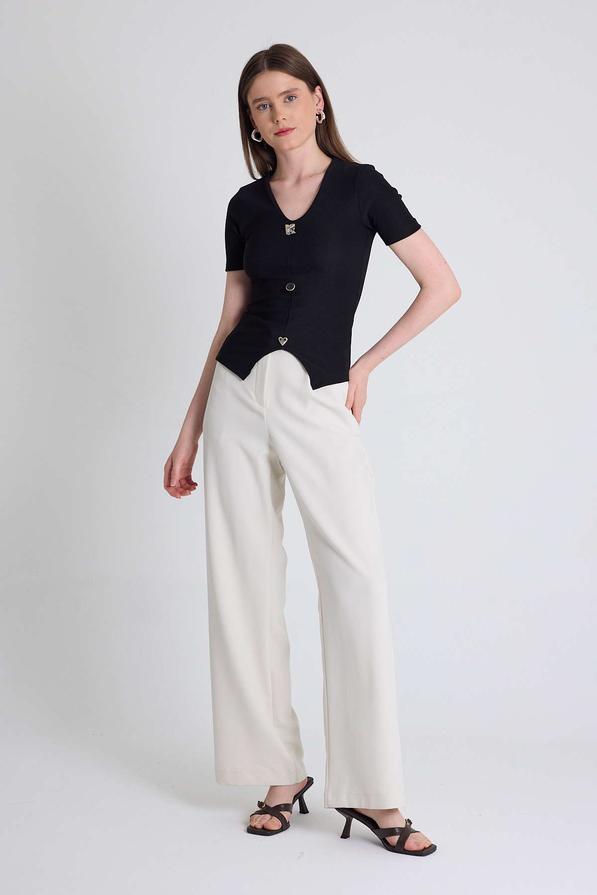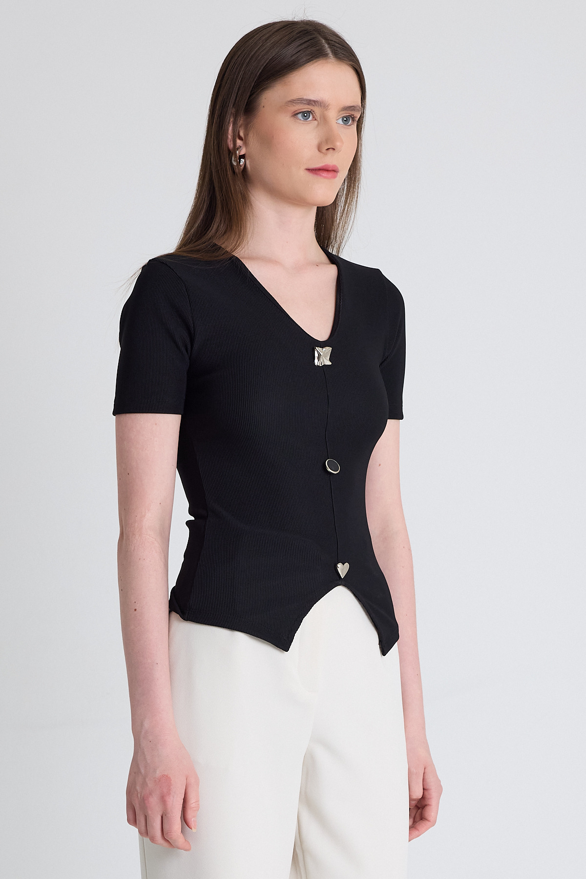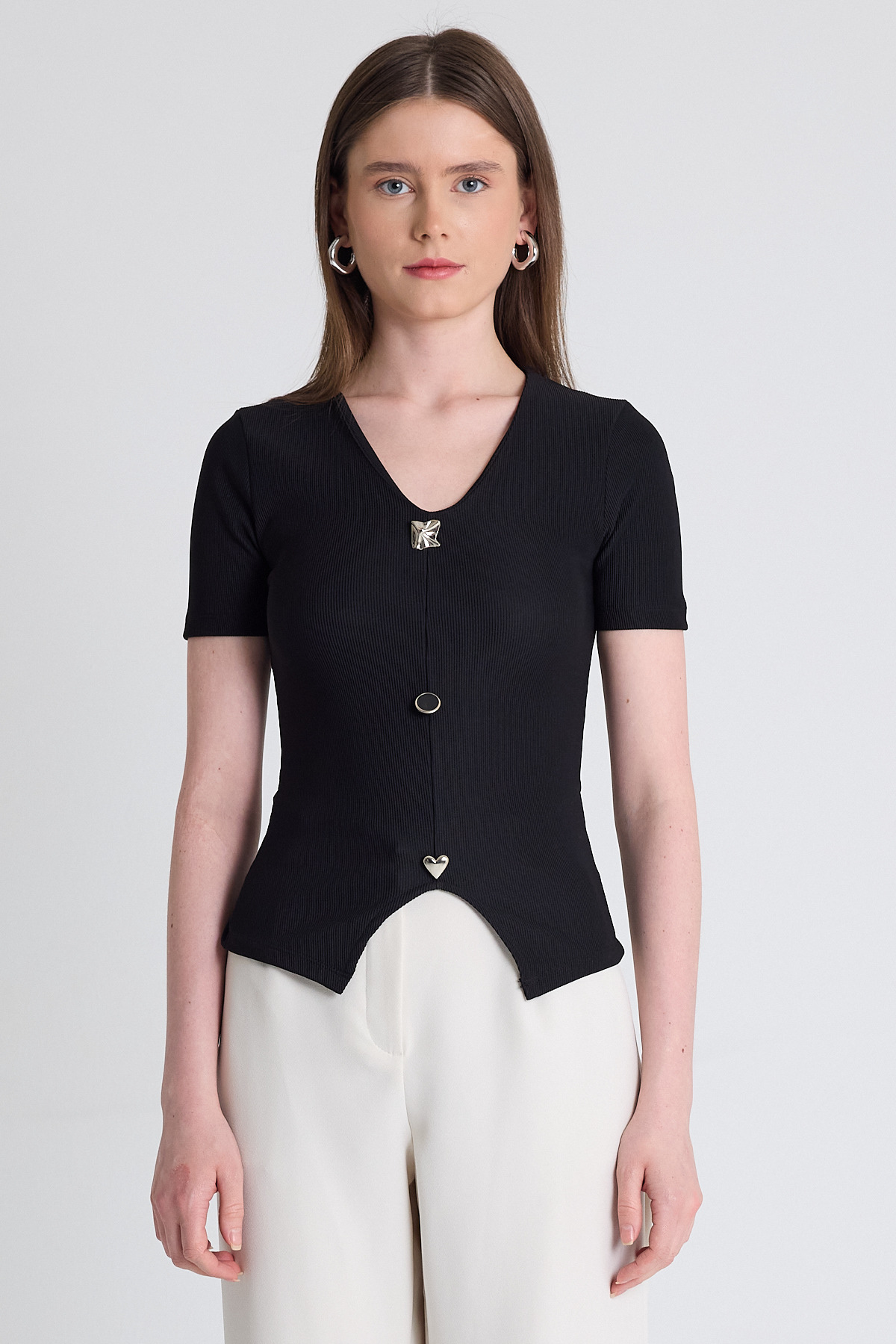 Siyah V Yaka Düğme Detaylı Kısa Kollu Tişört 9205M