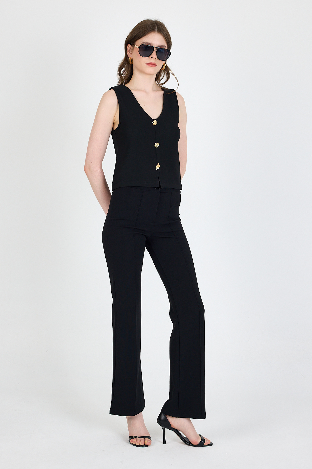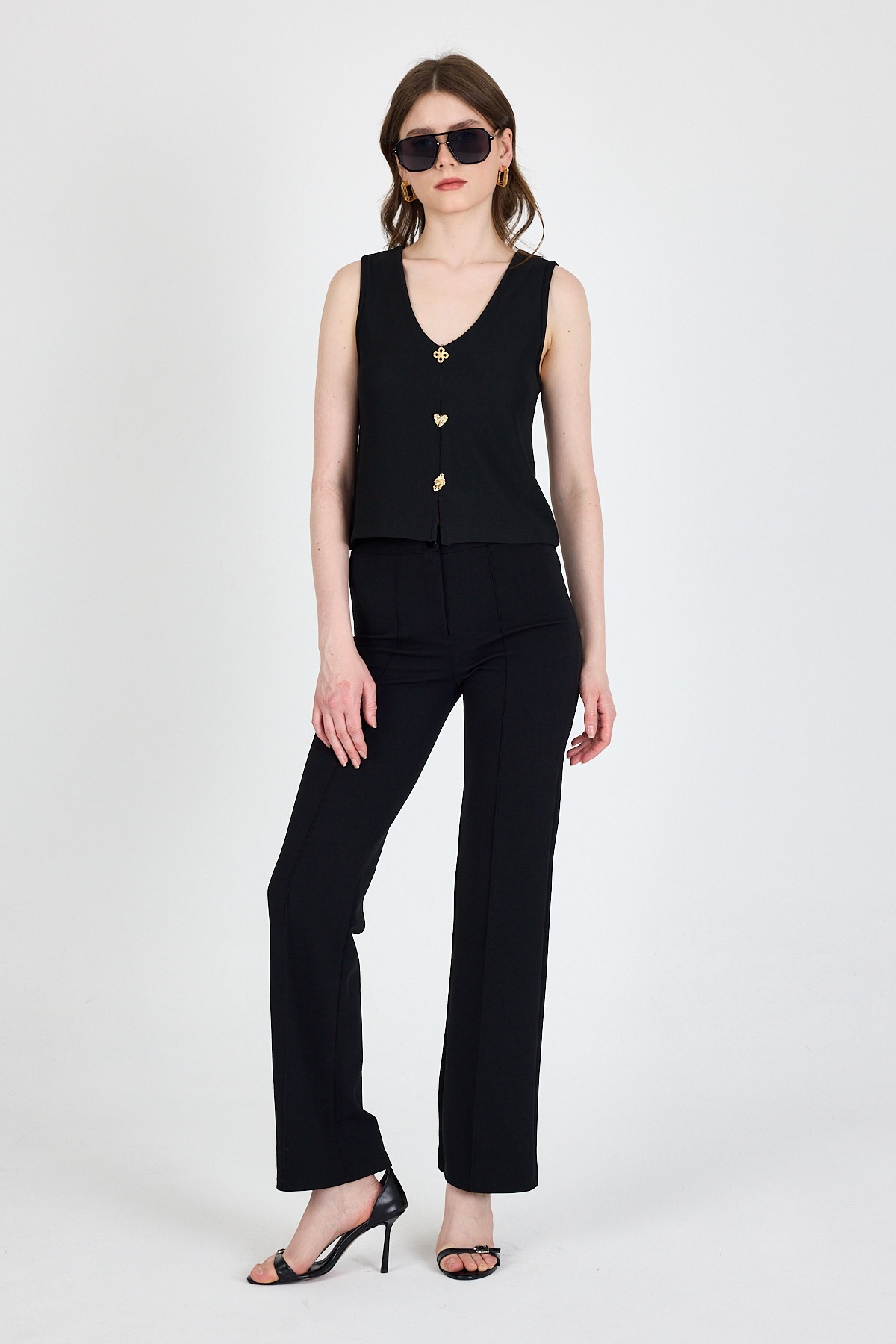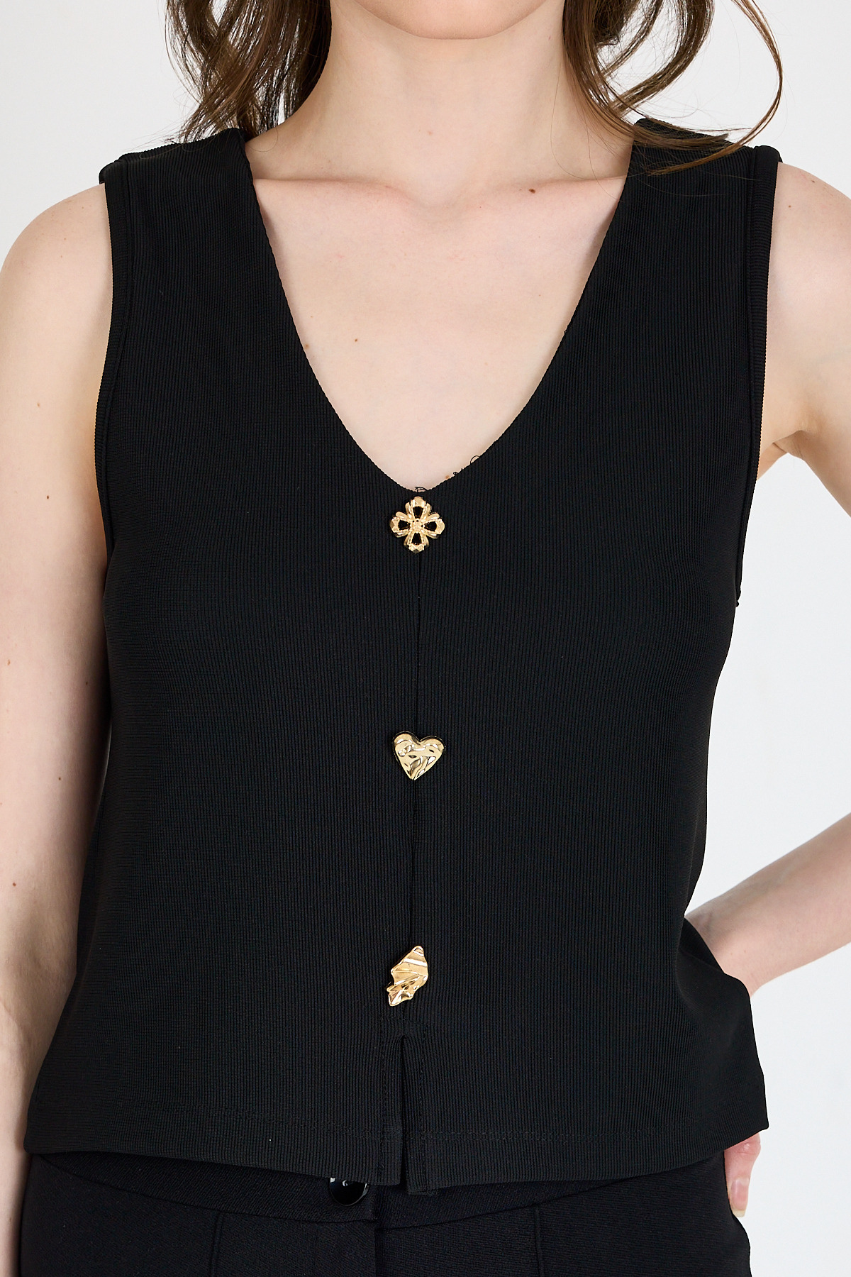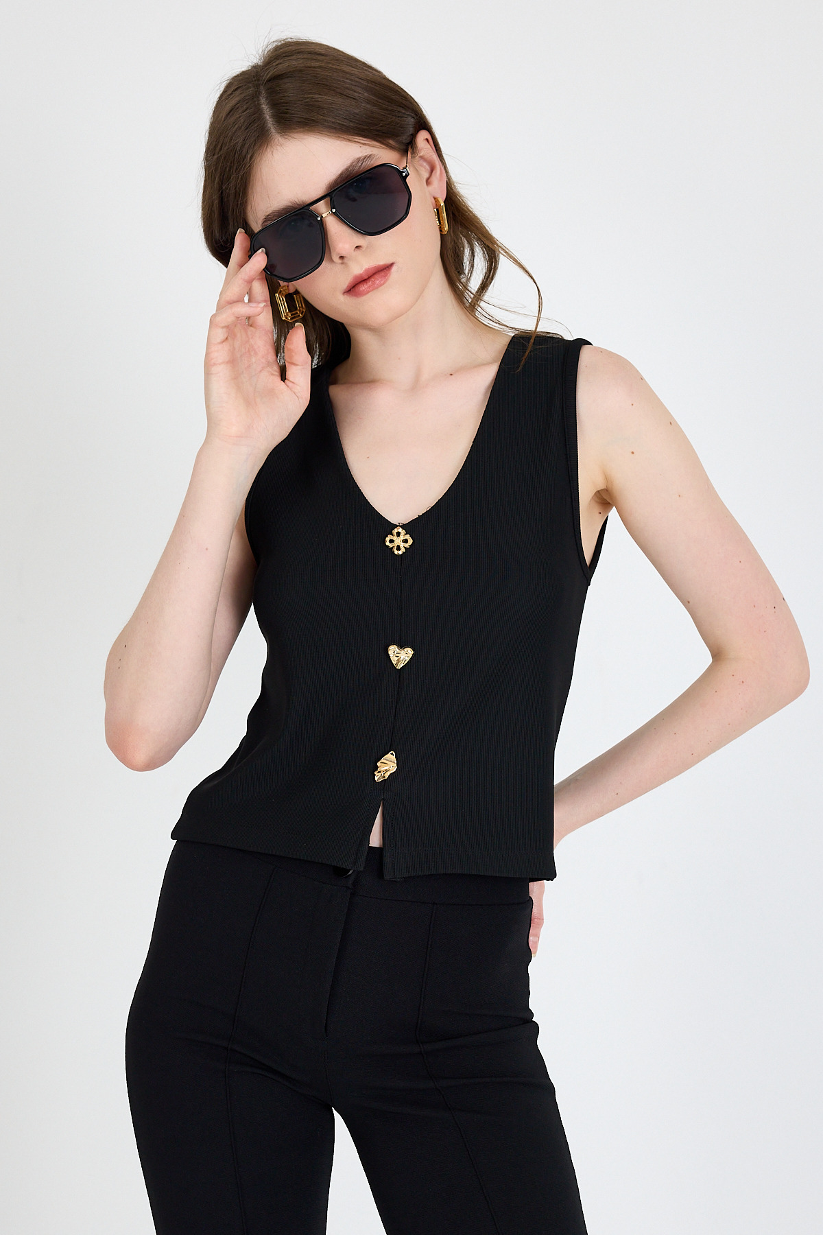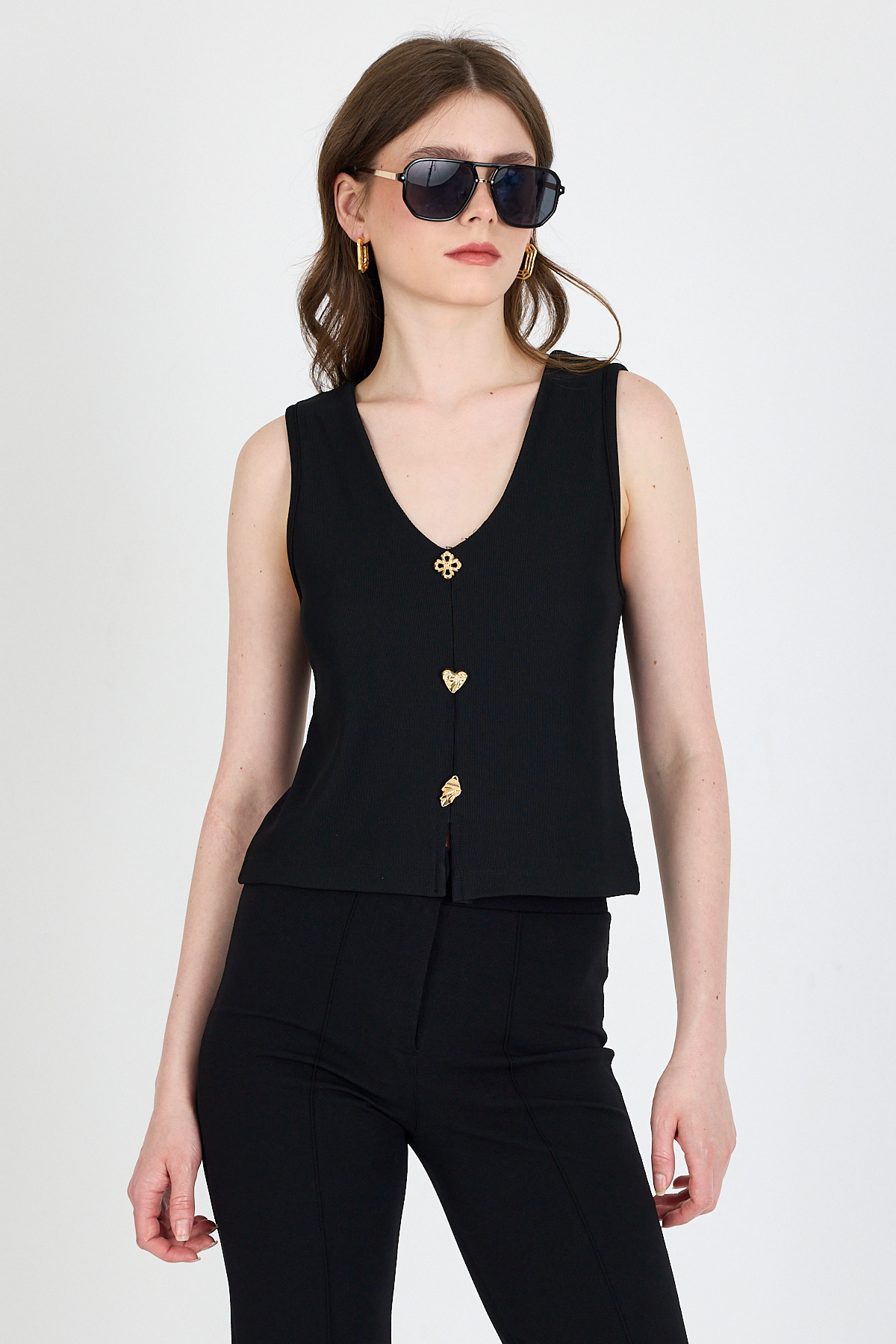 Siyah V Yaka Düğmeli Kolsuz Bluz 019